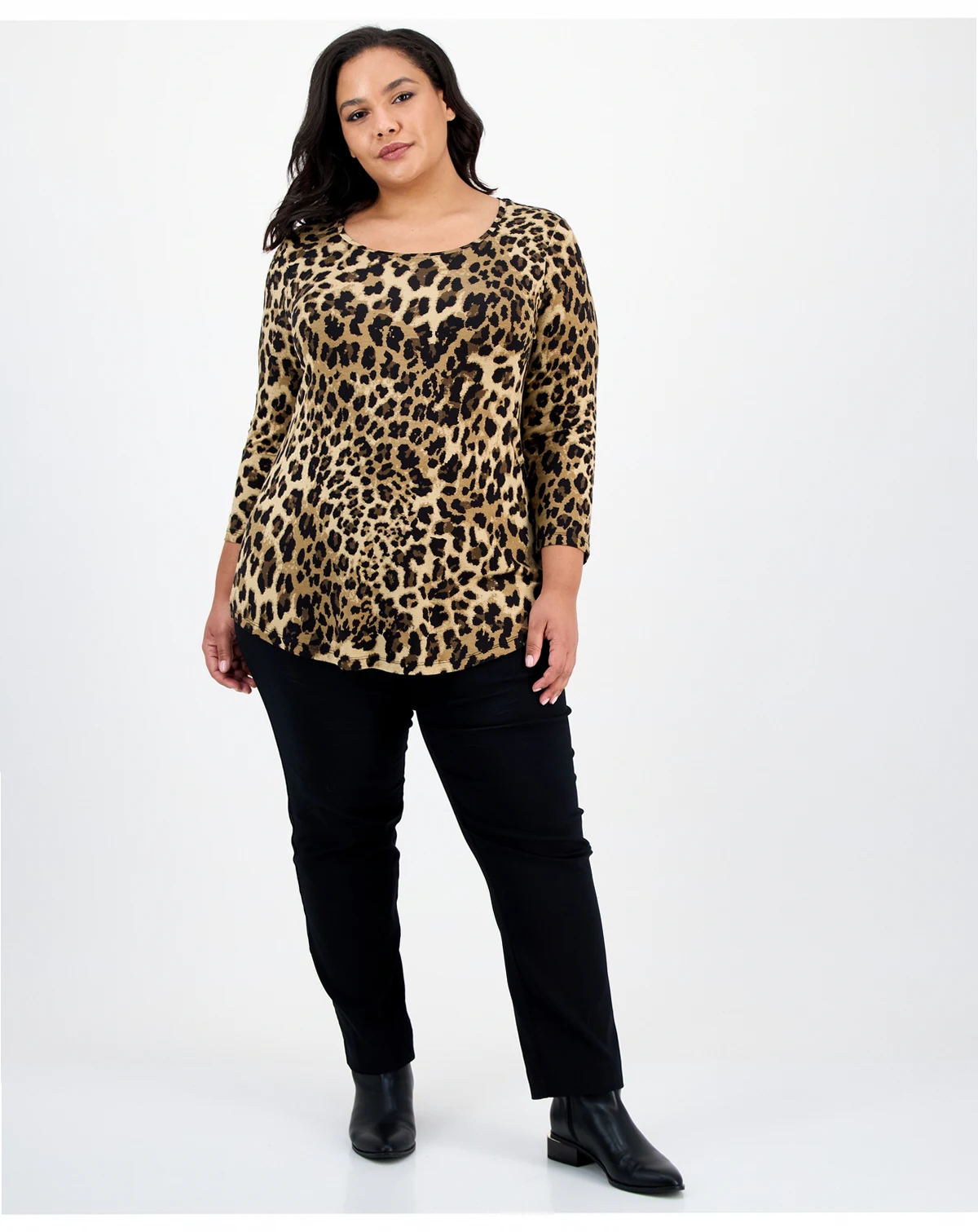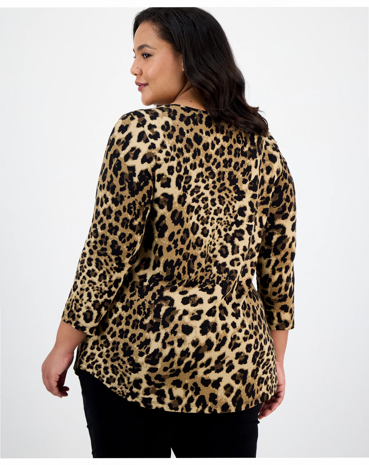 A bold print updates a wardrobe favorite with JM Collection's versatile plus size pullover top finished with a shirttail hem for flattering coverage.