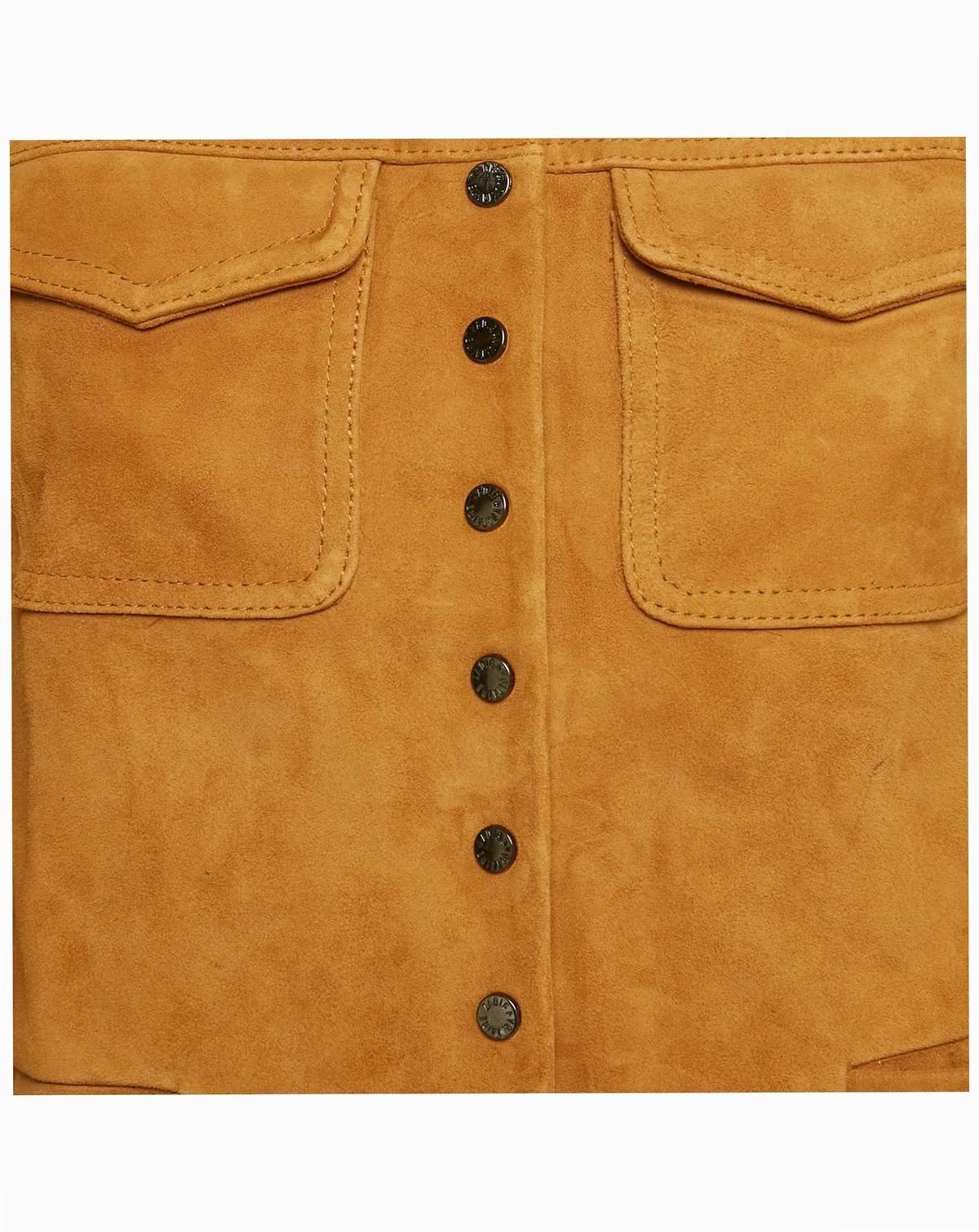 A suede jacket from the house of Zadig and Voltaire comes in a rich brown that wears well with just about anything. The round neck keeps the cut clean while front pockets and a row of dark buttons give it a utility edge. A designer jacket for women that feels relaxed and cozy easy to throw over denim or dresses when the air turns crisp.