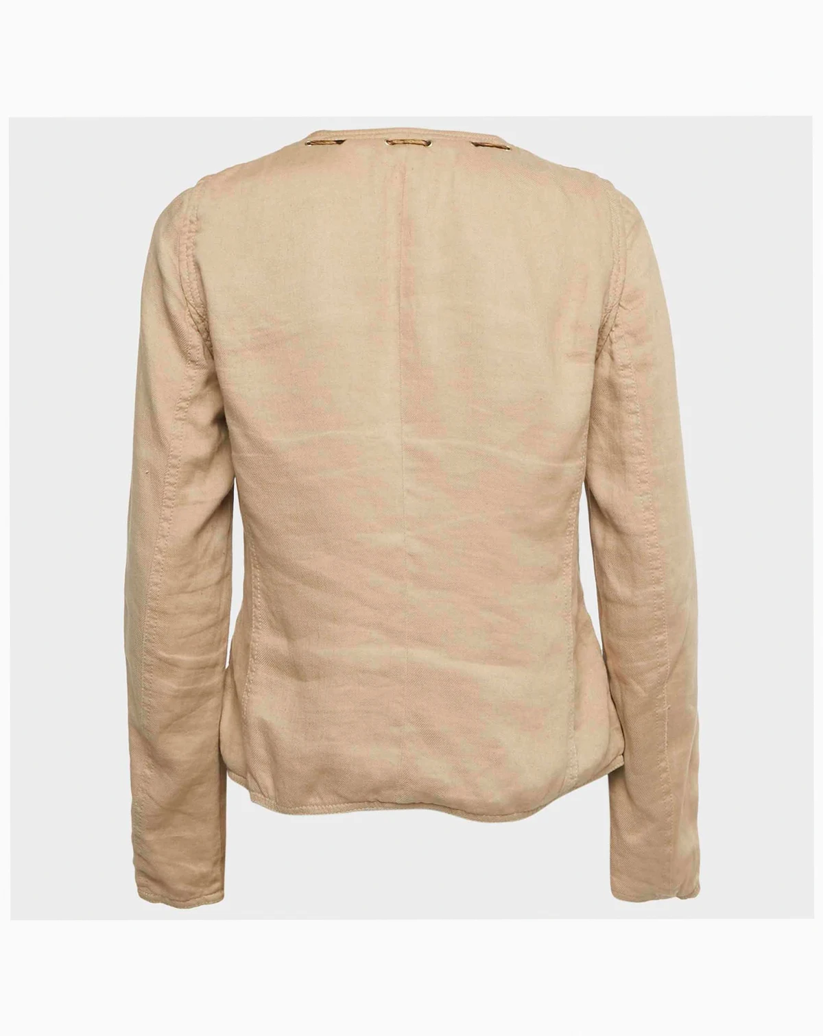 Soft pleating along the neckline lends a refined touch to this beige Roberto Cavalli jacket finished with a gold tone zip and matching crest detailed buttons at the pockets. Crafted from a lightweight linen blend it s an easy layer with subtle statement appeal.