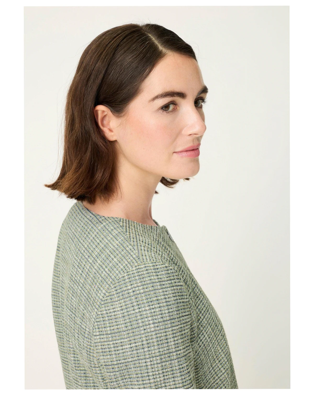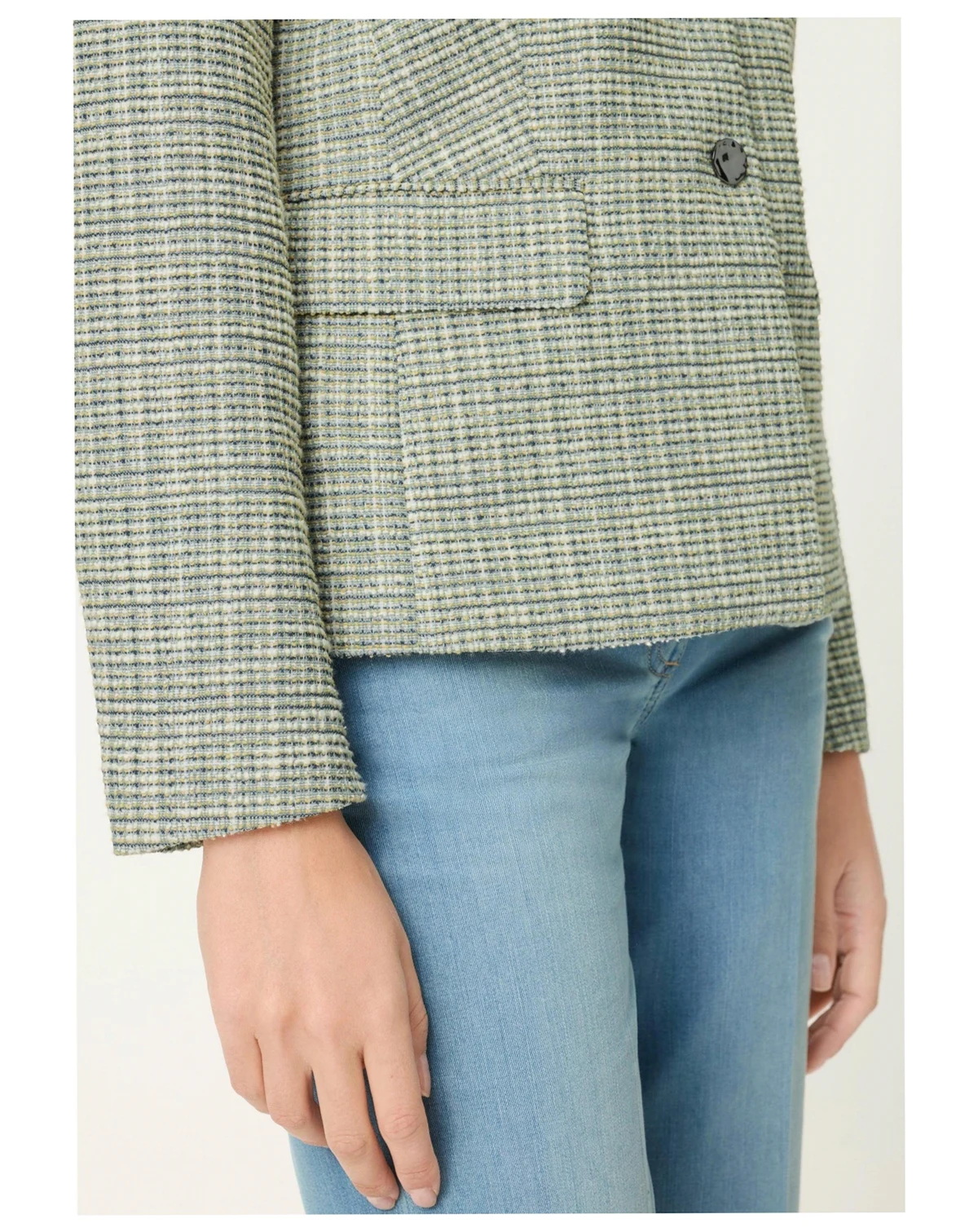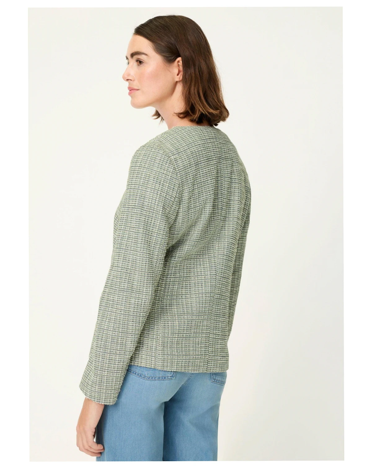 A polished wardrobe staple, this fashionable jacket elevates everyday dressing with its refined round neckline, textured fabric, and elegant pewter-tone hammered buttons.