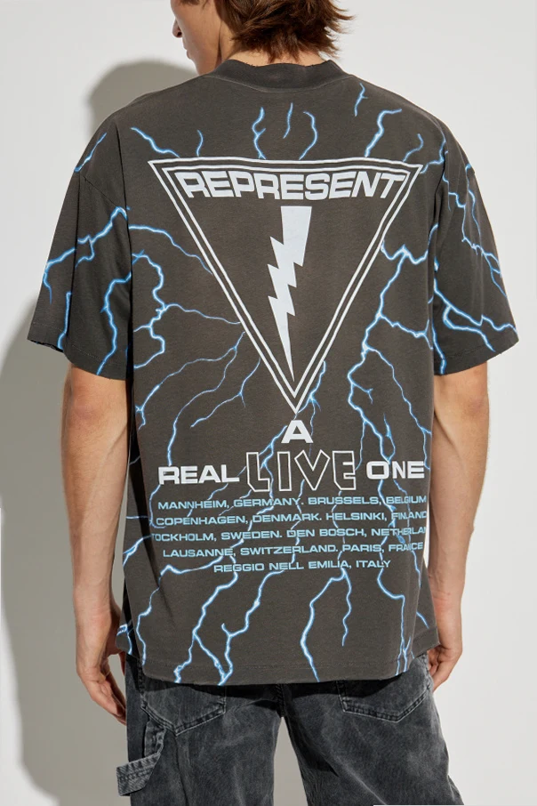 Distinctive details abound: a custom label at the hem signifies authenticity with “EST. 1975 BY REPRESENT.” The reverse displays a statement triangle motif, lightning bolt, and select city names—a homage to mythical concert journeys. This T-shirt is a unique convergence of music legacy and sophisticated craftsmanship, perfectly tailored for the discerning connoisseur.