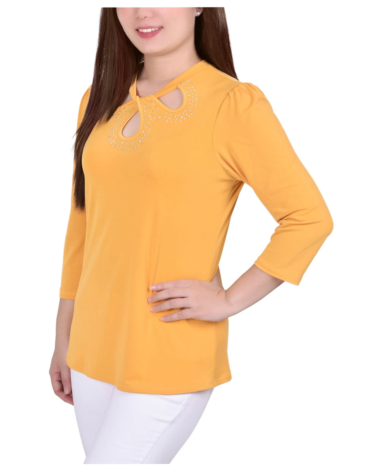 You'll stand out in a crowd in this studded twist neck cutout crepe pullover from NY Collection.