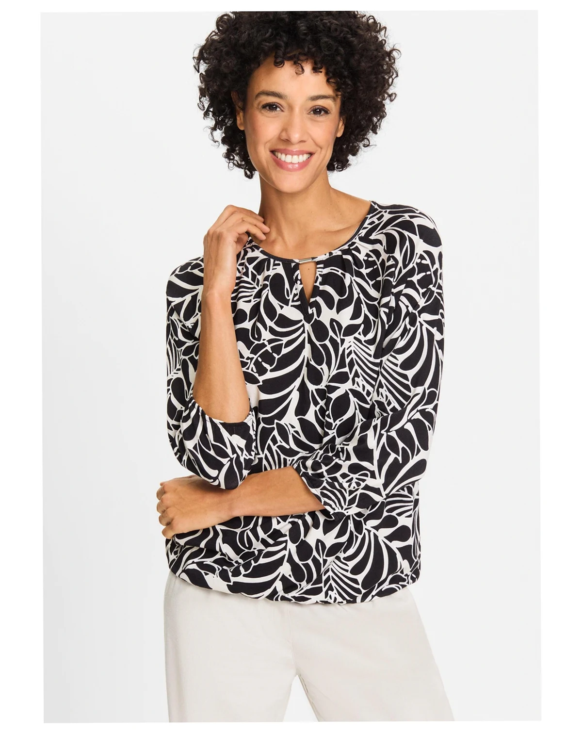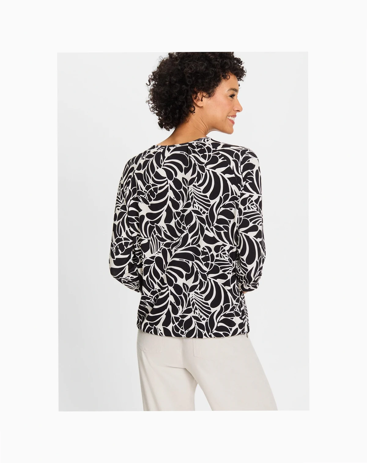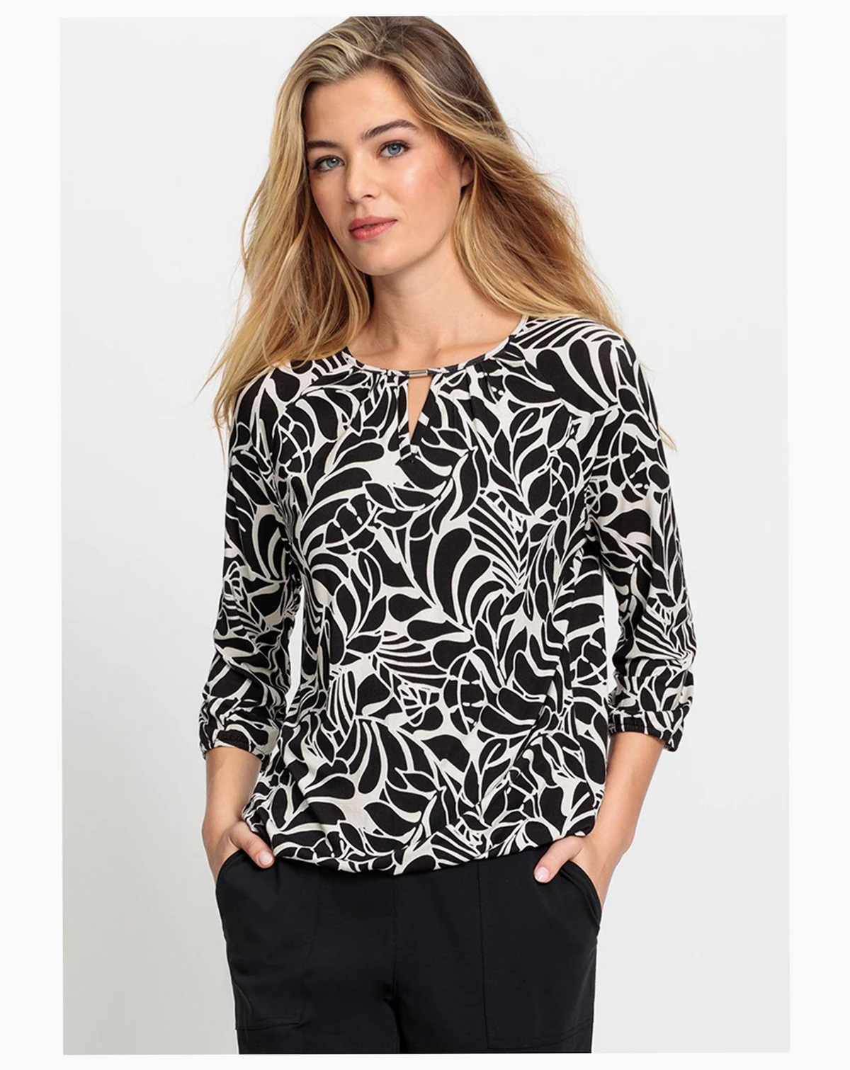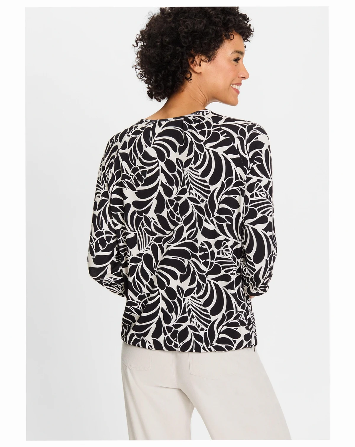 Lightweight with a lovely drape, it features 3/4 raglan sleeves finished with elastic and an elasticized hem for a comfortable fit.; In our loose and relaxed Clara fit, it has a banded hem for added comfort.