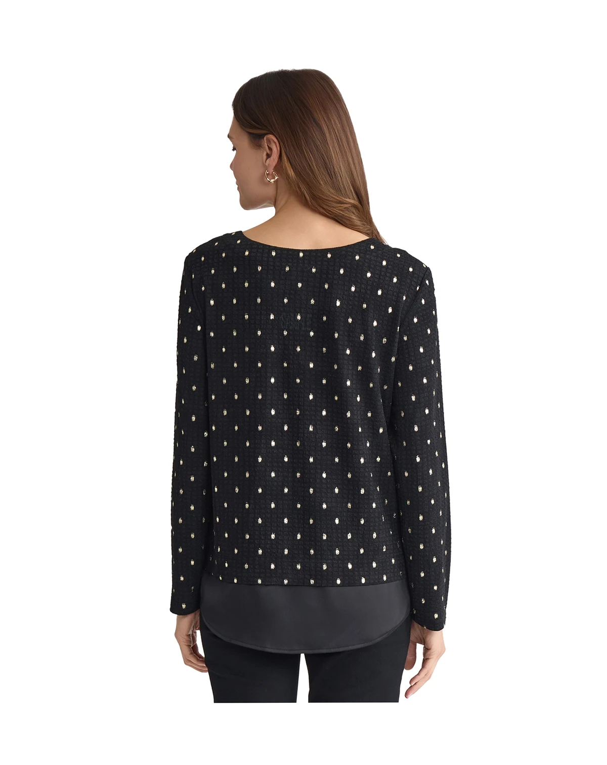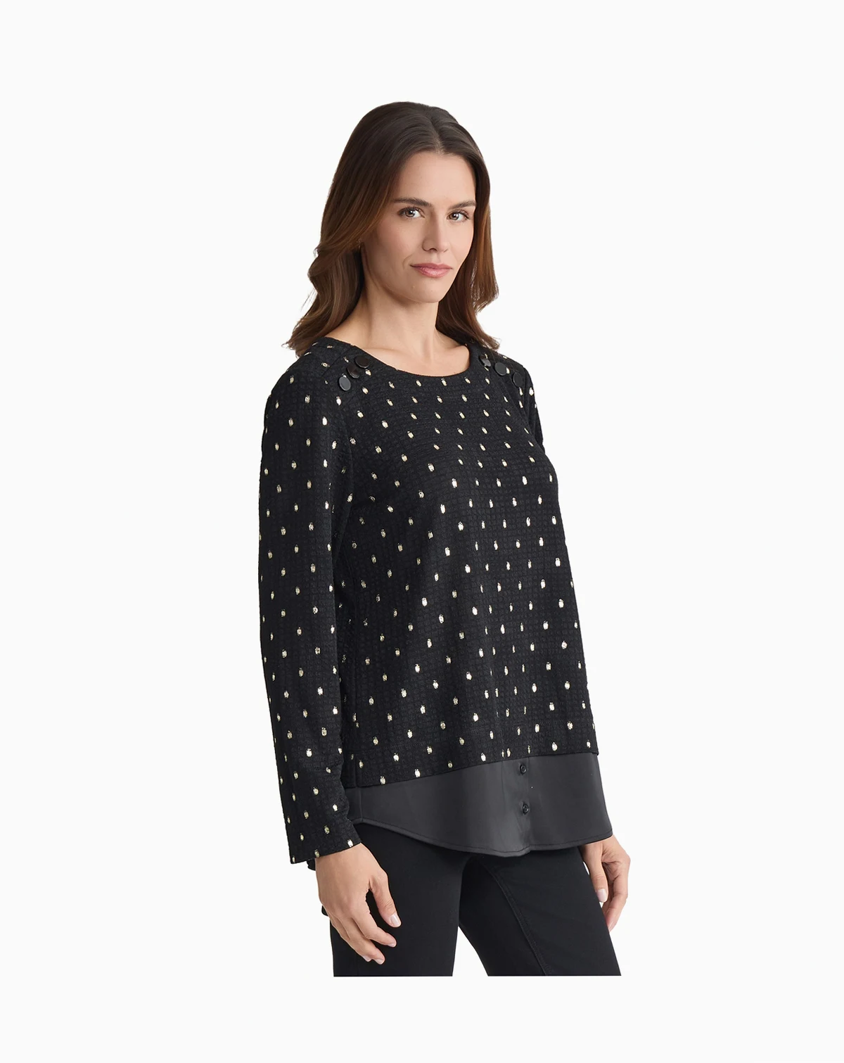 Jones New York amps up the textural interest in your look with this chic long-sleeve top, a cozy dot textured knit accented with a contrasting solid hem and fun shoulder buttons.
