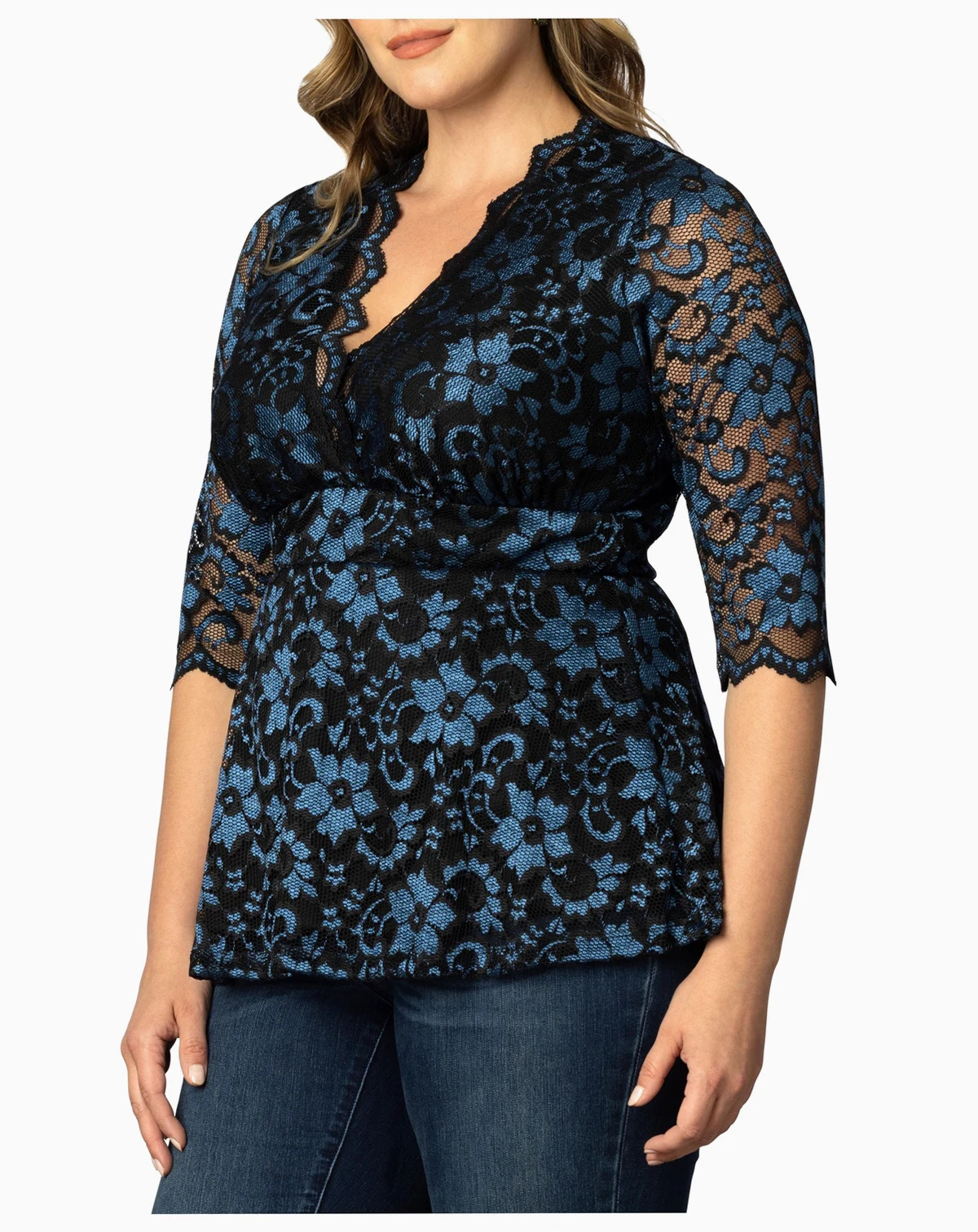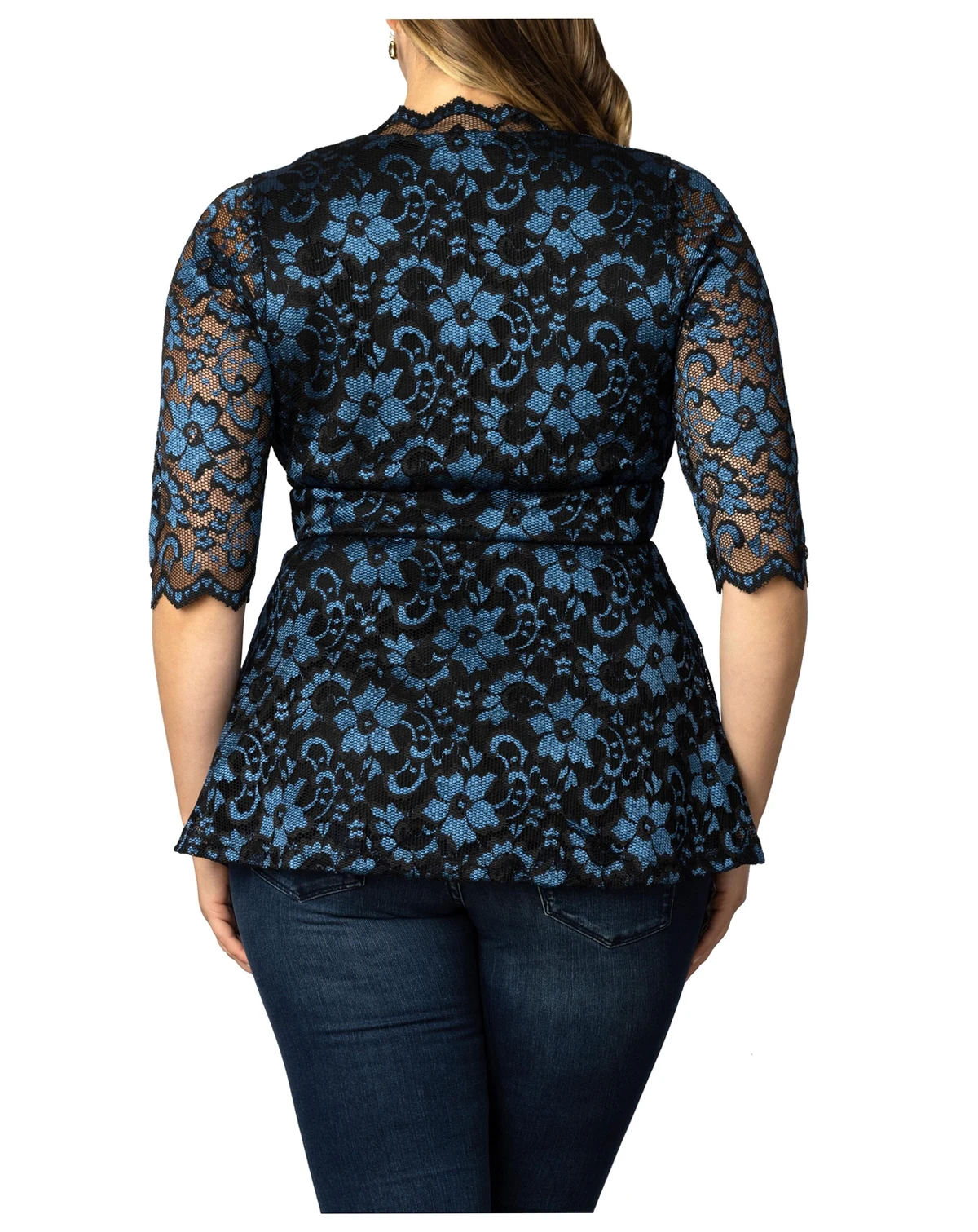 The Luxe Lace Top is sure to be a stunning addition to your wardrobe. Immerse yourself in exquisite details such as a delicate scalloped neckline and shimmery two-tone lace. A flattering peplum detail enhances your curves.