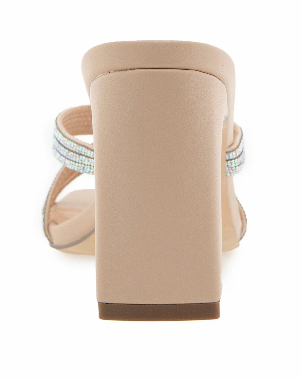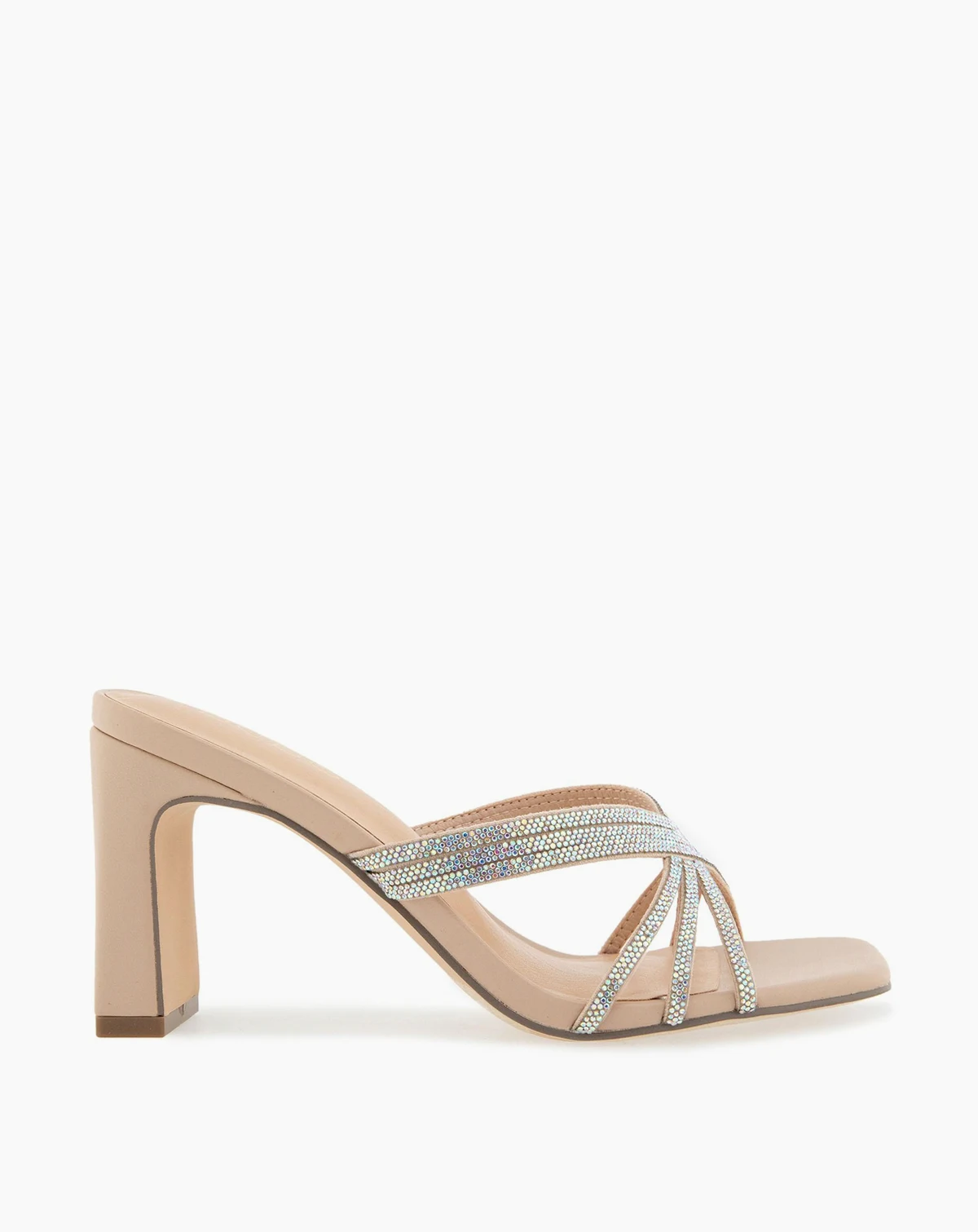The BCBG Fanny dazzels with criss-cross bands adorned in sparkling rhinestones and a confident block heel, creating a glamorous sandal that shines with every step.