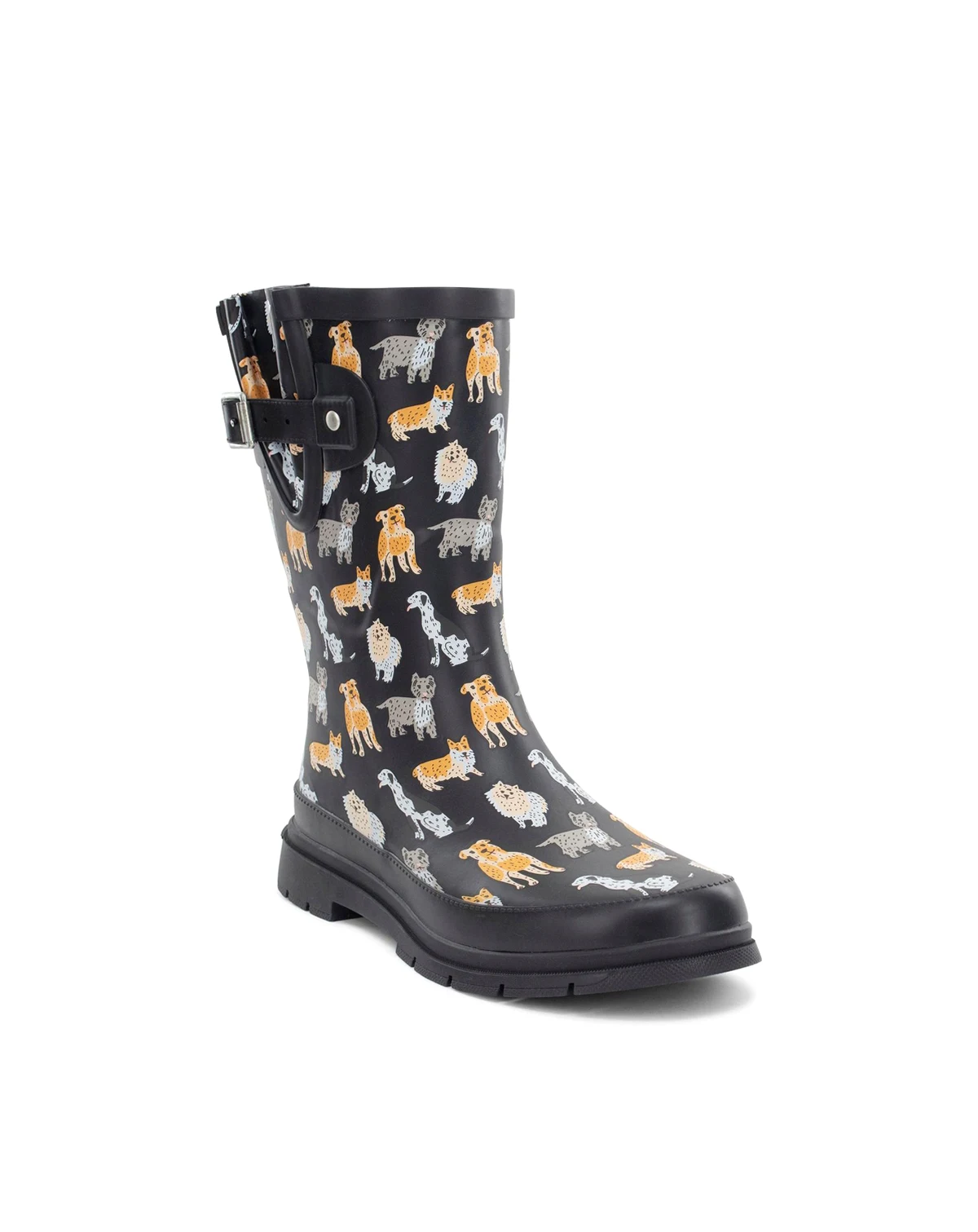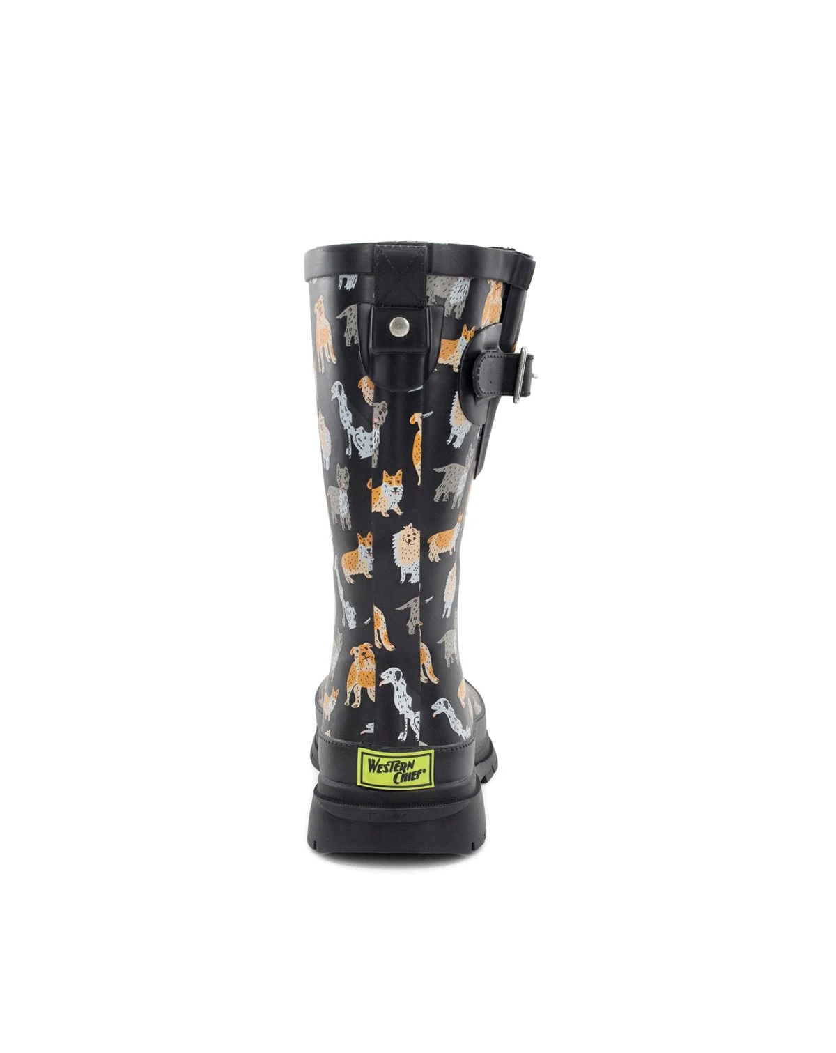 Add a playful touch to rainy days with the Dog Pack Mid Rain Boot by Western Chief. Made with waterproof high-quality rubber, this mid-height boot keeps feet dry while showing off a fun dog-themed print. The boot is lined with a soft polyester/cotton blend for breathable comfort and includes a removable EVA insole for cushioning. A lateral gusset with adjustable buckle ensures a flexible calf fit, while the heel loop and kick plate make it easy to pull on and off. Finished with a rubber lug outsole for added traction in wet weather.