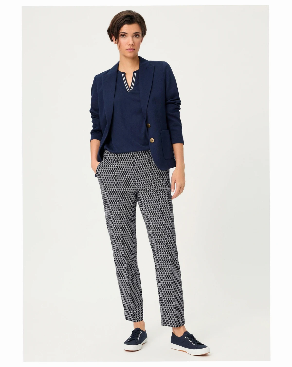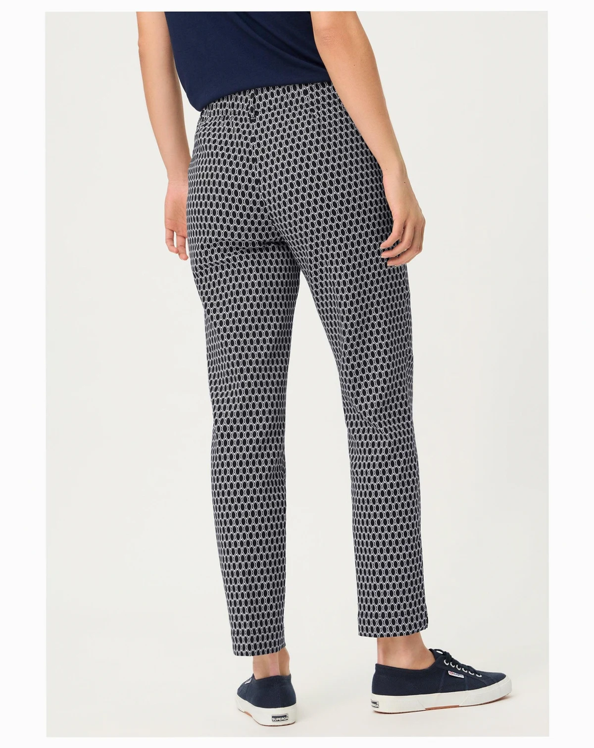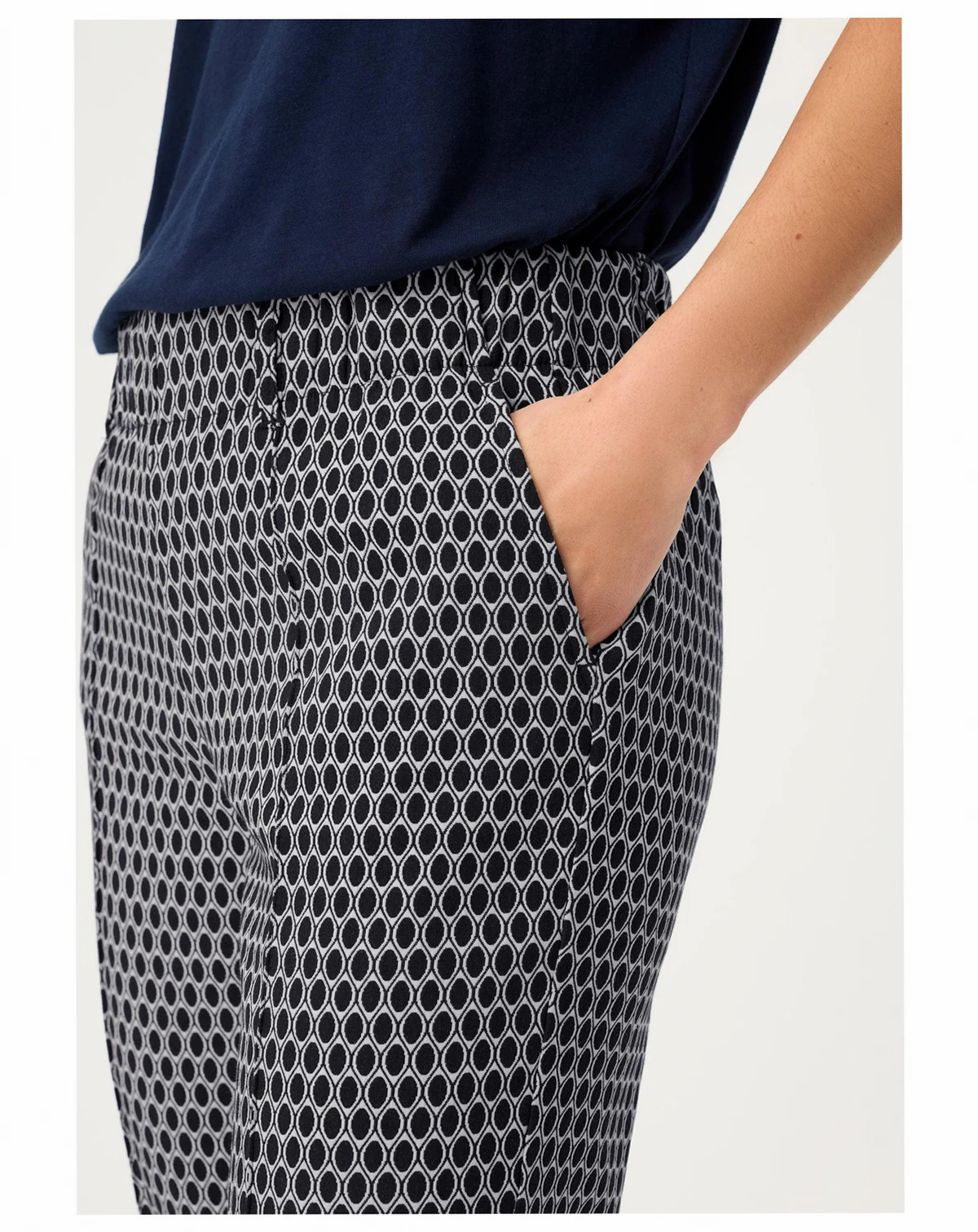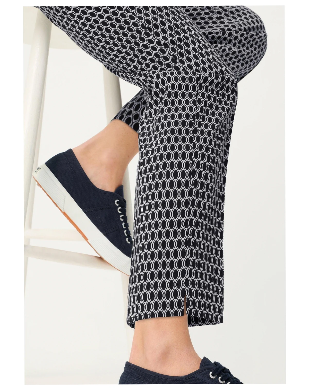 73% Cotton, 23% Polyester, 4% Elastane; Crafted from a lightweight stretch cotton blend with excellent shape retention, they re finished with a vertical leg crease, feminine side slits at the hem, an all-over geo print, and a cropped length. Approx. inseam : 28 inches.