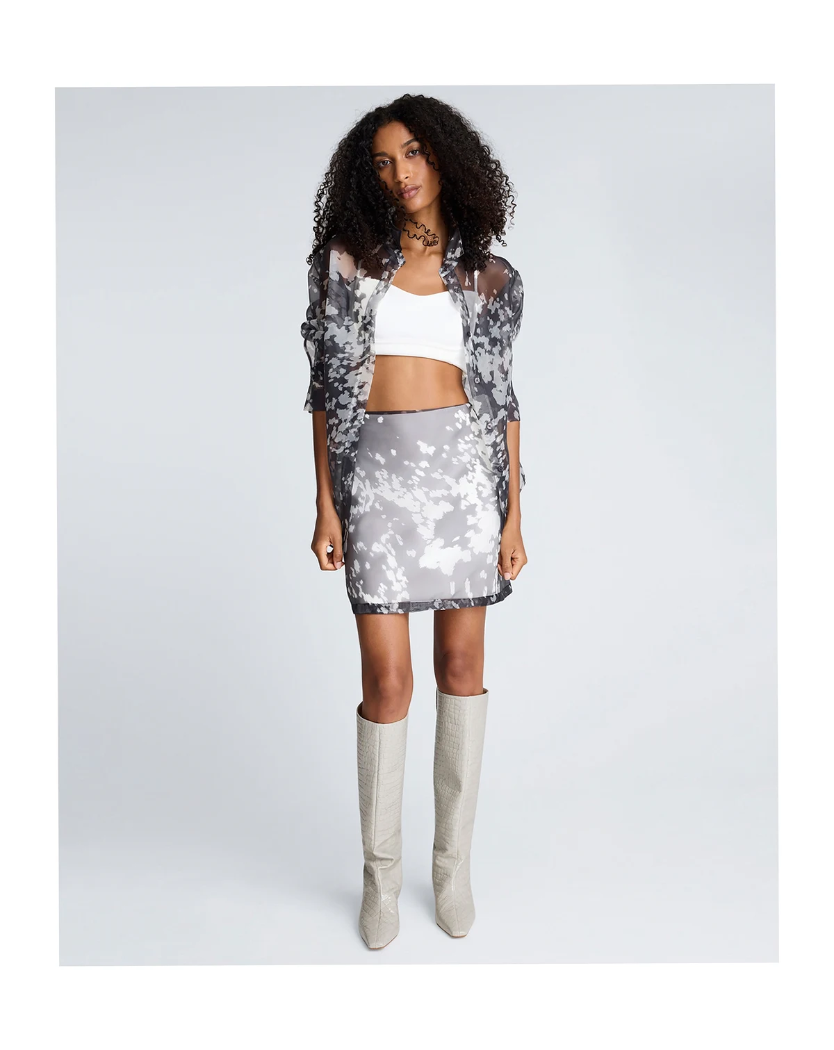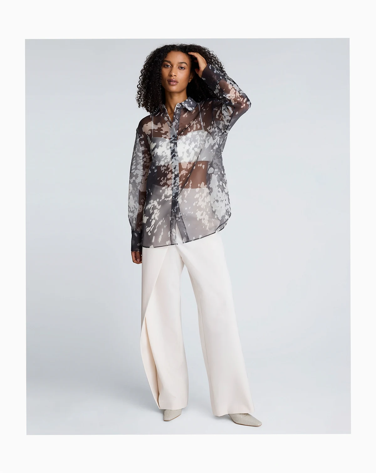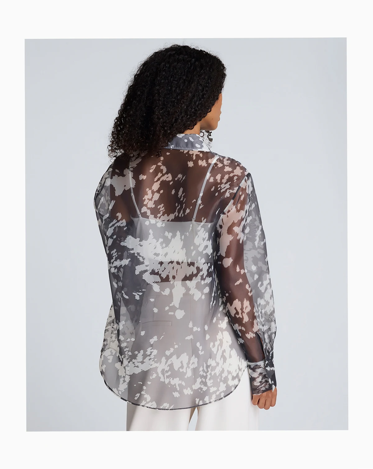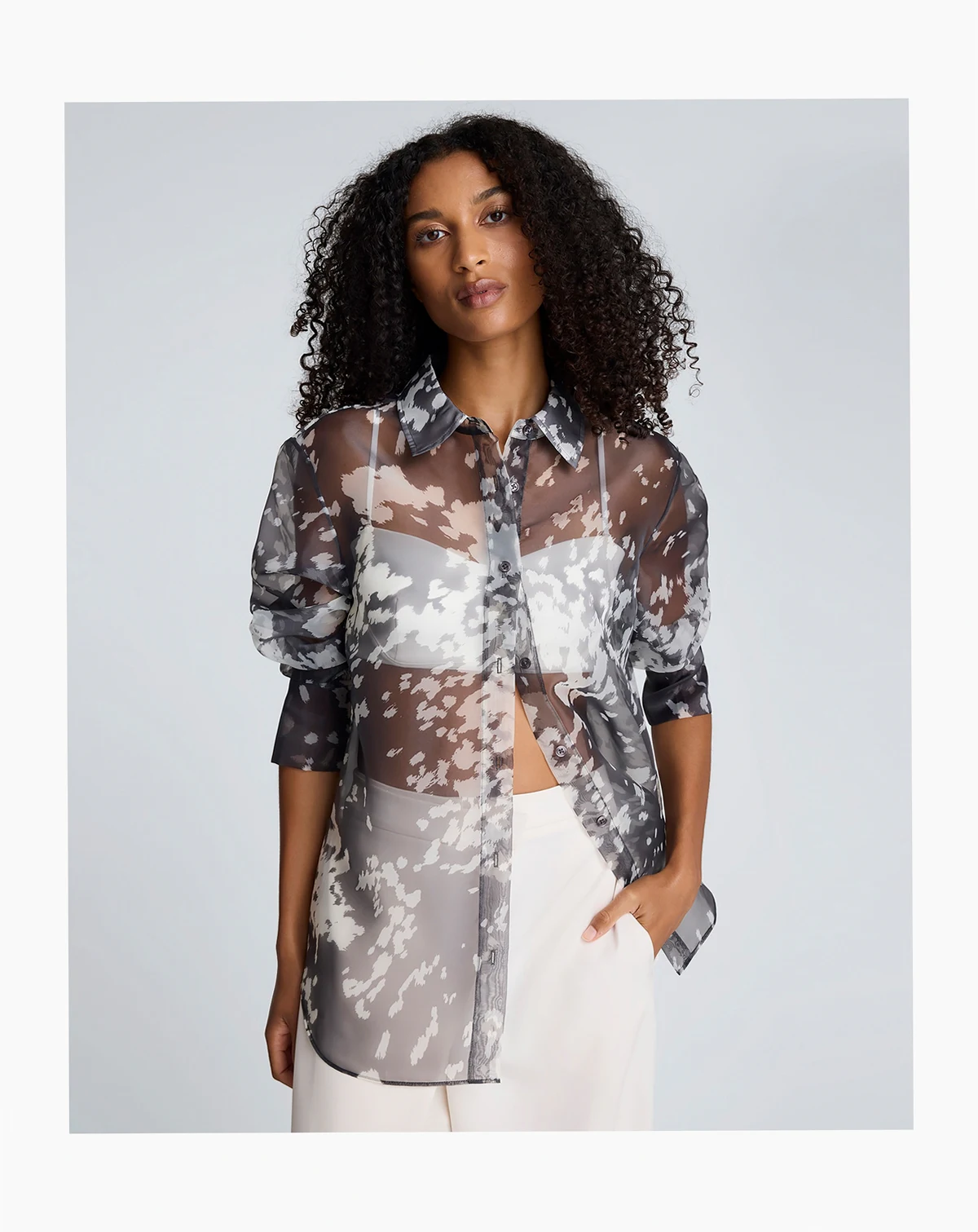 Sheer and lightweight with a bold print, this Kenneth Cole shirt features an oversized fit and long sleeves for a modern layered look. The button-front design offers versatility and contemporary style.