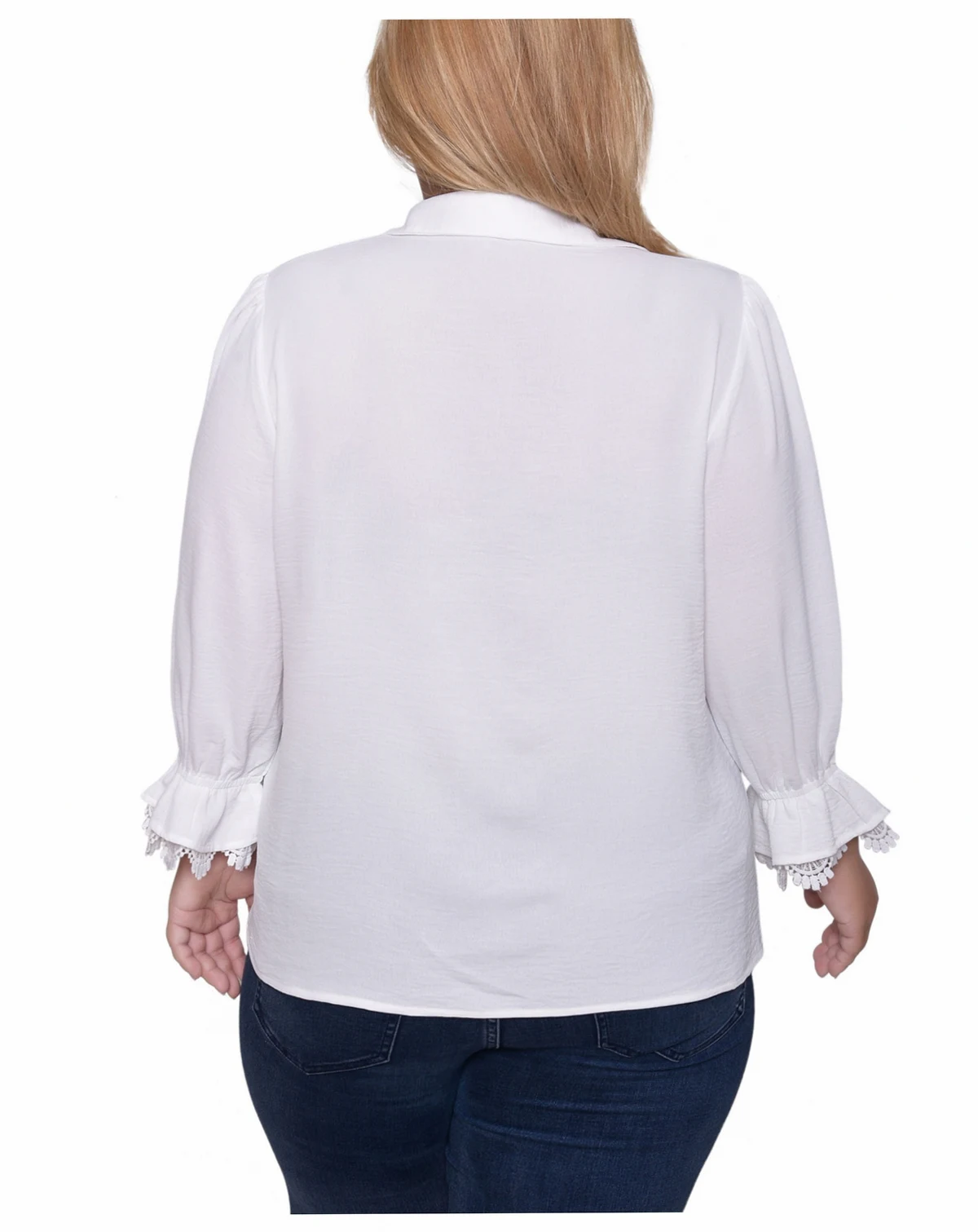 Feminine and fresh, this crisp white blouse from NY Collection features delicate lace detailing across the bodice and sleeve cuffs. A classic collar and button-down front add polish.