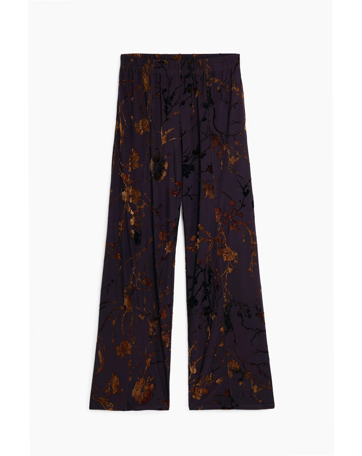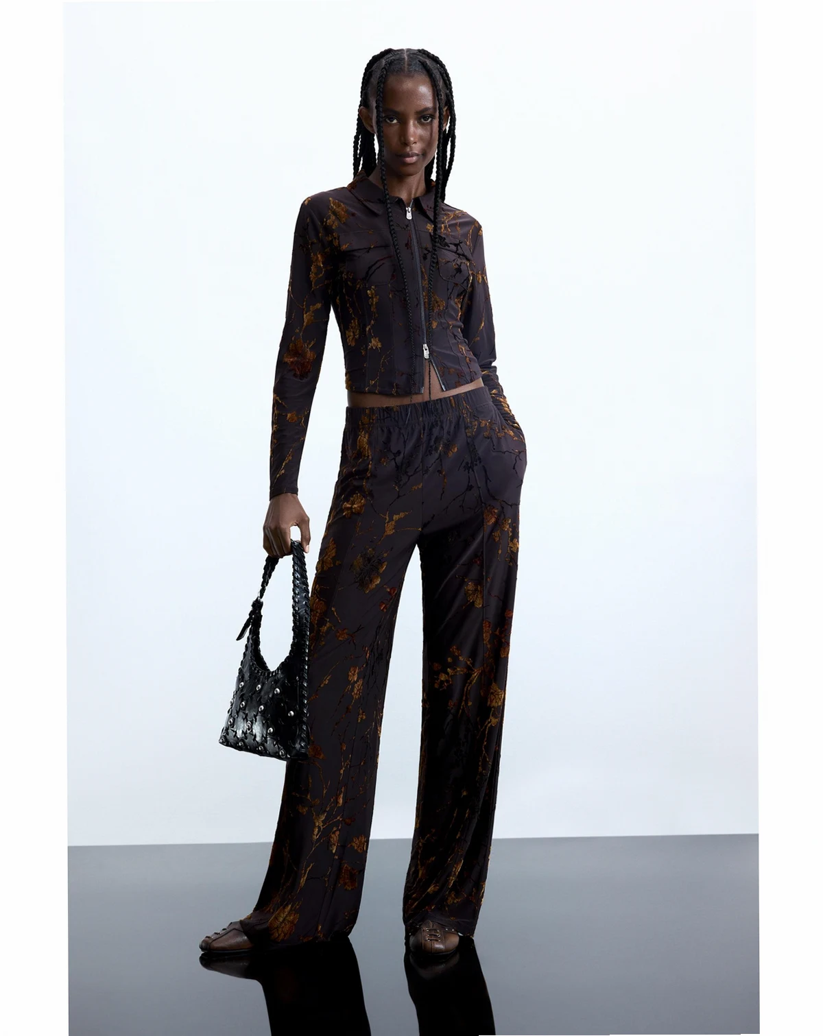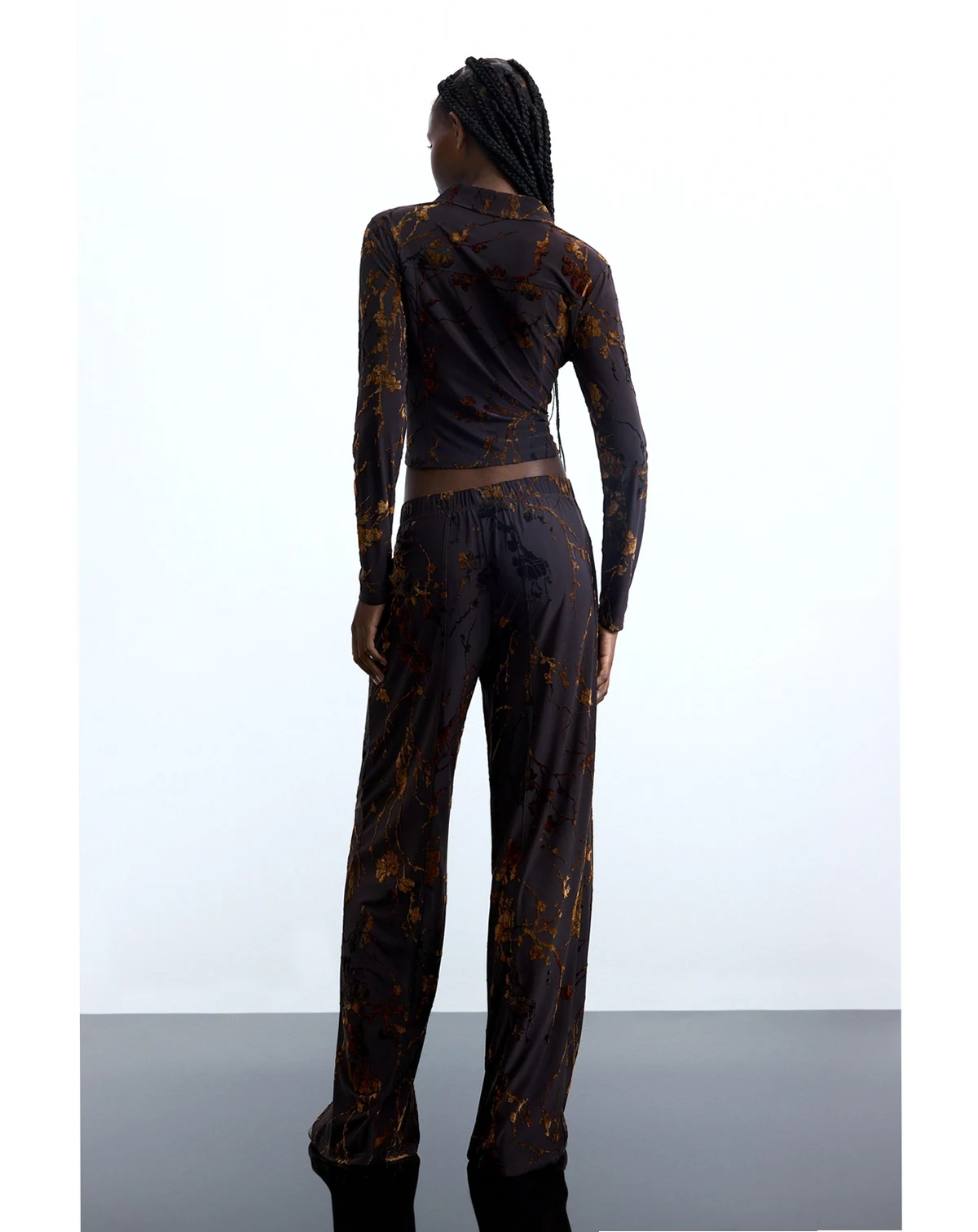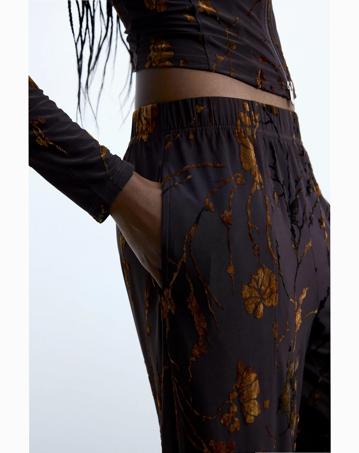 Long knit trousers with flocked fabric in brown and fabric that combines polyester and elastane. Elastic waistband and straight cut.