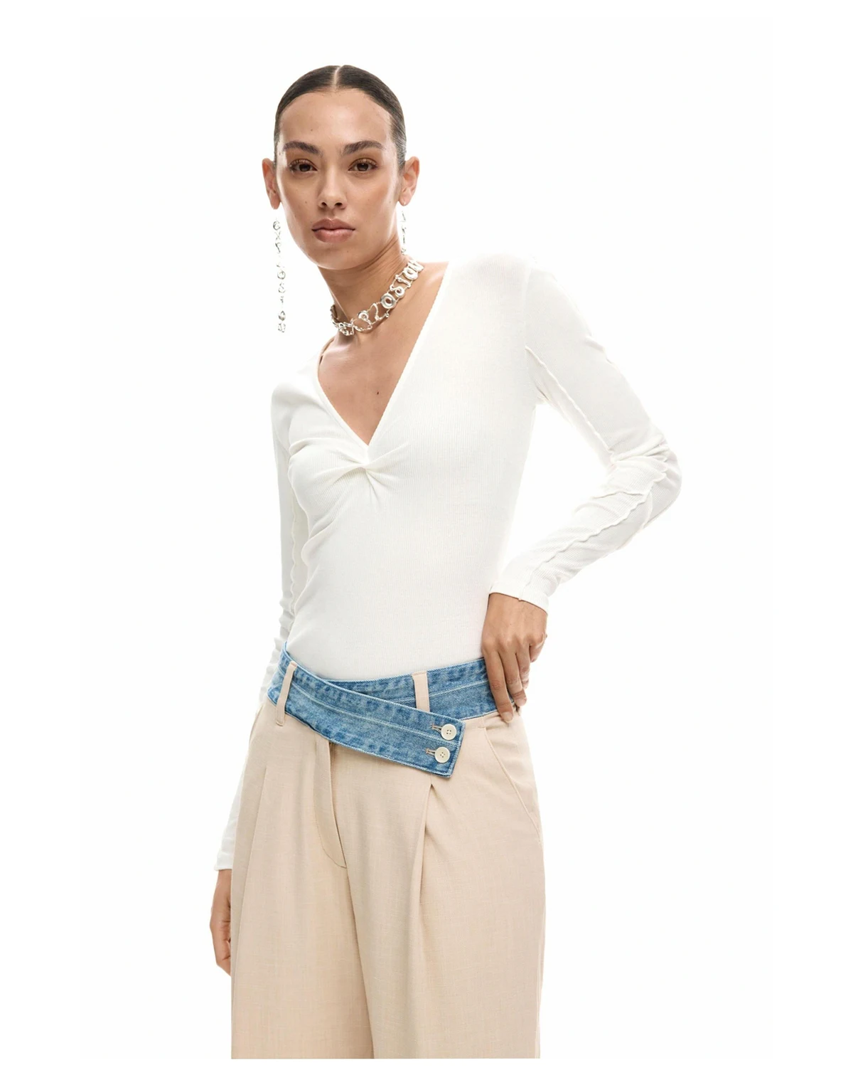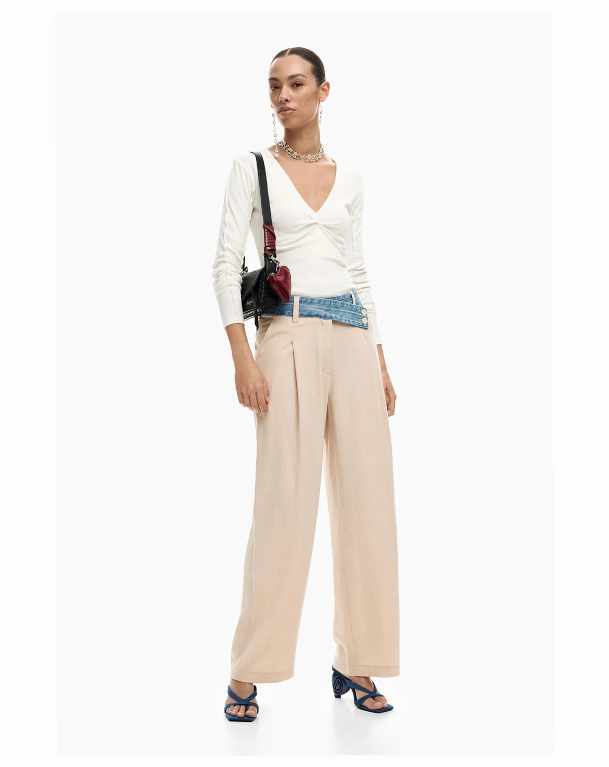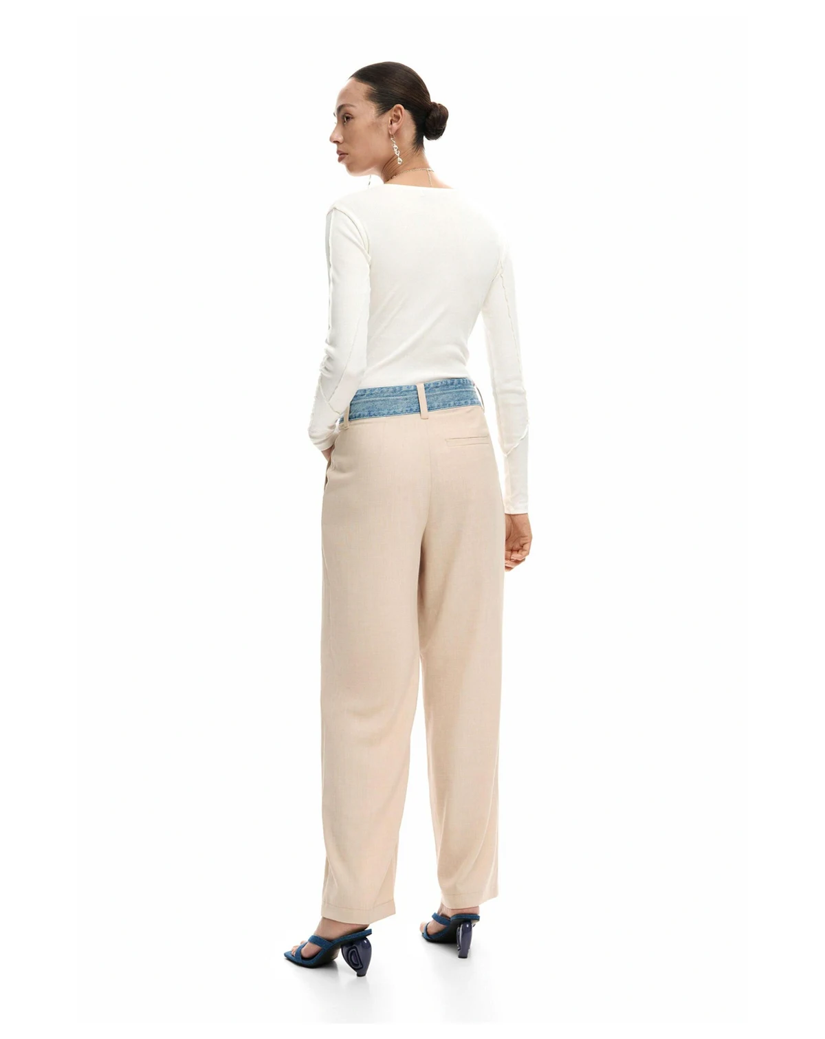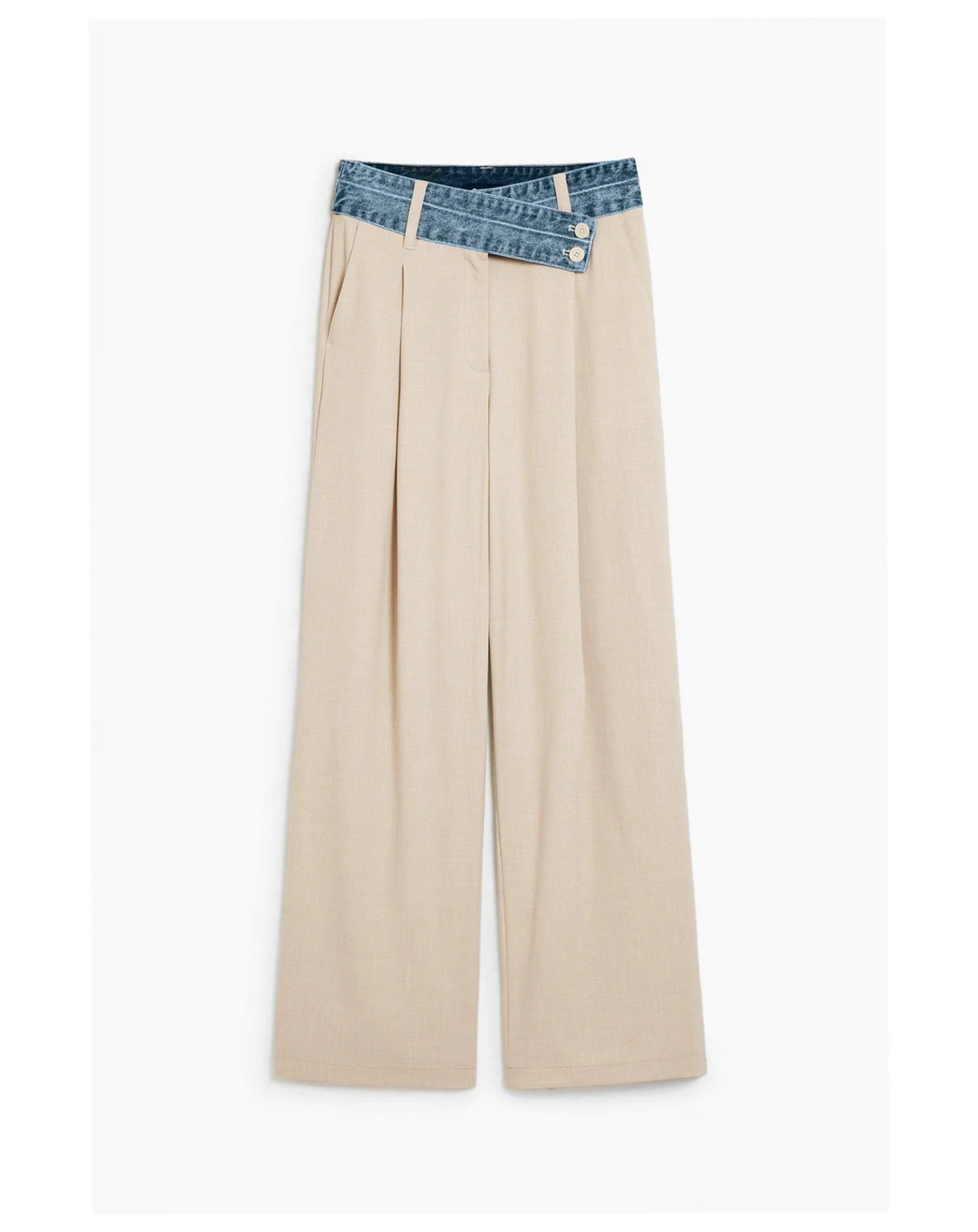 Straight pleated trousers in fluid fabric, with denim fabric details at the waist.