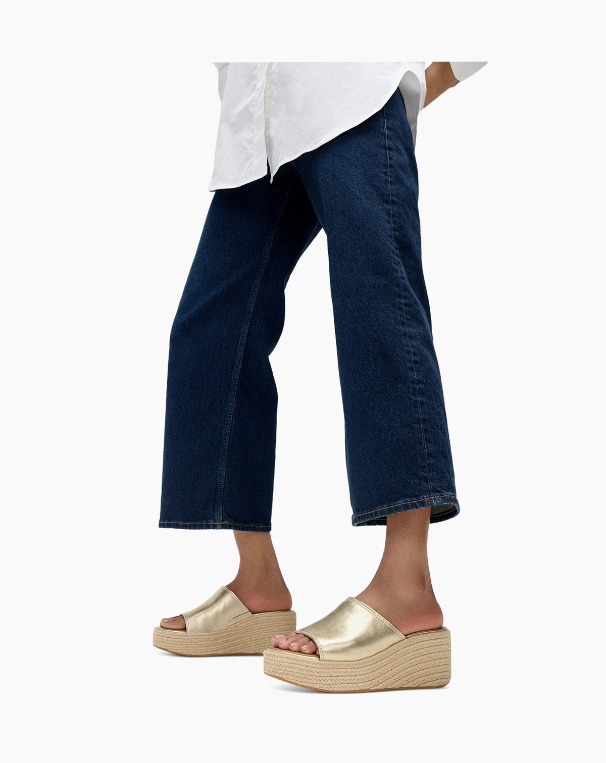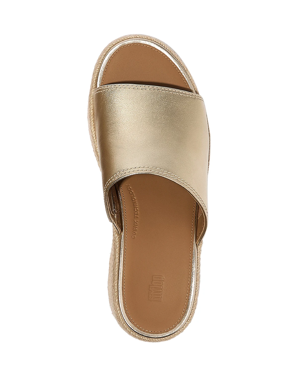 Glamorous and comfortable, these FitFlop women's slides are crafted in shimmering metallic leather with a chic espadrille-inspired wedge wrapped in natural jute. Featuring leather footbeds, generous coverage, and FitFlop's CushX™ midsole, they are designed for sneaker-like comfort in a heeled style.