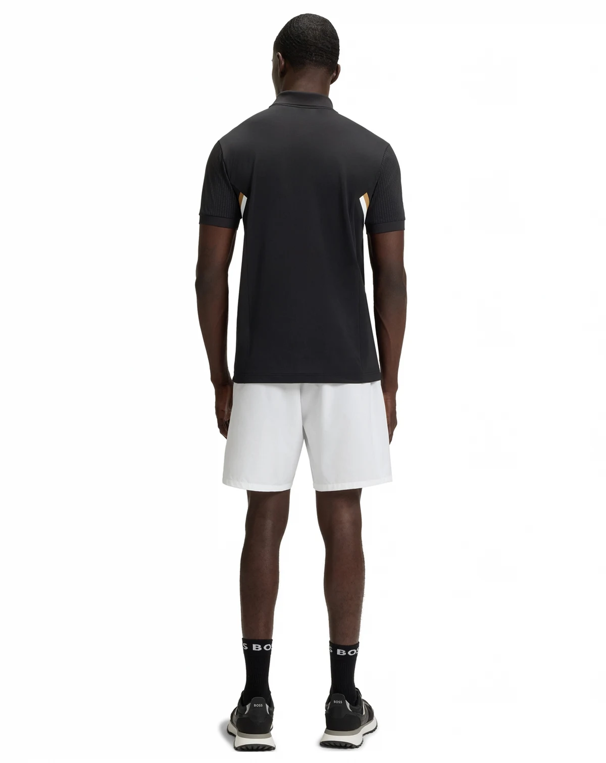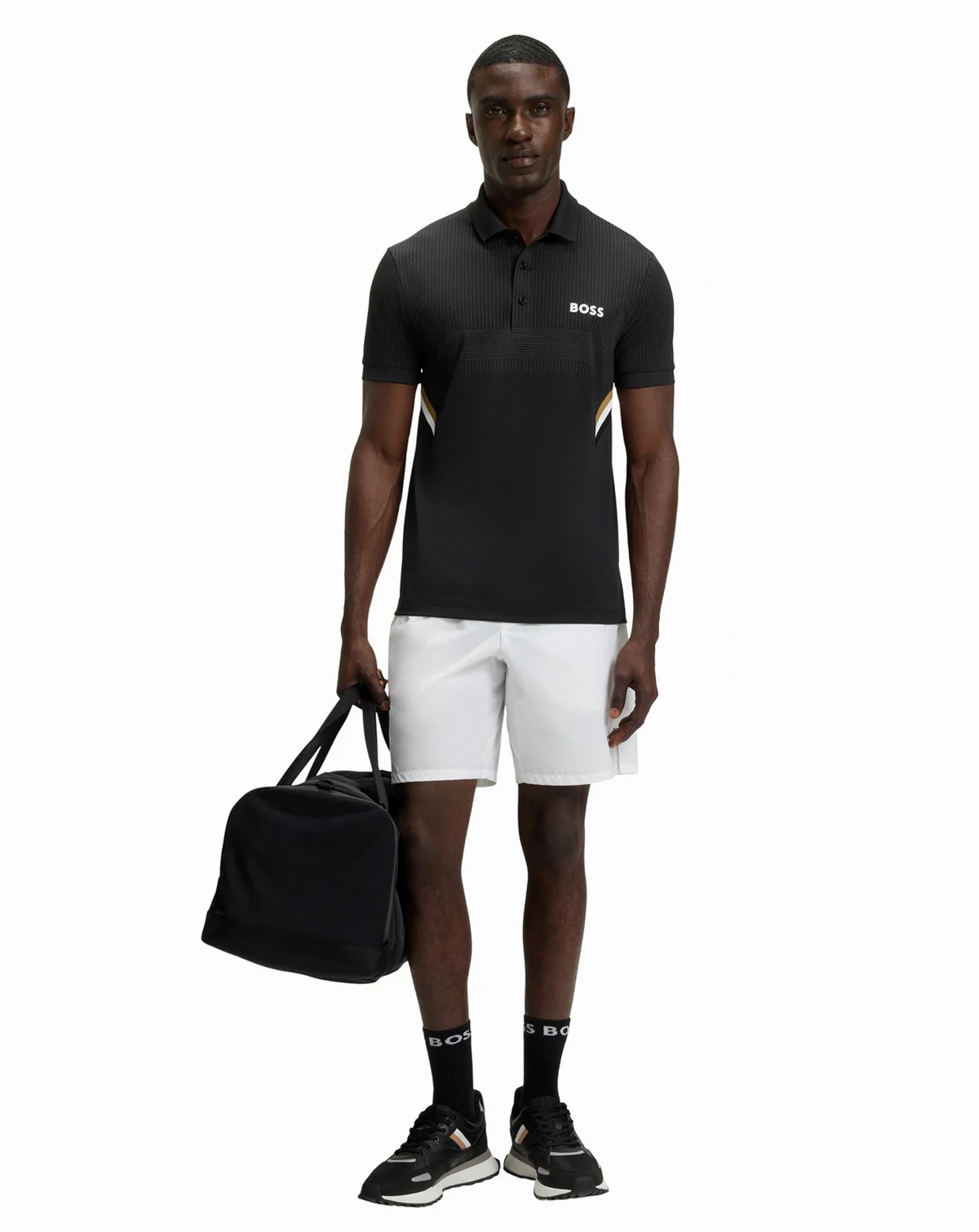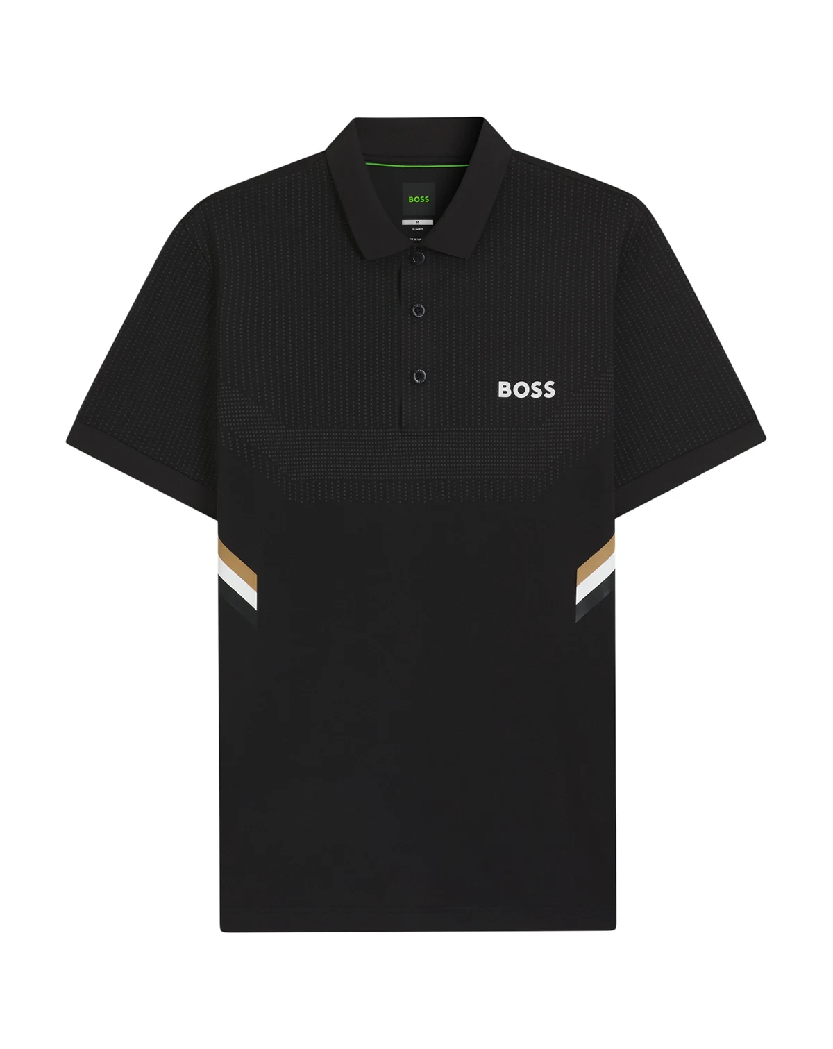In a slim fit, this quick-dry BOSS Men's wear polo shirt offers dependable moisture management and odor control. Large logo and printed artwork. UV protection.