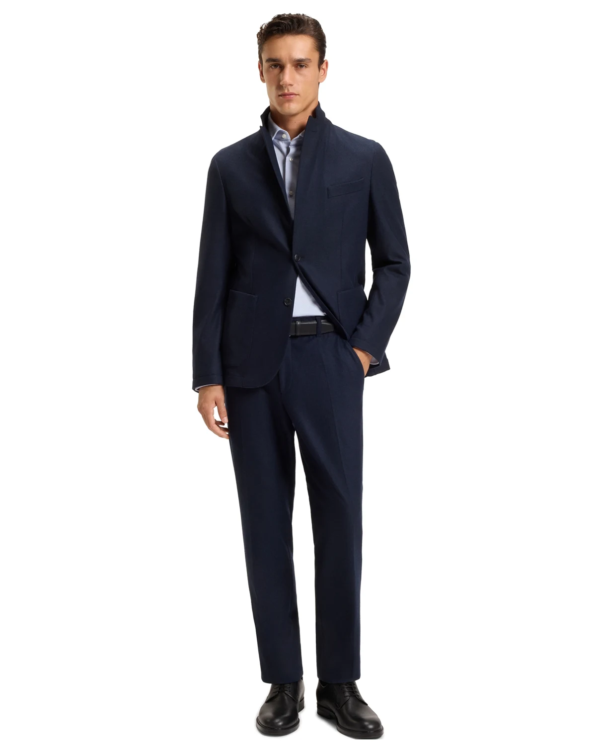 The model wears a size 15.5 and is 6' 2" tall, with a 37" chest, 29" waist and 35" hips; Slim fit