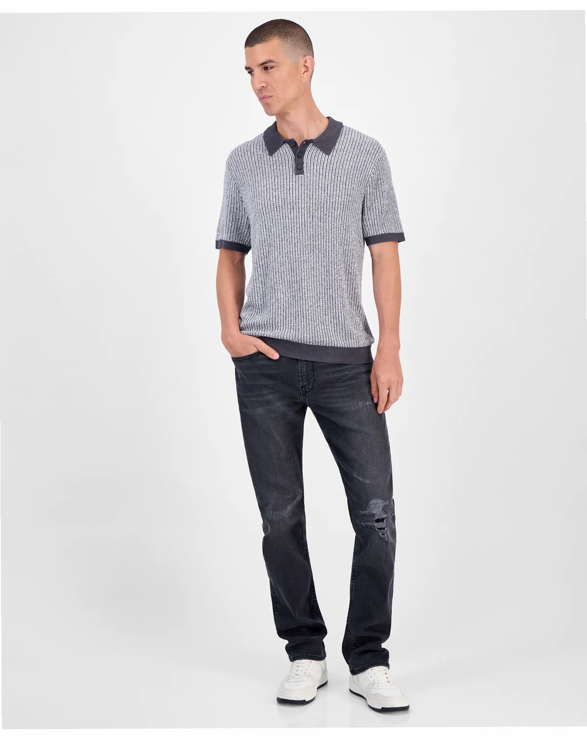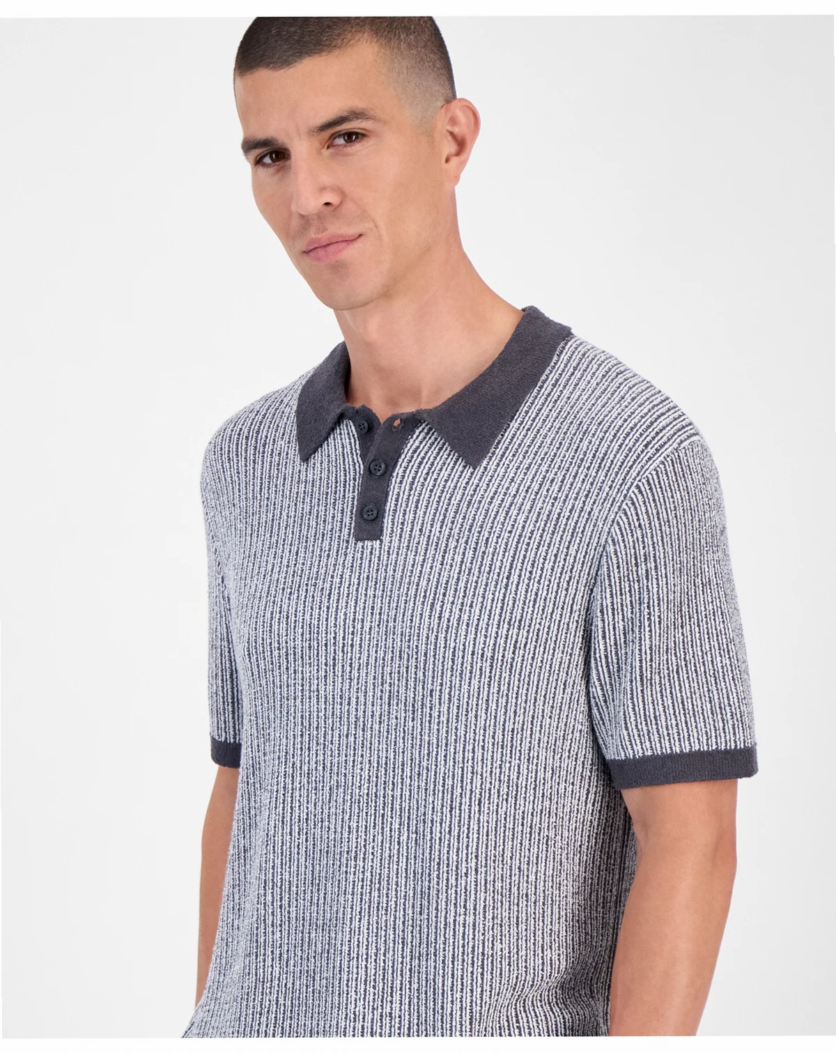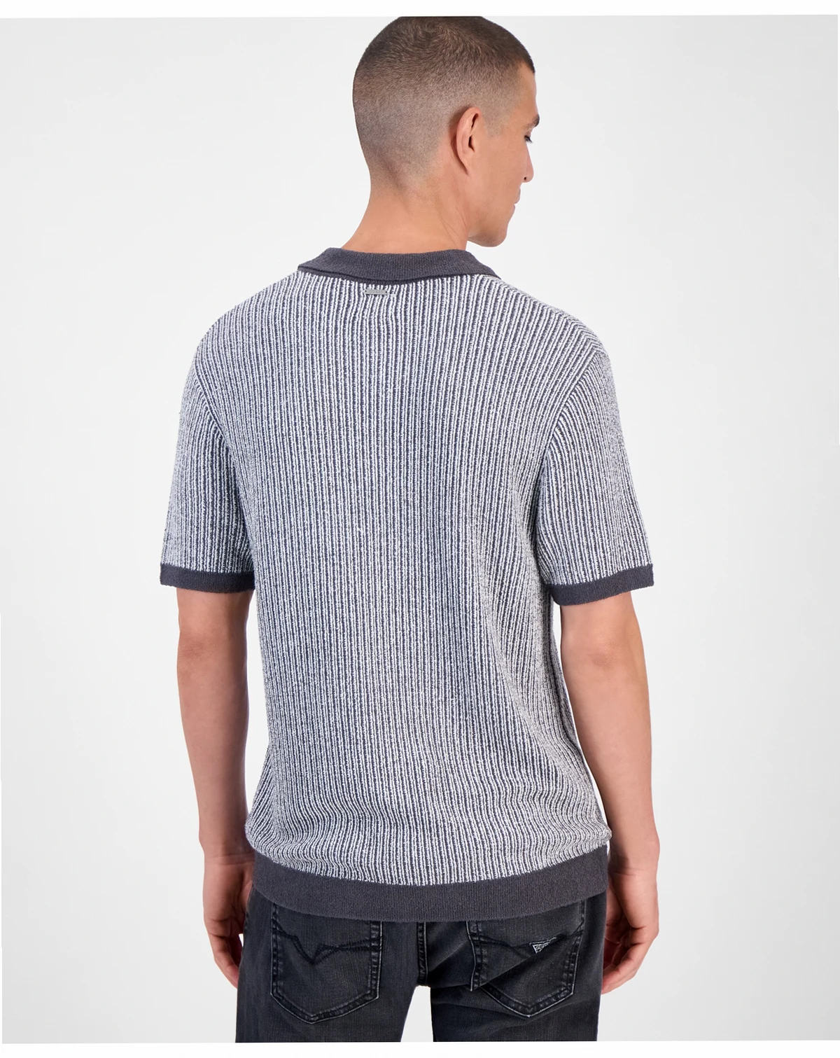 The Isaac polo from GUESS features an allover texture, polo collar, vertical-striped knit design, ribbed collar and trim details.