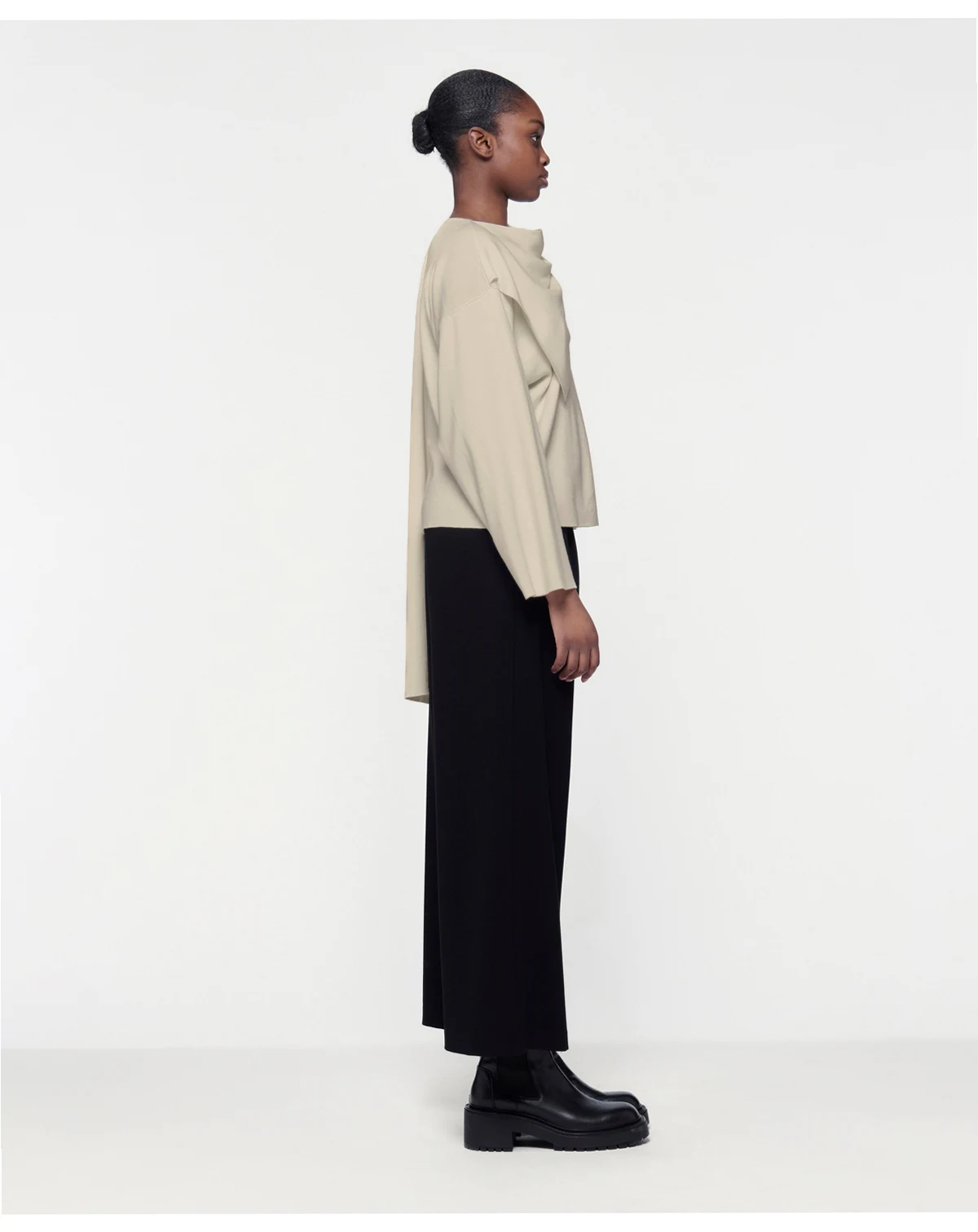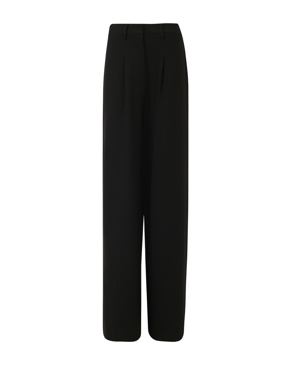 Regular fit, high-rise, wide-leg, structured waistband with belt loops, two side slip pockets, front pleats; True to size