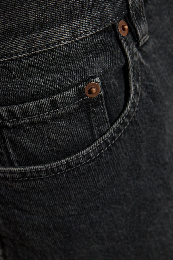 The distinctive deep anthracite hue, accented with subtle fading, lends a minimalist yet strikingly contemporary appeal. Finished with signature five-pocket styling and meticulously placed metal rivets, every detail speaks to enduring craftsmanship and durability. Contrasting visible stitching adds a subtle touch of high-caliber tailoring.