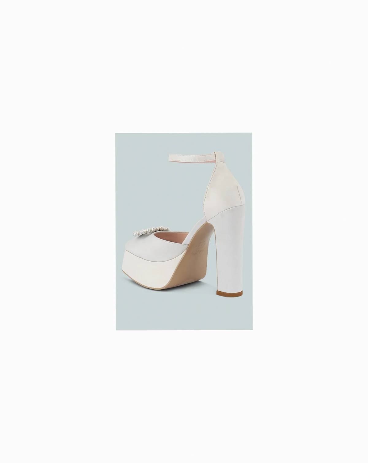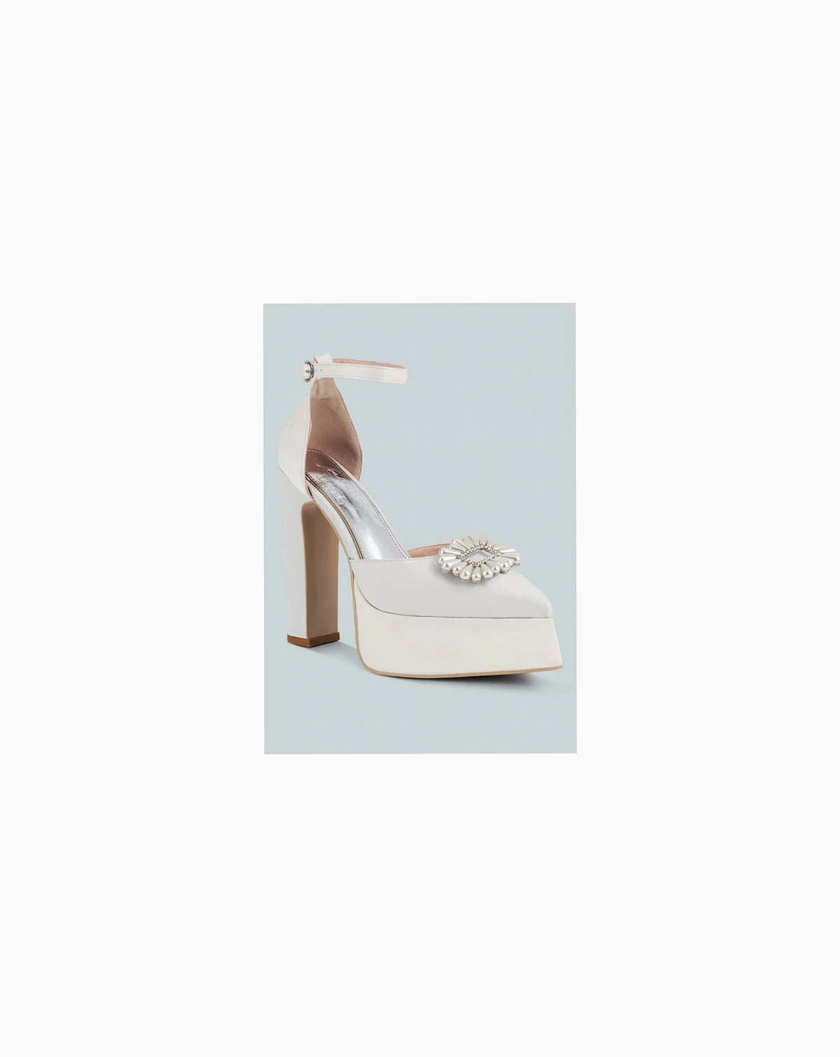 The high heel platform sandals are ideal for a fancy occasion that's all about elegant glamour! The pearls embellished brooch looks opulent and elevates the visual aesthetic of the sandals. The lightly cushioned insoles cut strain. Type: Sandals Upper Material: Satin Light Cushion Insoles Outer Sole: Resin High Block Heels Closed Pointed Toe Rhinestones Embellishment Double Pin Buckle Fastening Ankle Strap Fastening SH4234