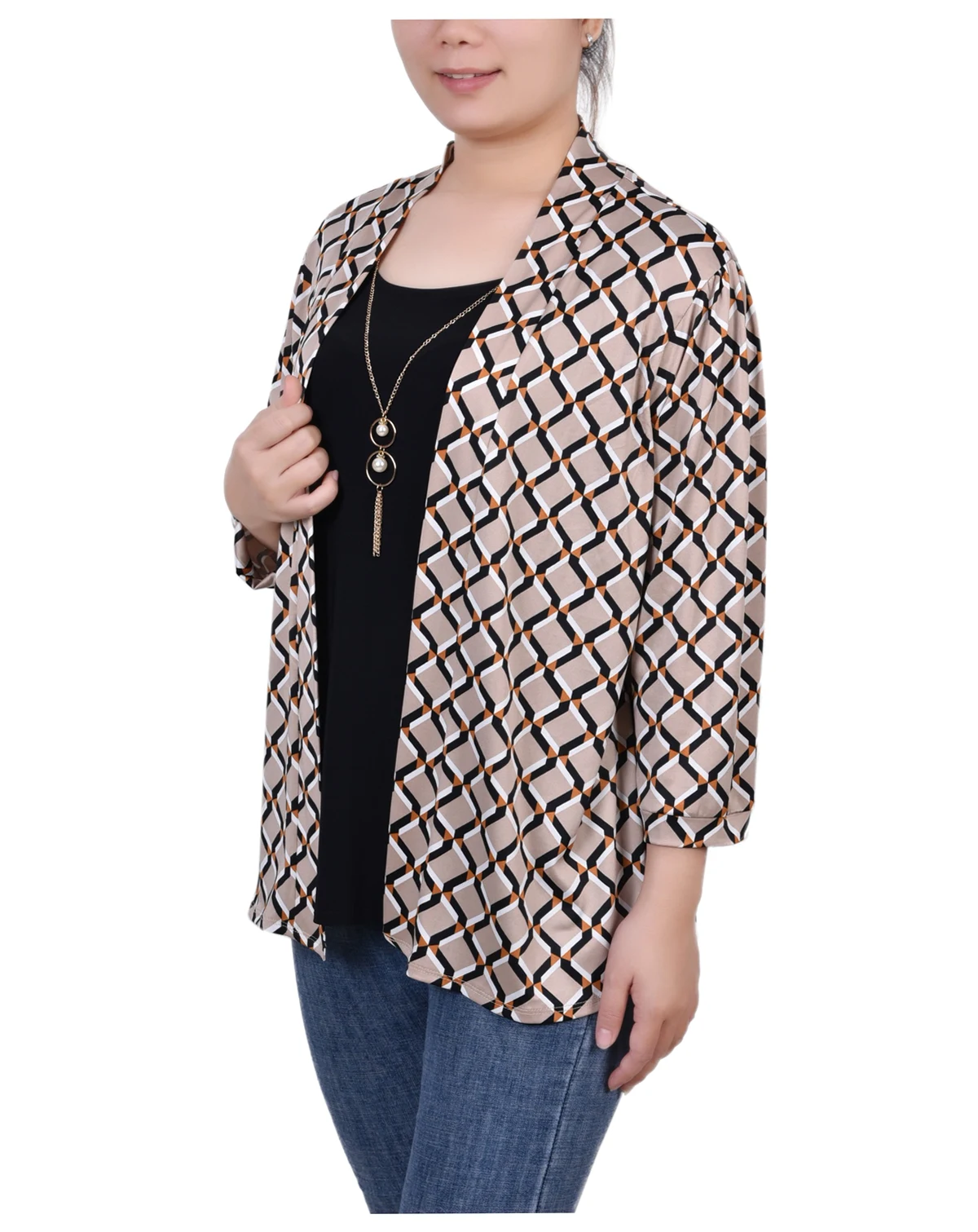 This NY Collection 2-fer top is so easy to wear with its combo printed jacket over a scoop neck tank and detachable necklace.