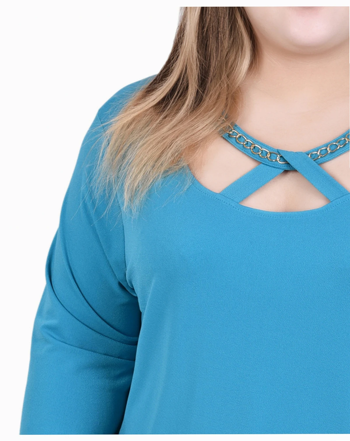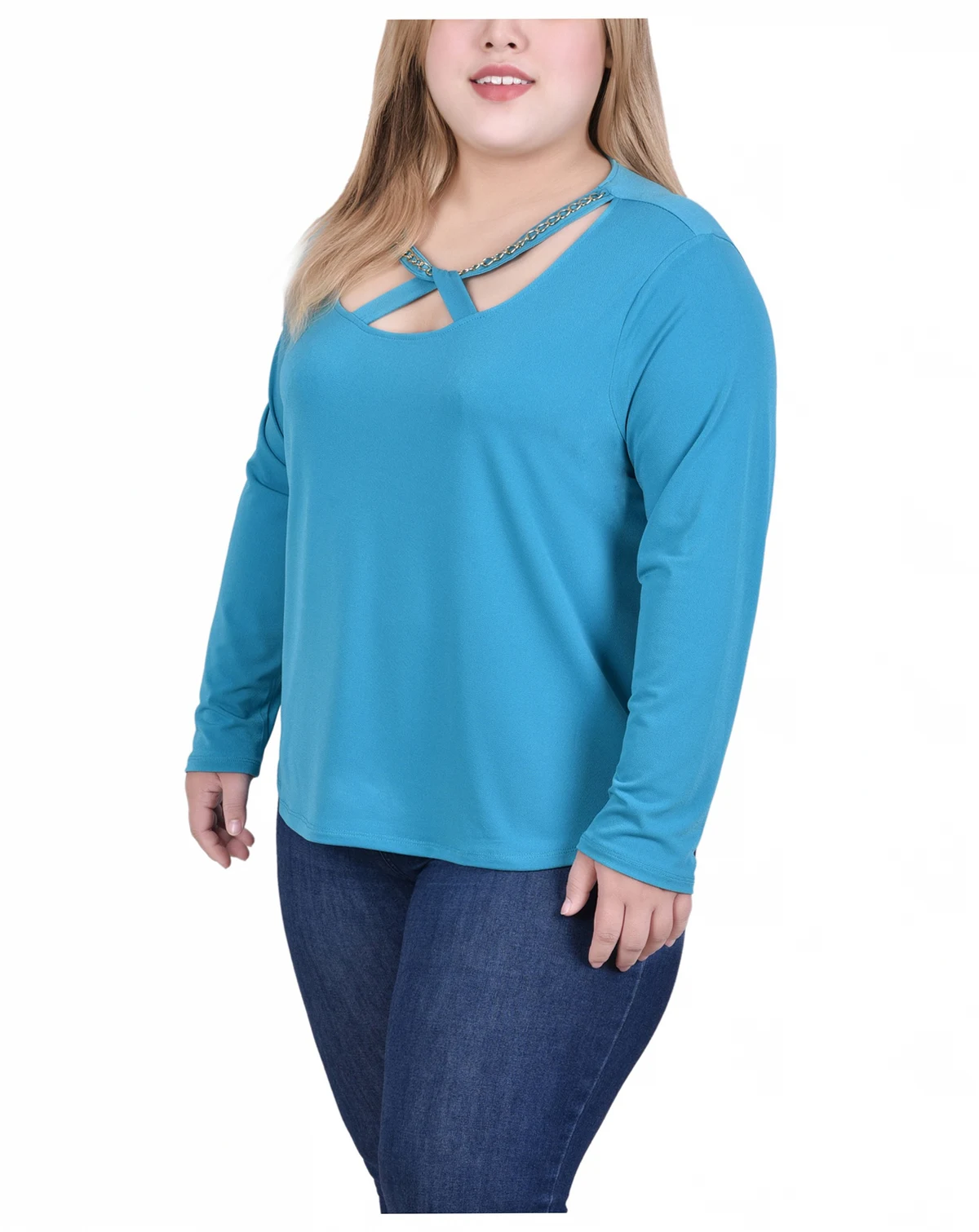 The chain neckline on this NY Collection long sleeve crepe knit top that make this piece truly unique.