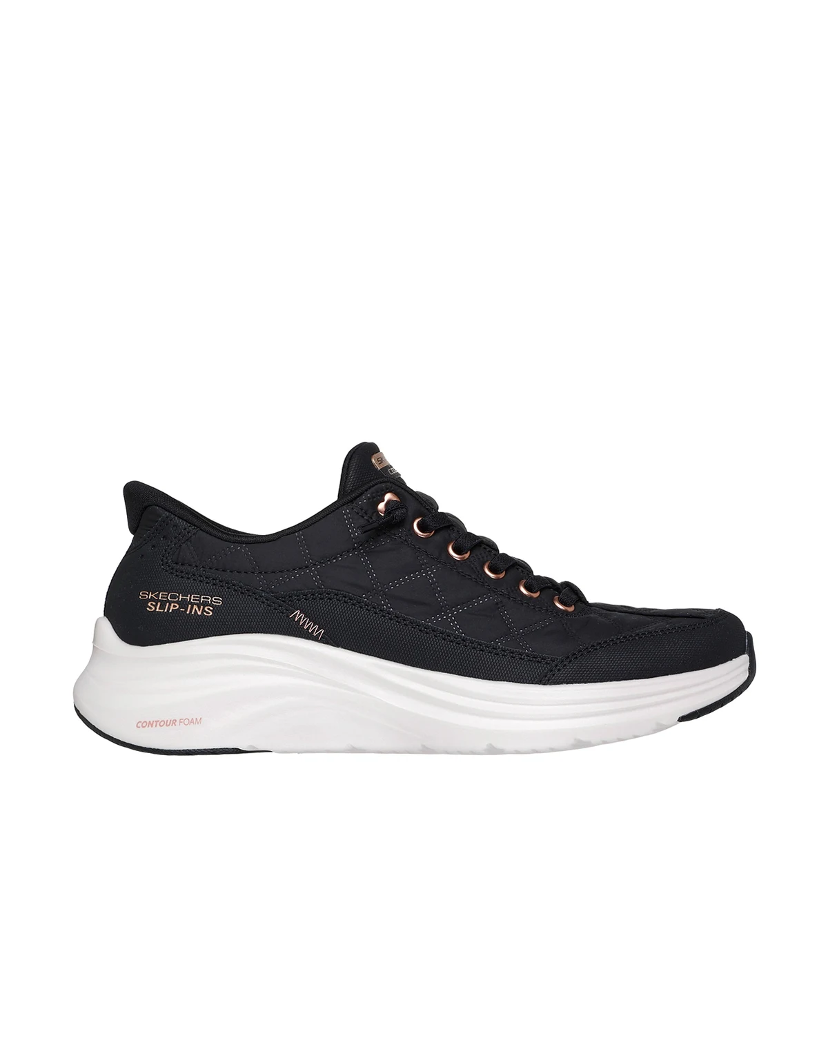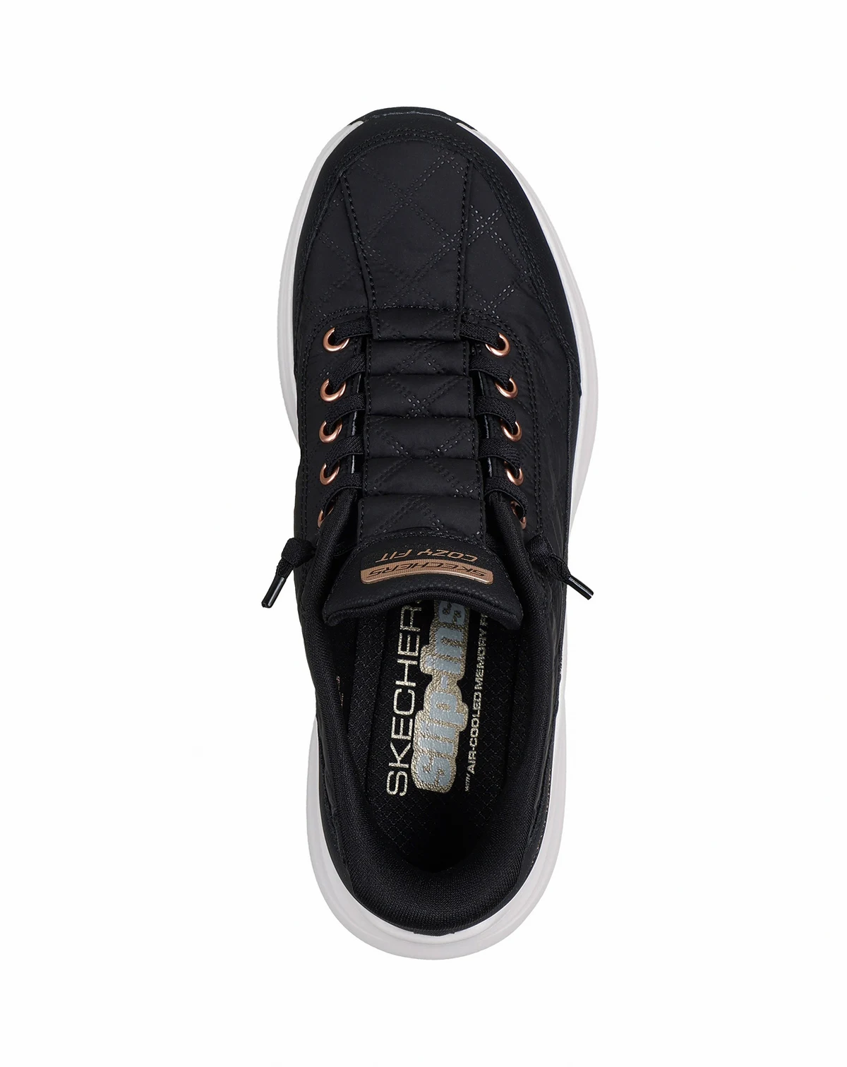 Experience charmed comfort from sunrise to sunset wearing these Skechers Women's Slip-ins: Contour Foam - Cozy Fit Golden Hour Walking Sneakers, Crafted with quilted fabric and a synthetic overlay upper and Skechers No Tie Fit laces, this low-profile silhouette is equipped with plush adaptive Contour Foam cushioning, a stabilizing Skechers Exclusive Heel Pillow, and a sole-soothing Skechers Air-Cooled Memory Foam insole.