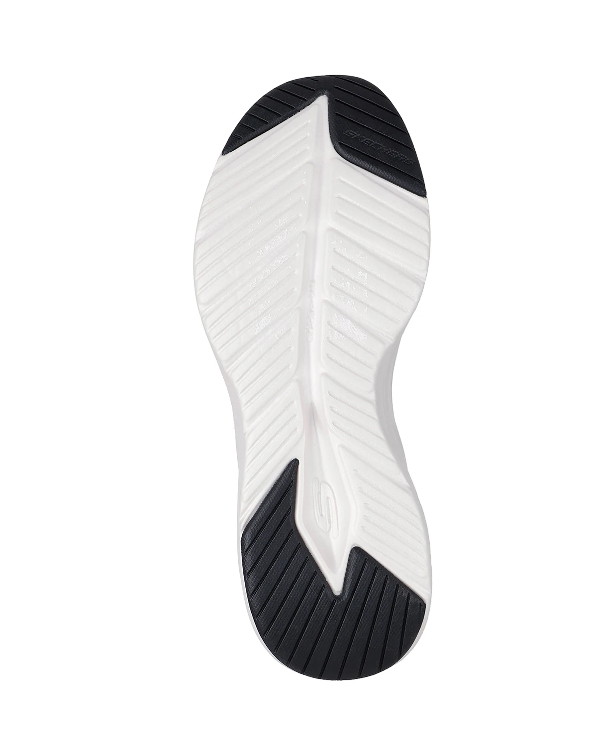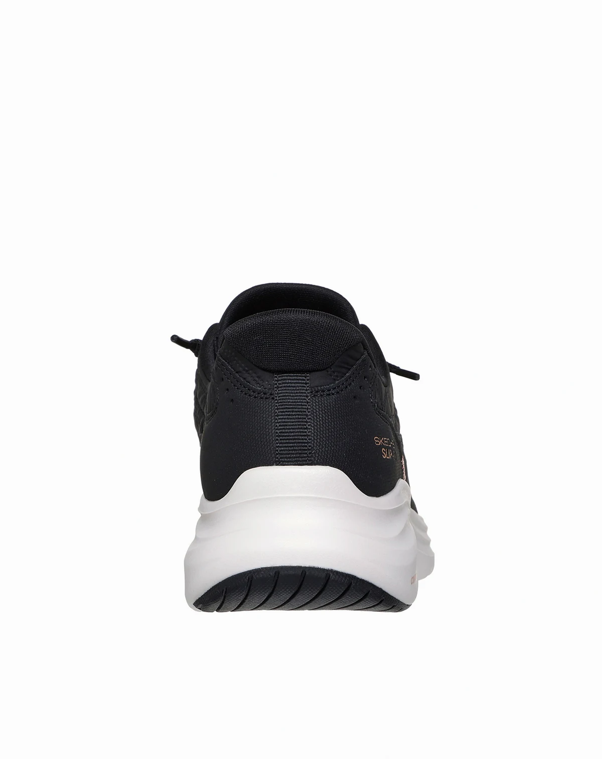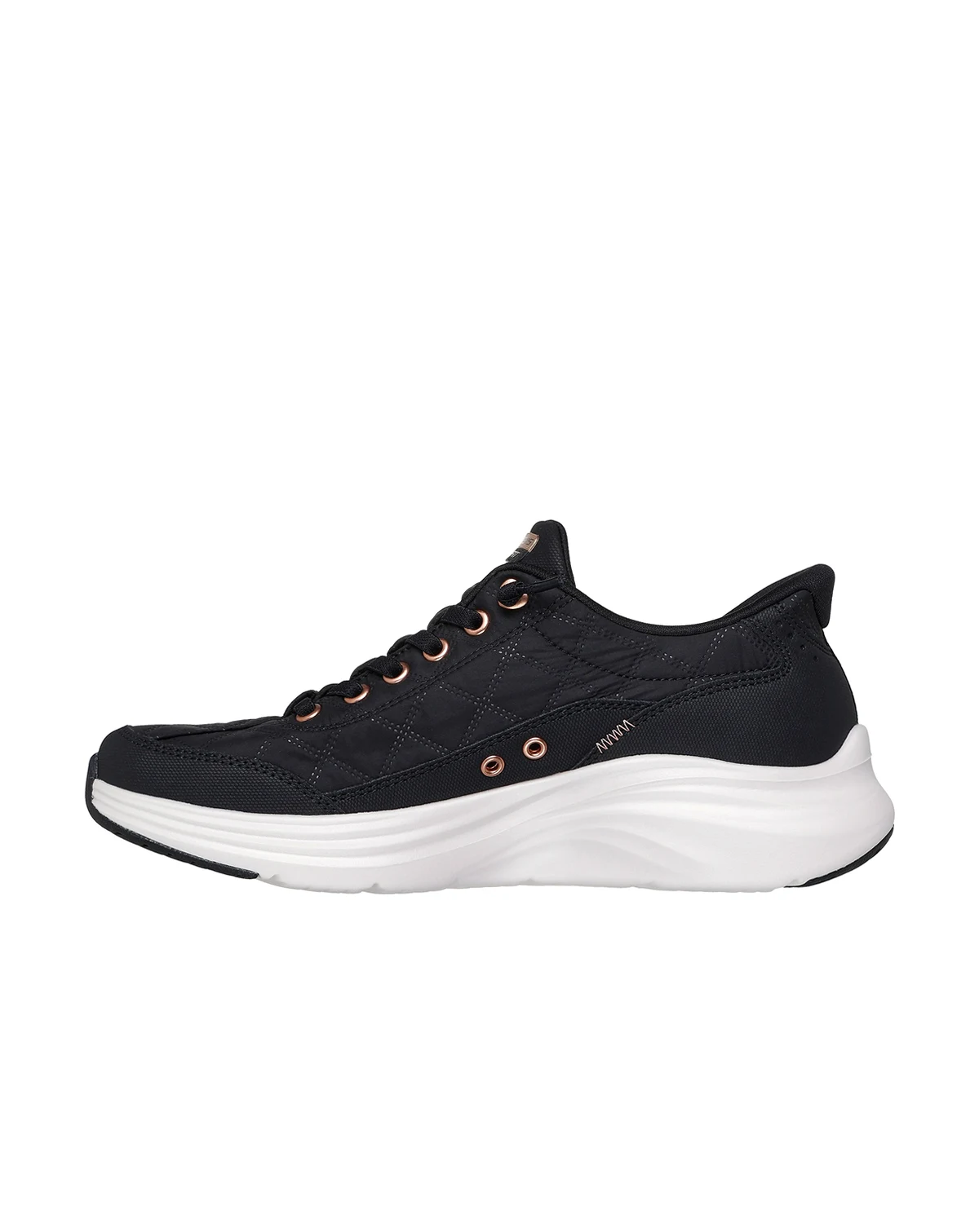 Quilted fabric and synthetic overlay upper with Skechers No Tie Fit laces never come untied; Flexible traction outsole with 1 1/3-inch heel height