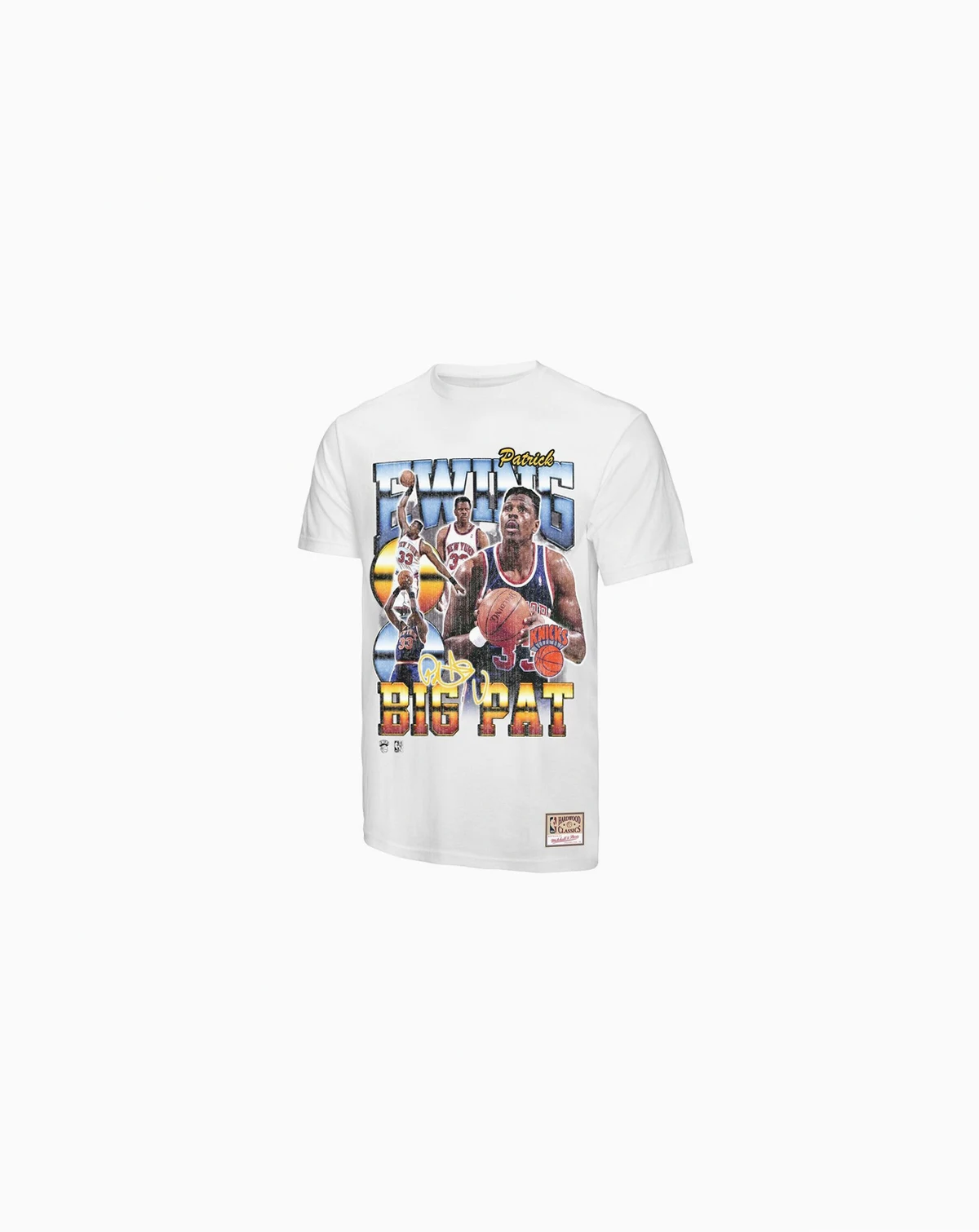 Celebrate Patrick Ewing and the New York Knicks' storied legacy with this Mitchell & Ness Hardwood Classics Commemorative Player Collage T-shirt. A tribute to the legends who defined an era, this T-shirt features cotton fabric construction that offers a comfortable and quality fit, perfect for everyday wear or showcasing your team pride in throwback style. The faded yet colorful, inspired screen-print graphics showcasing a collage of "Big Pat" and his replica signature, captures the essence of Knickerbockers greatness.