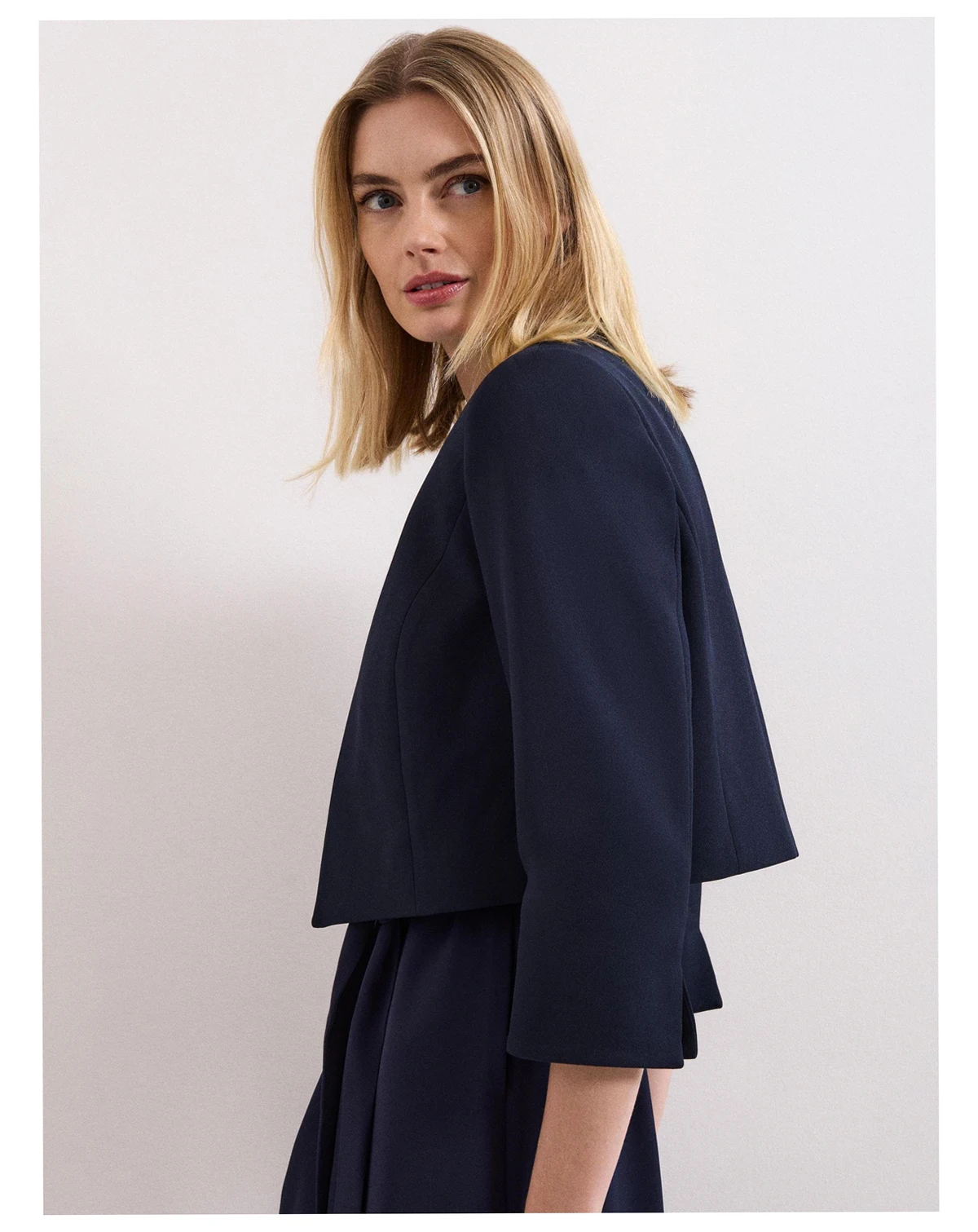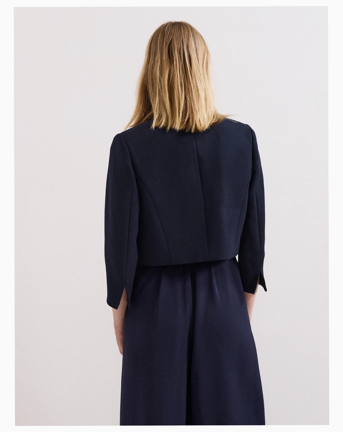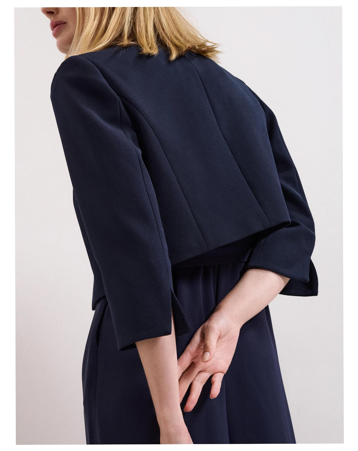 Sleek cropped jacket that sculpts the waist, open front and three-quarter sleeves for graceful movement, ideal for cocktail evenings and special events.