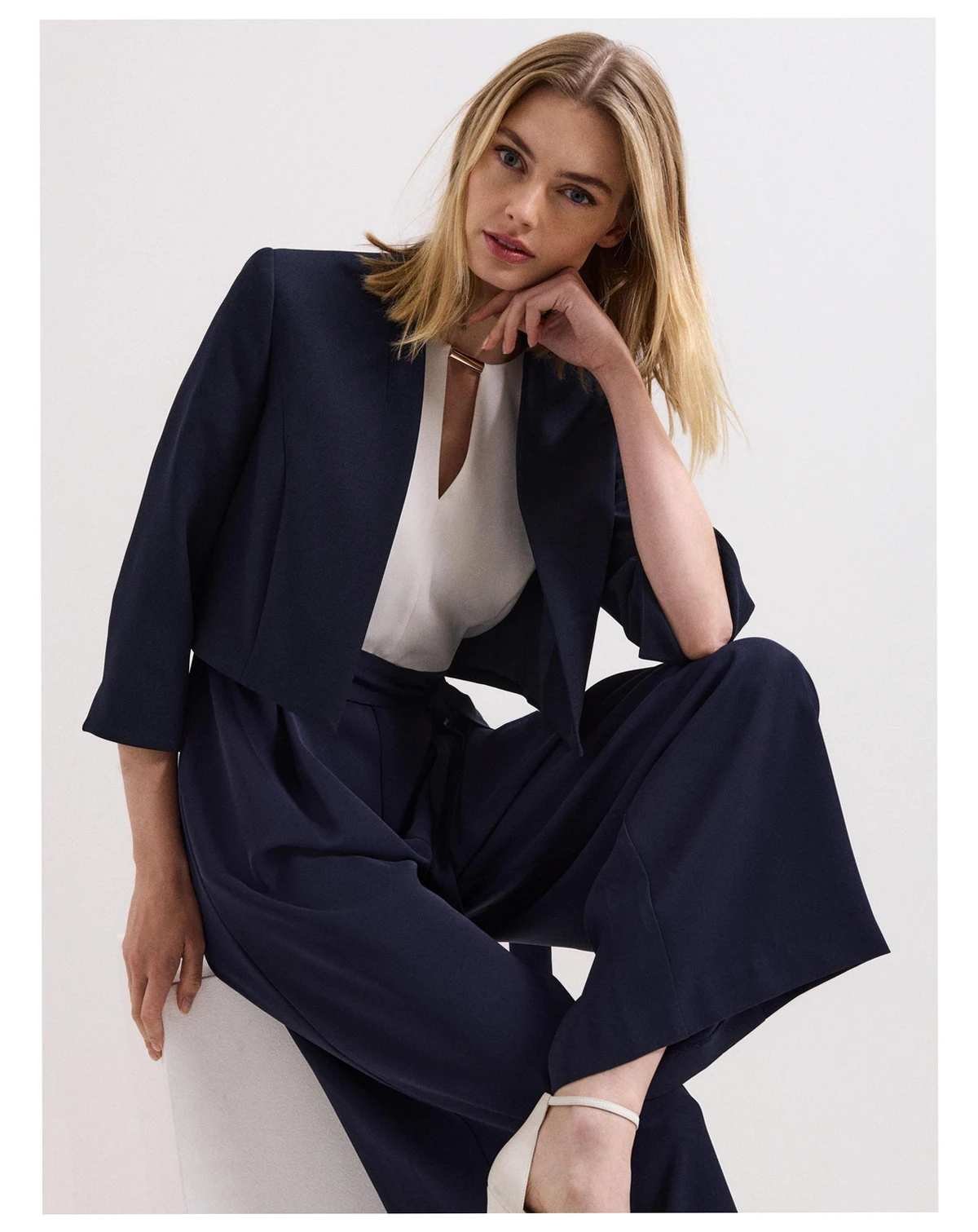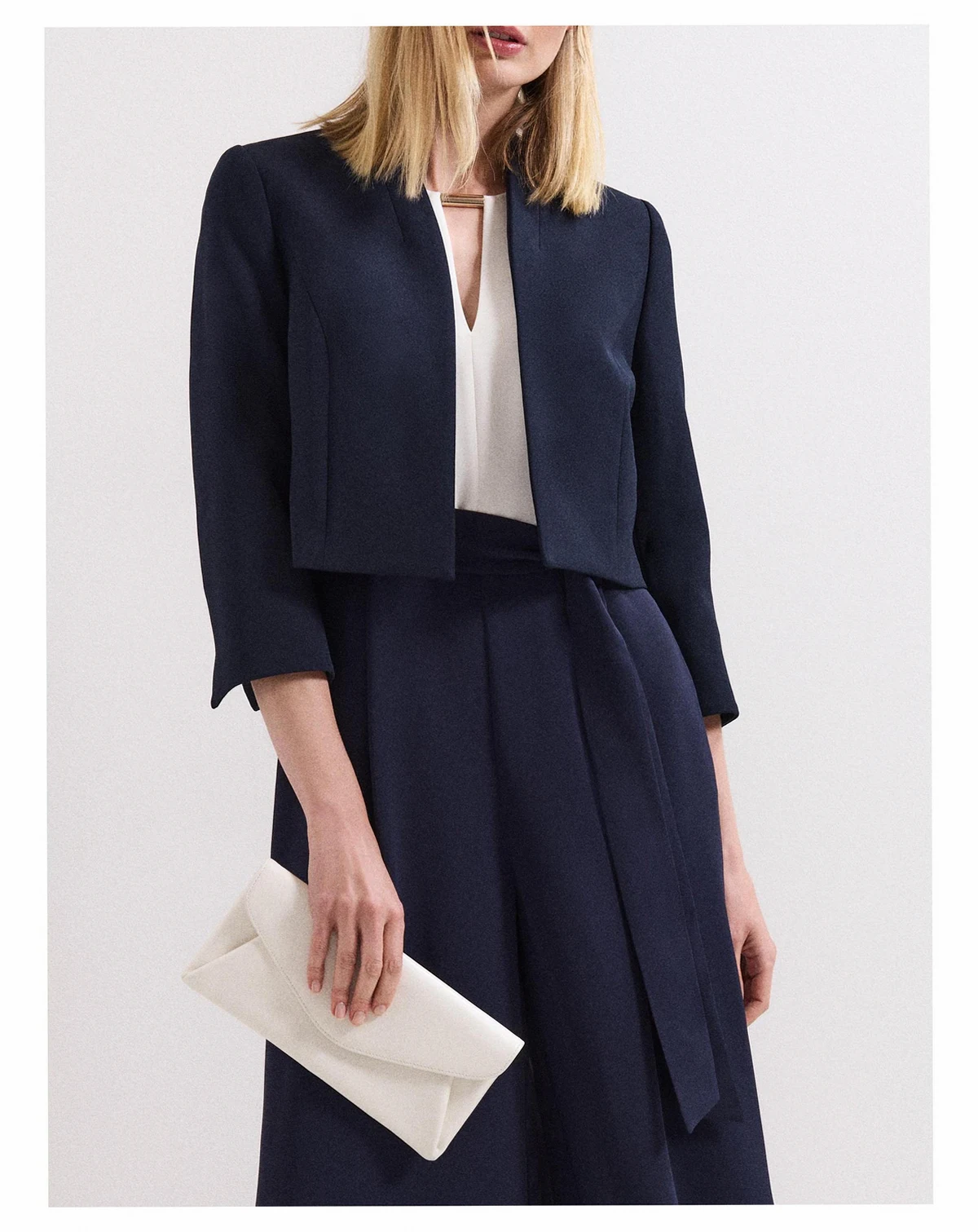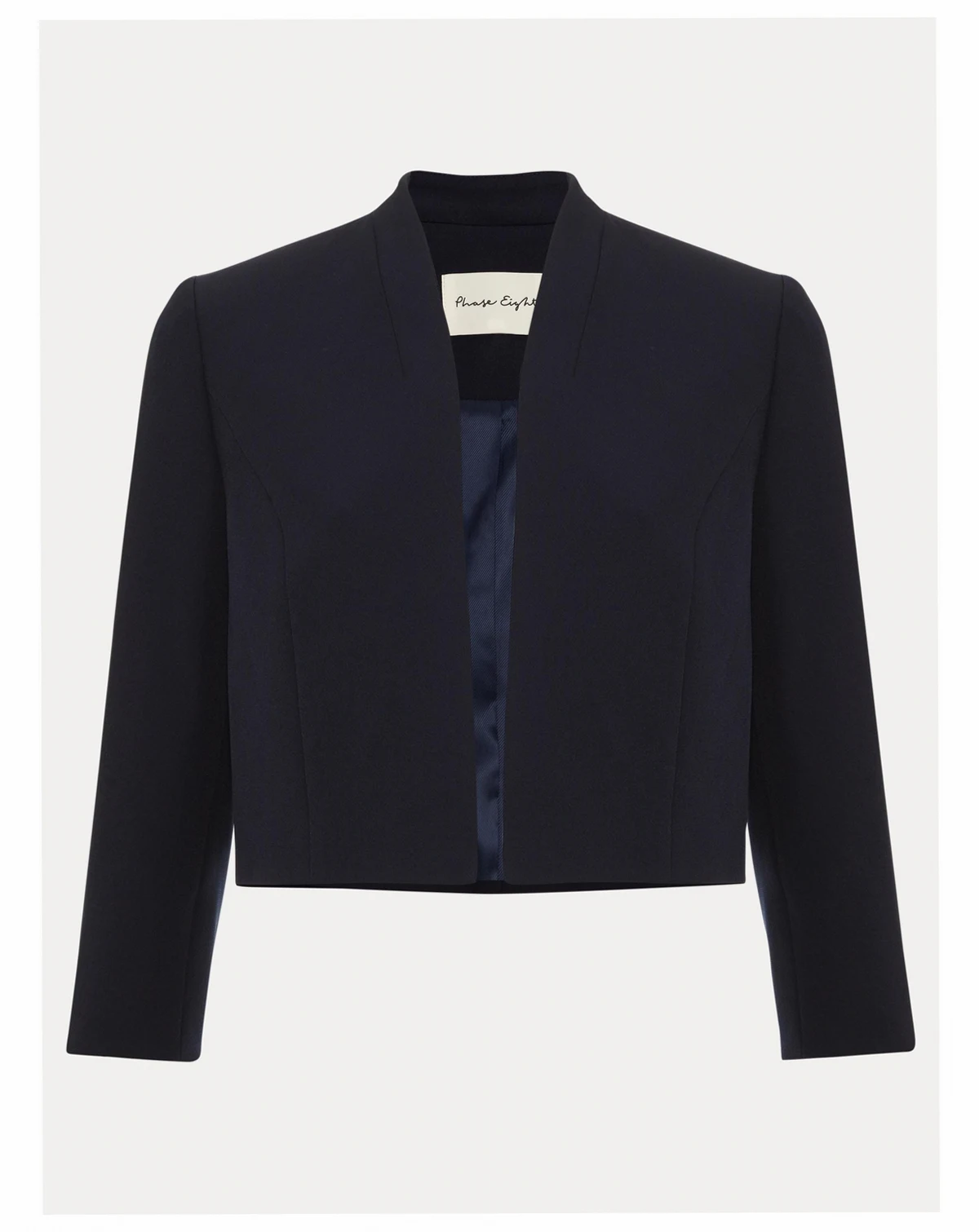Sleek cropped jacket that sculpts the waist, open front and three-quarter sleeves for graceful movement, ideal for cocktail evenings and special events.