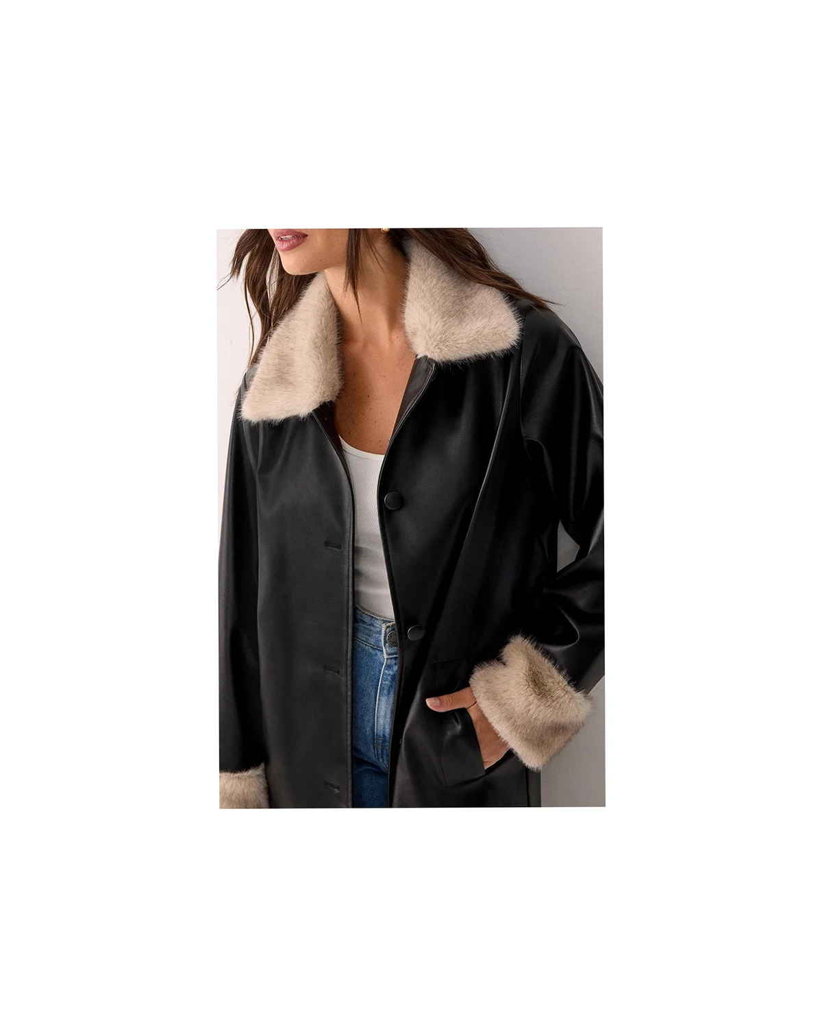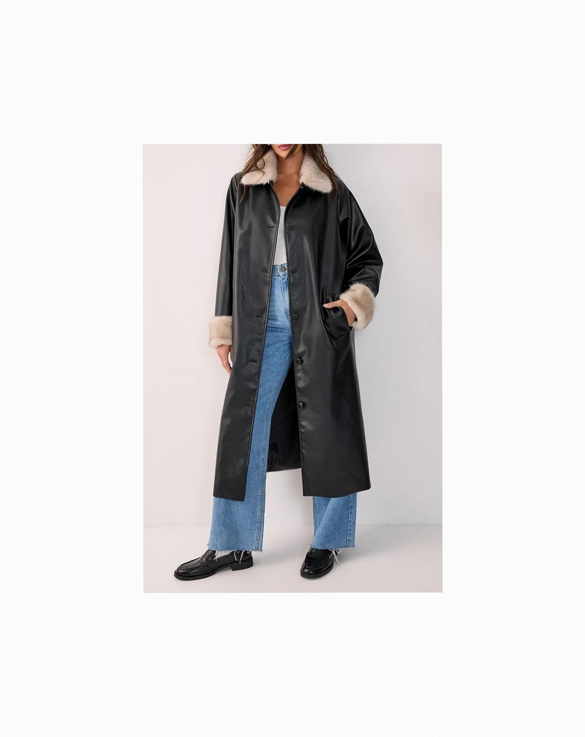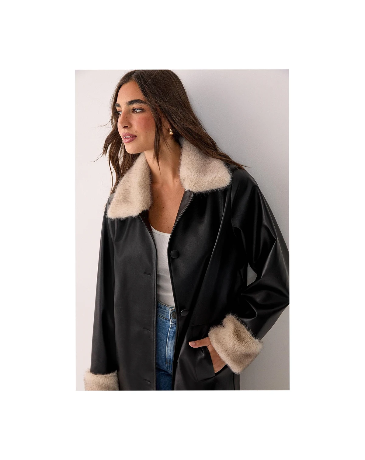 Make a bold fashion statement with this striking faux leather longline coat from NastyGal. The contrasting soft fur trim adds a touch of glamour to this contemporary piece, whilst the versatile design transitions effortlessly from day to night.