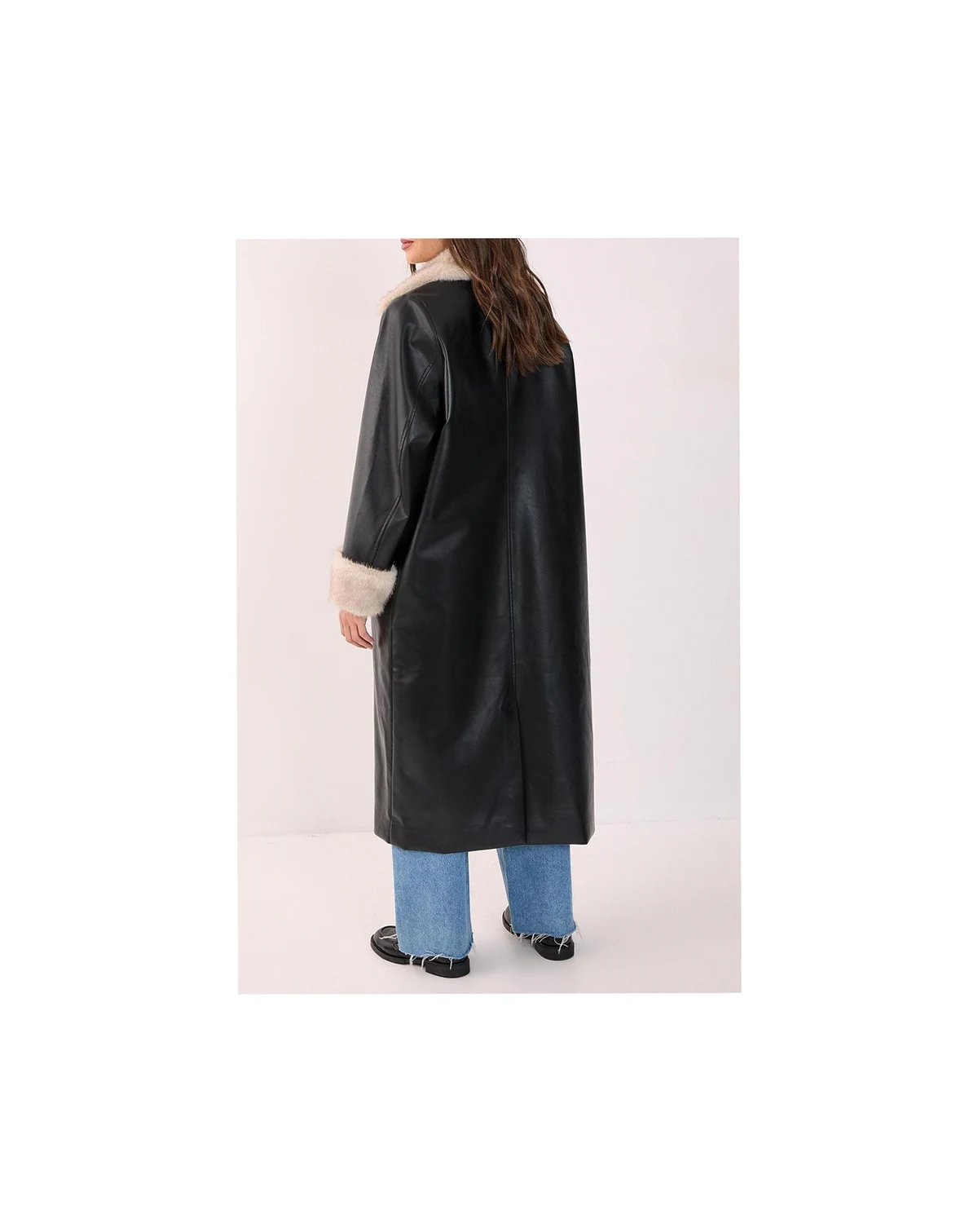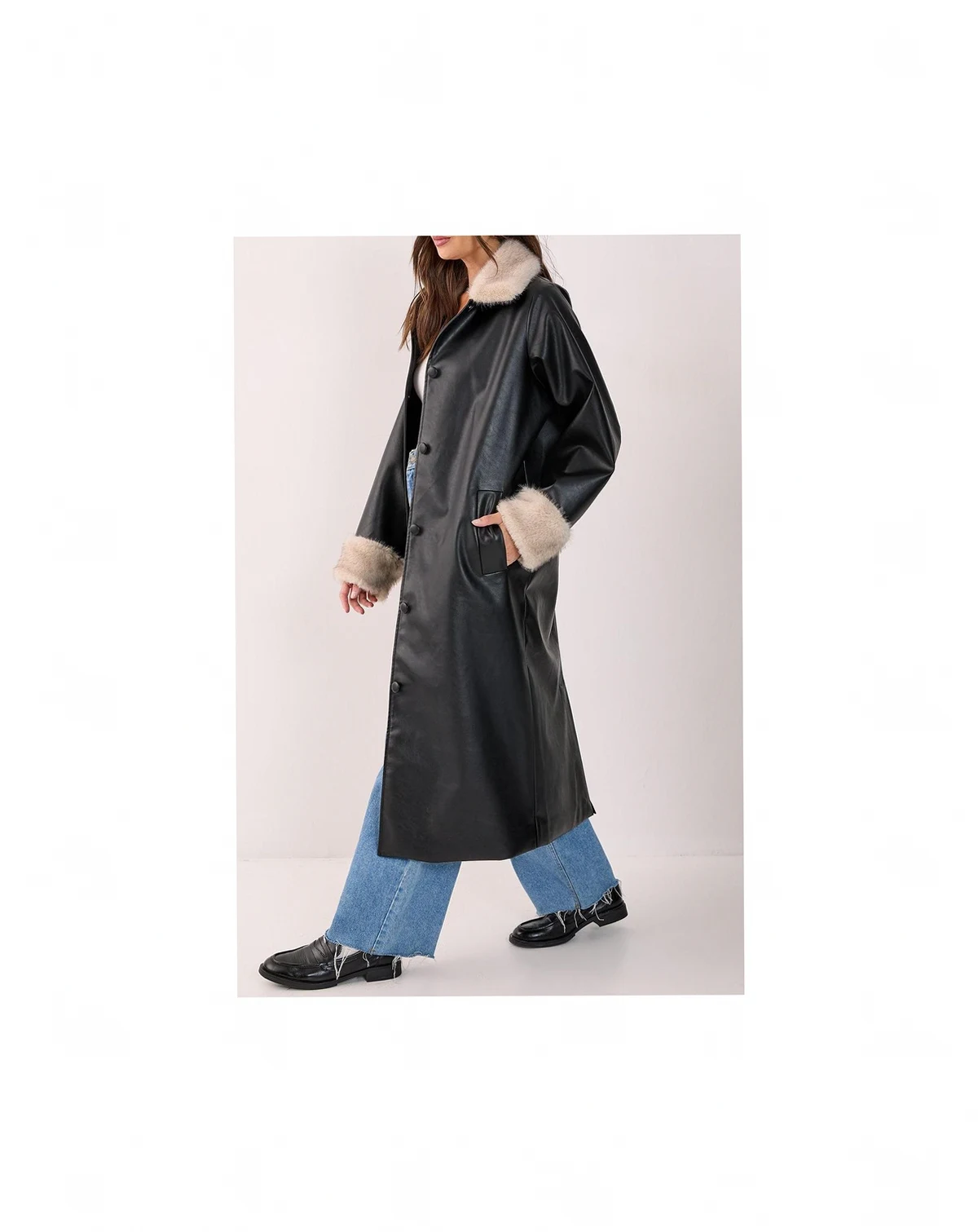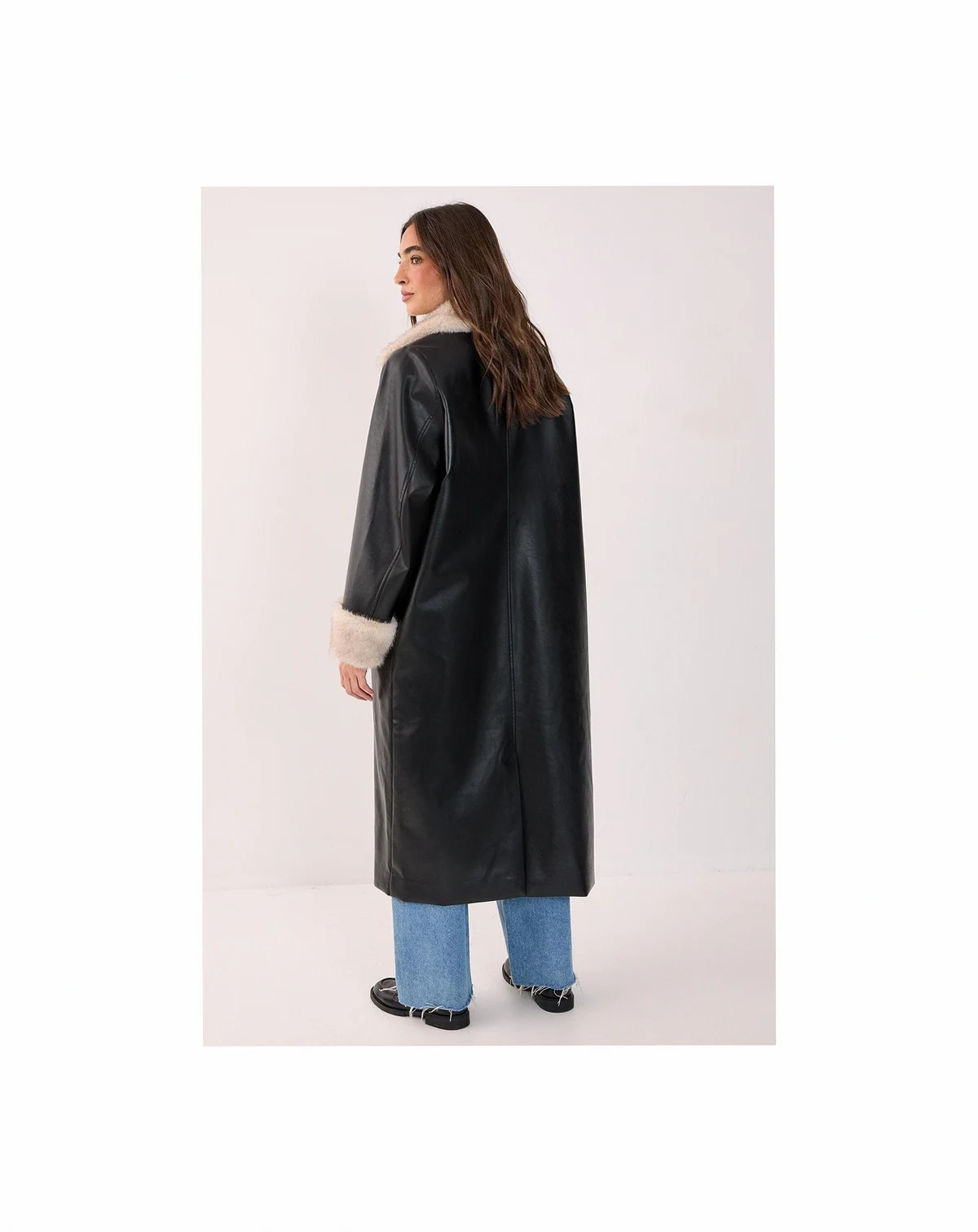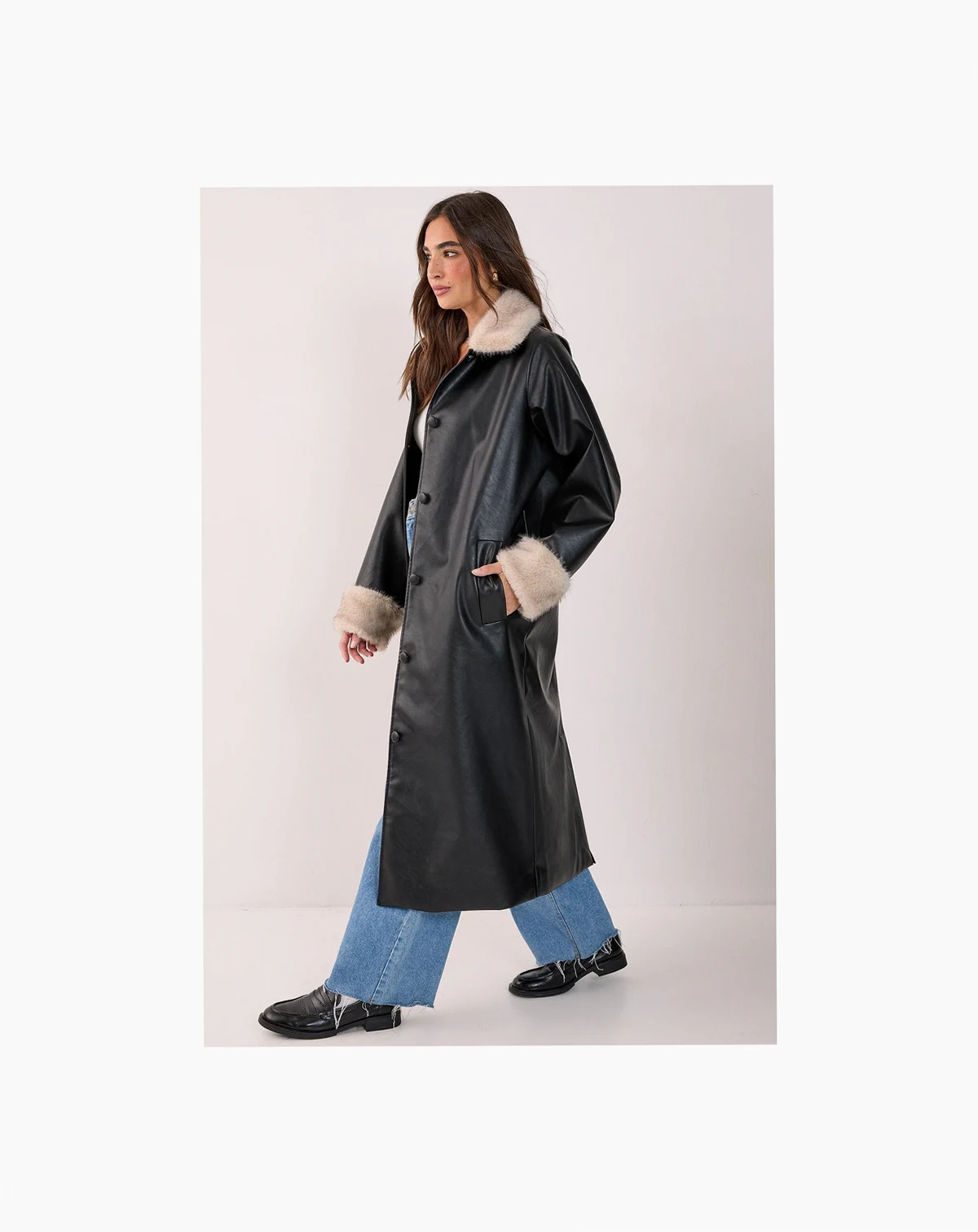 Make a bold fashion statement with this striking faux leather longline coat from NastyGal. The contrasting soft fur trim adds a touch of glamour to this contemporary piece, whilst the versatile design transitions effortlessly from day to night.