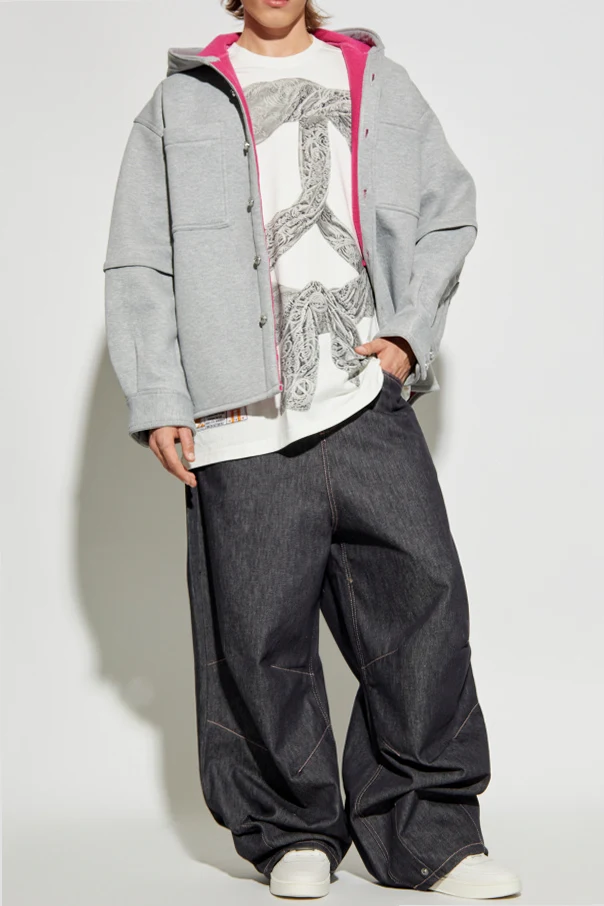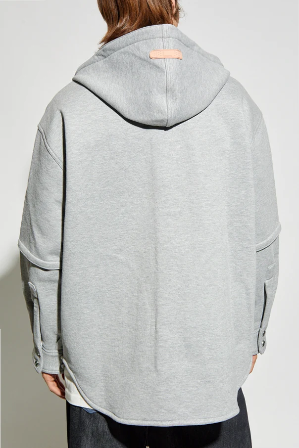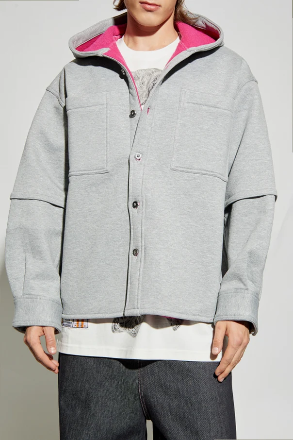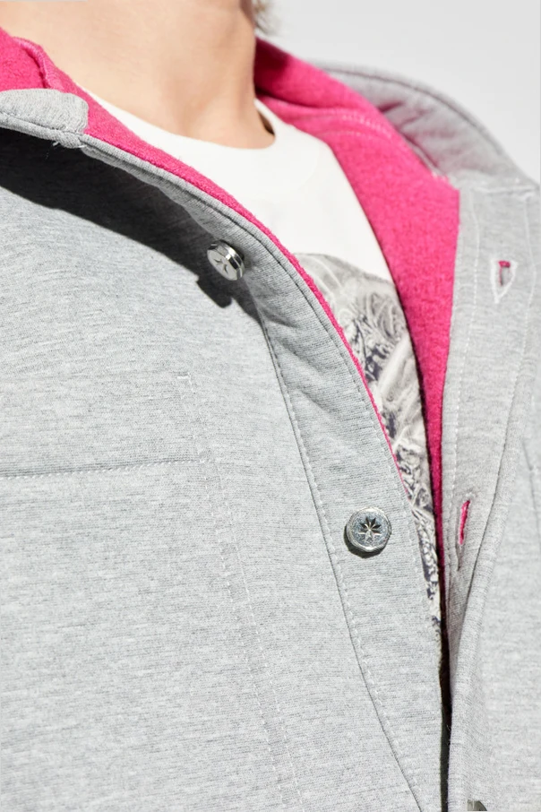 Expertly crafted from an exquisitely soft knit fabric, the jacket offers visual and tactile comfort, while an arresting contrast emerges from the vivid pink lining that adorns both the interior and the inner hood. Presented in an understated light heather gray, its clean lines and absence of external prints amplify its modern elegance.