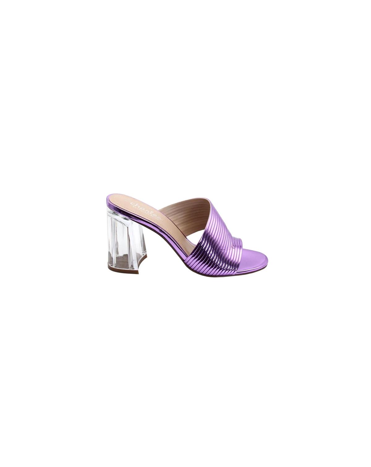 A wrapped, architectural clear heel heightens the statement style of this sandal featuring an asymmetrical band with an elastic inset at one side.