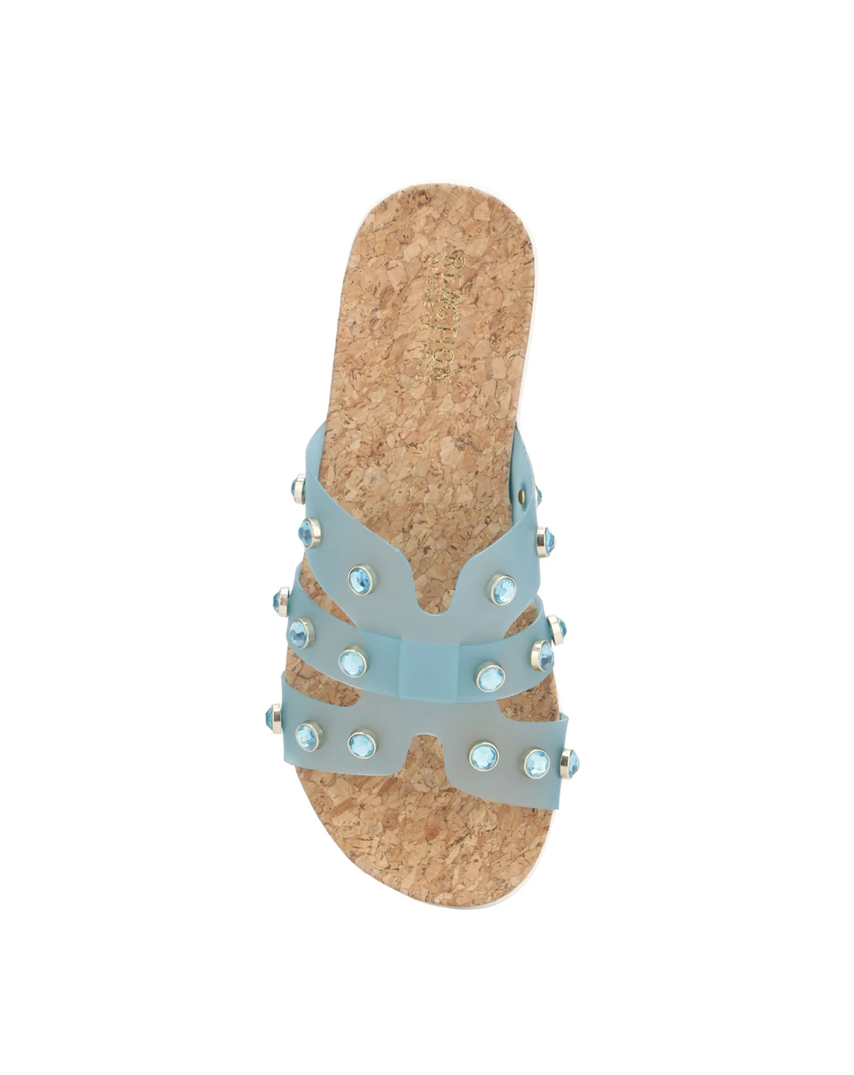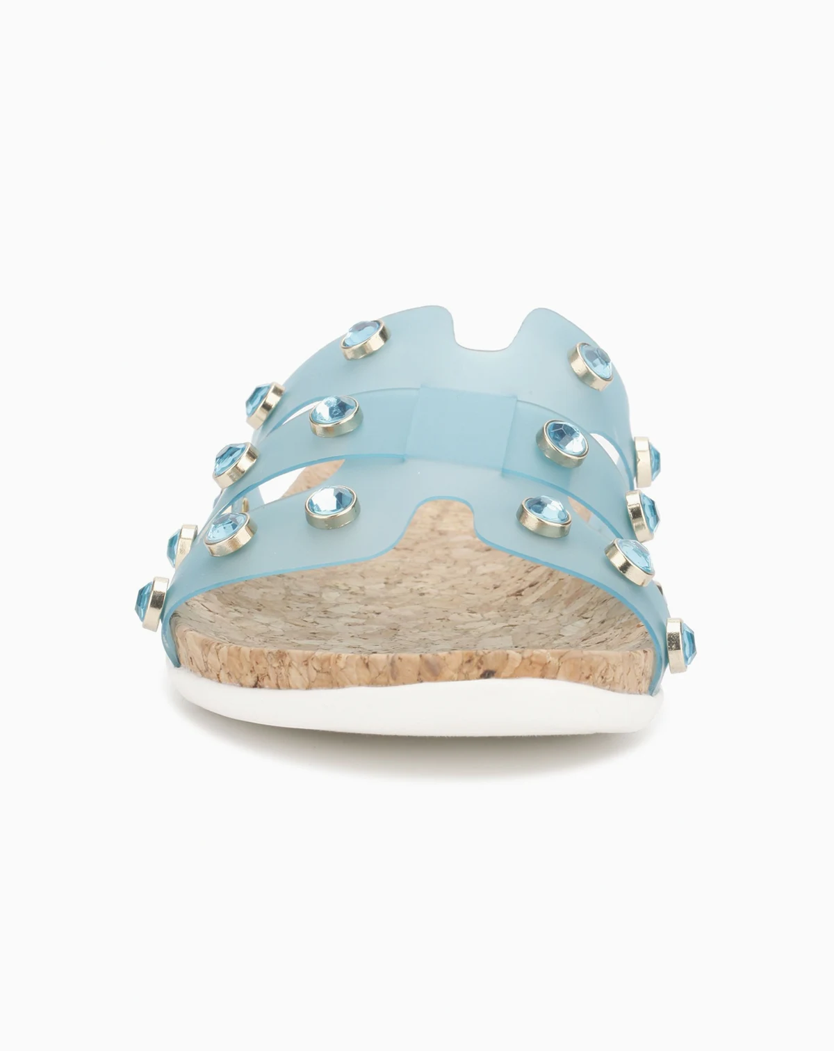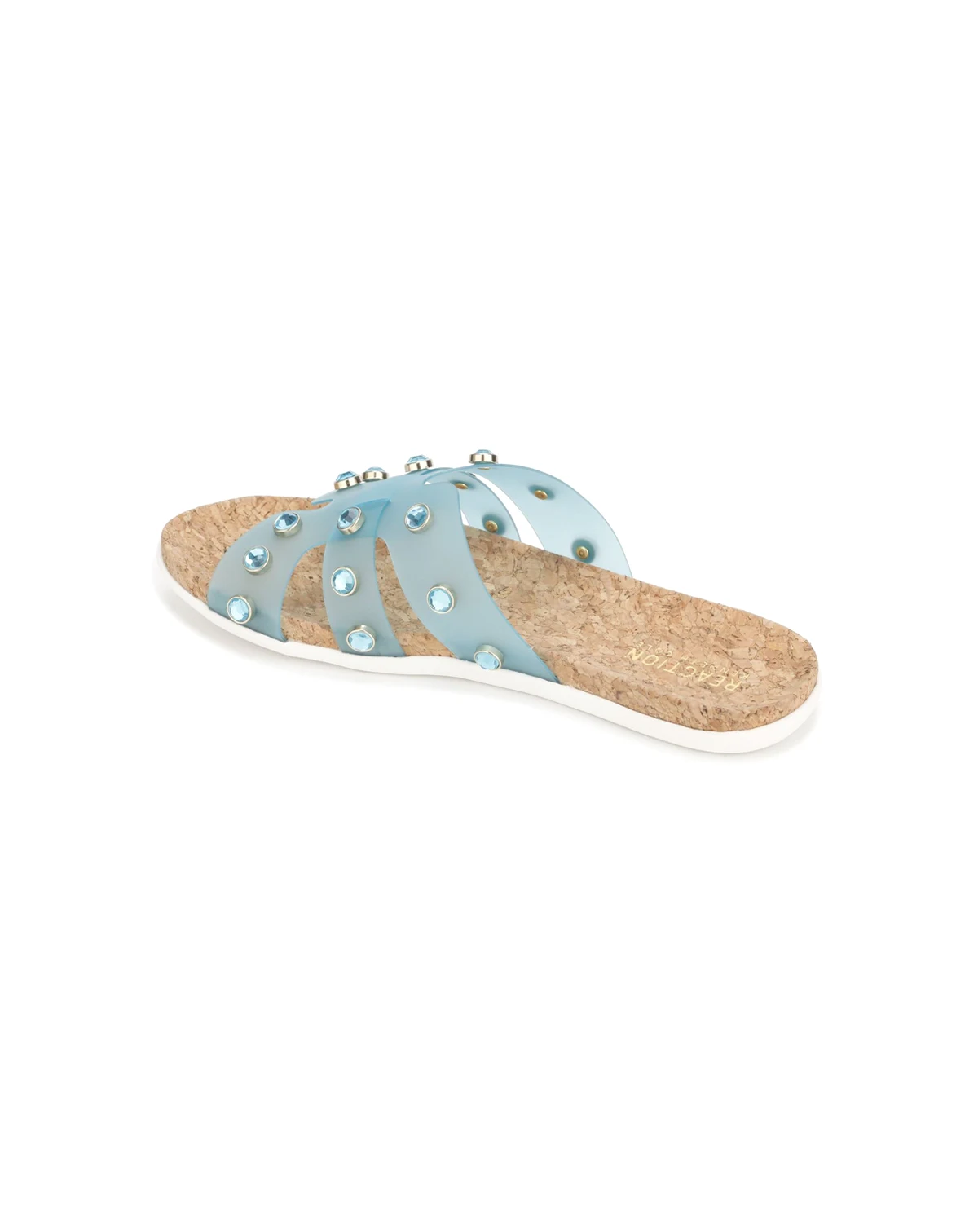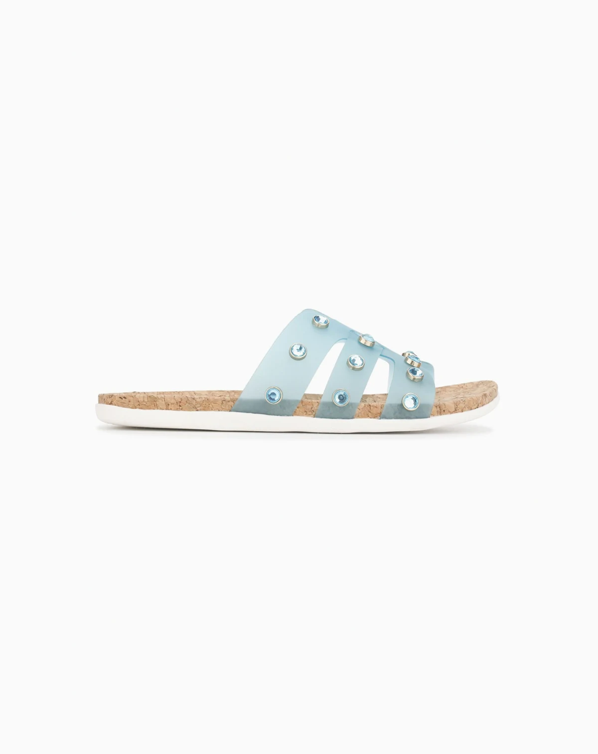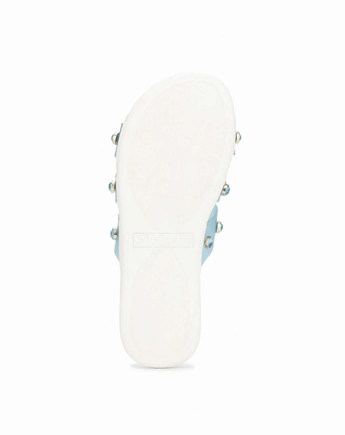Metal and jewels elevate this vinyl slide which will sure to become your favorite go to sandal this summer from Kenneth Cole Reaction.