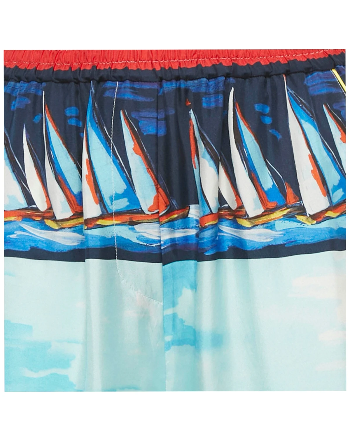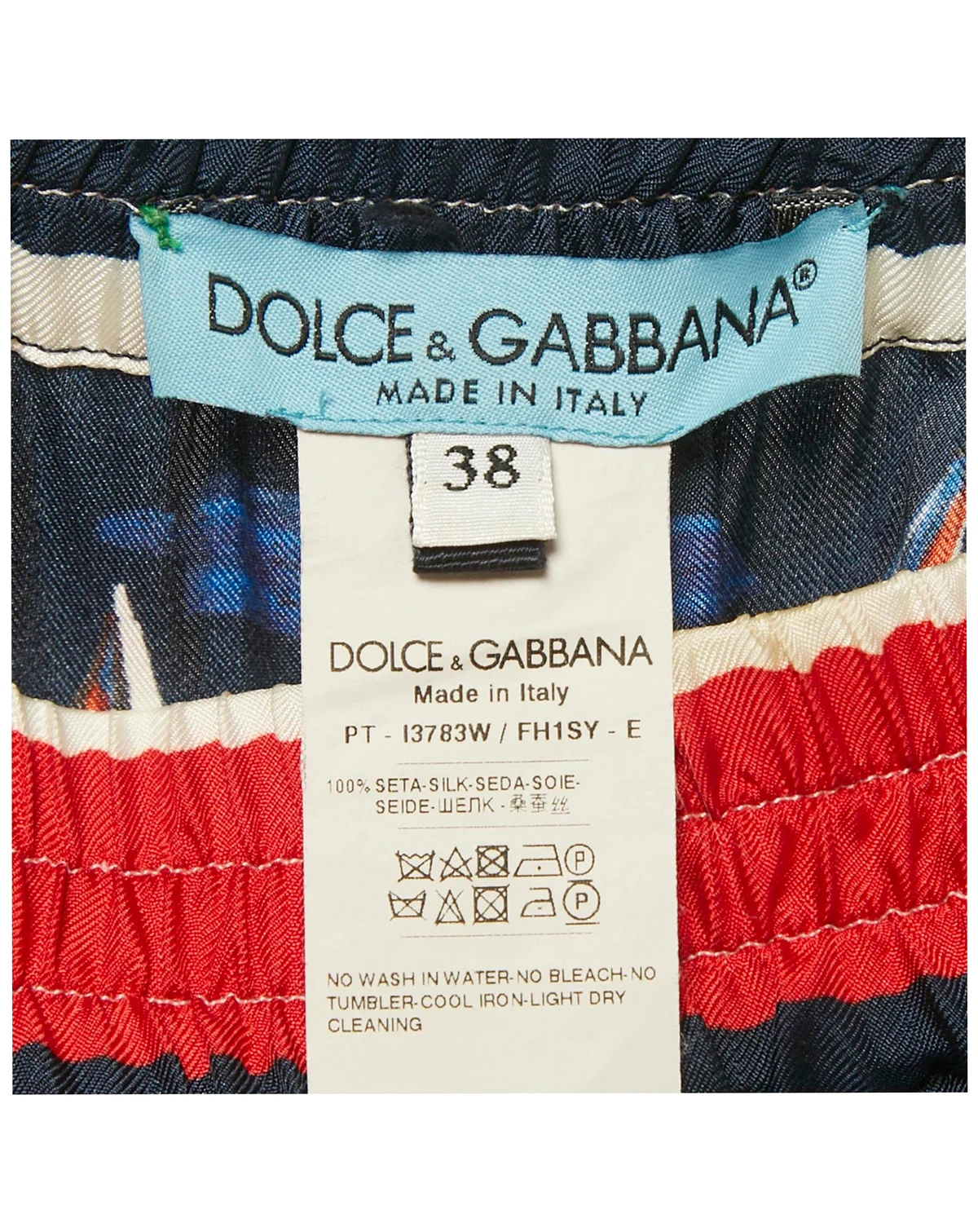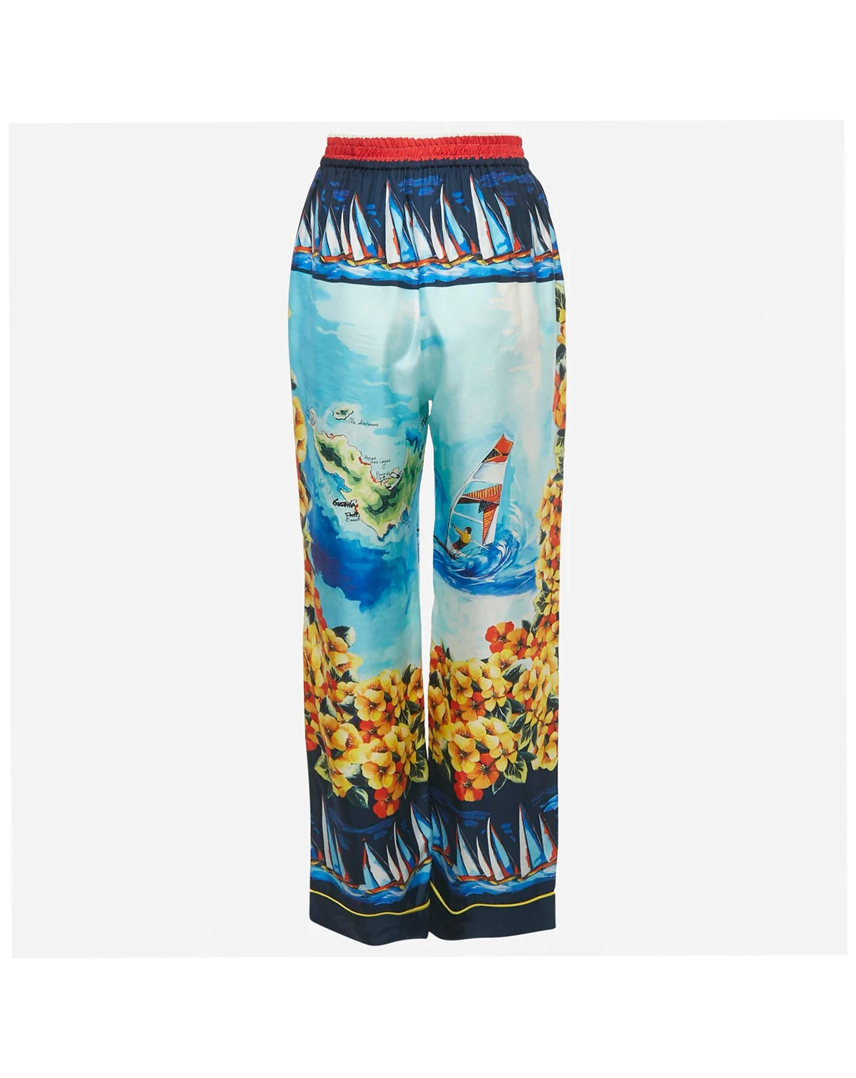 Dolce and Gabbana presents trousers in multicolor printed silk. Vibrant and expressive they reflect maison artistry in tailored design. A polished piece they embody Italian glamour.
