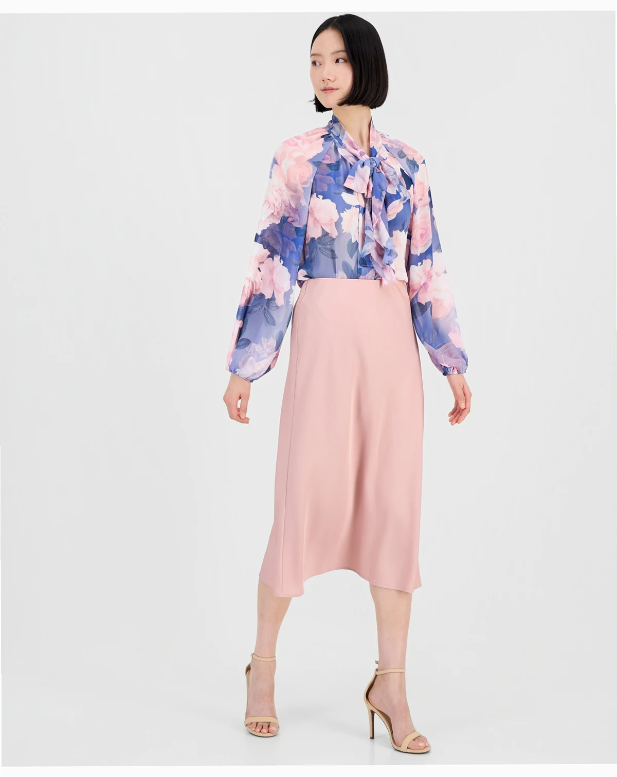 Flowy, floral, and finished with trailing neckline ties, this Tahari ASL blouse adds a pretty touch to a professional look.