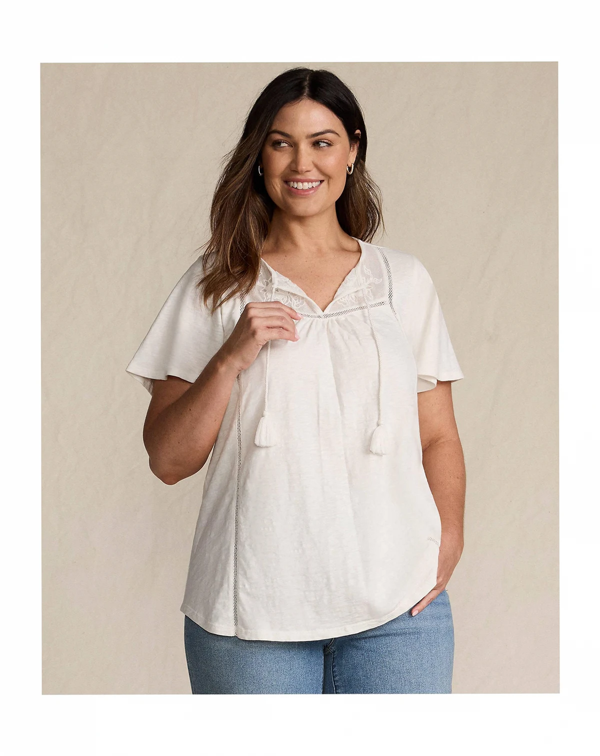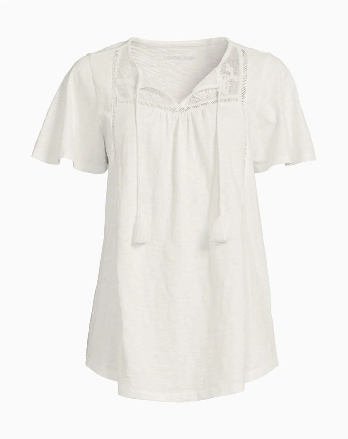 A laid-back, soon-to-be favorite top has just the right amount of flair. This tunic is made from breathable, soft cotton slub, which features flutter sleeves, a split neckline with tie front closure (tied or untied, you decide) and a beautifully embellished lace yoke for that handcrafted, free-spirited feel. The relaxed fit and sweeping shirttail hem give it an easy, effortless drape that moves with you. Pair it with your go-to skinny-leg jeans, cutoffs, or laid-back chinos for an instant boho-chic look that s as comfy as it is cool..