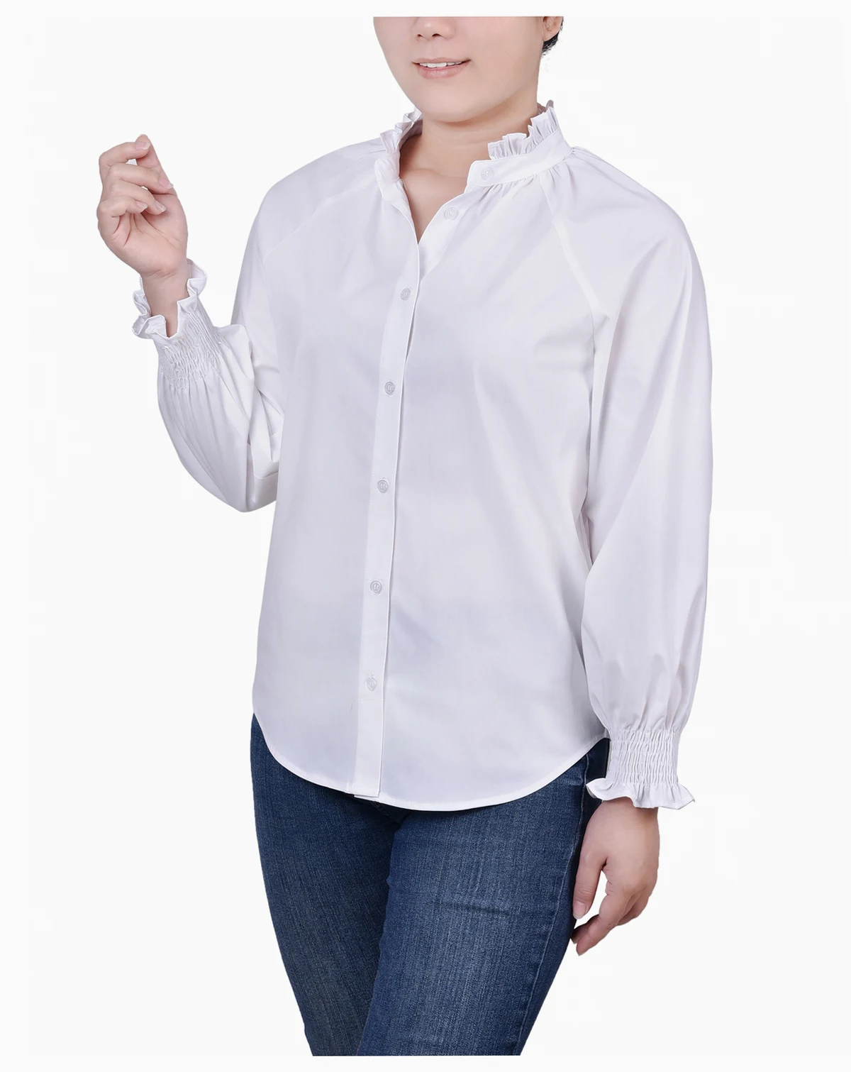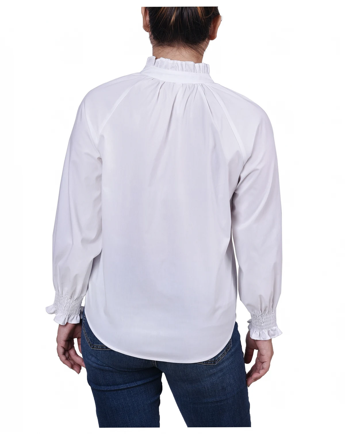 This wardrobe staple from NY Collection features a ruffled neck and smocked cuffs making it the perfect everyday top.