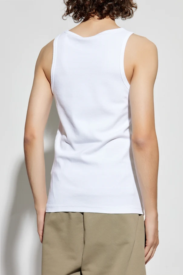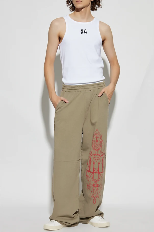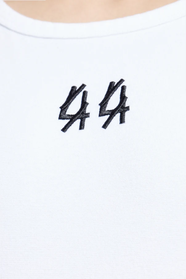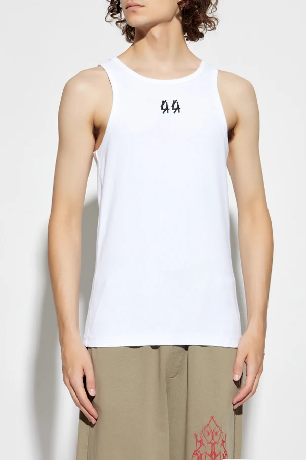 The pristine white canvas is strikingly punctuated by a bold, embroidered black “44” logo resting perfectly beneath the neckline. Rendered in a geometric typeface, this signature detail marks the tank as part of the brand’s coveted designer collection. An homage to the dynamic energy of the Berlin rave scene and inspired by club culture, this tank top embodies the boundary-breaking aesthetic of 44 Label Group.
