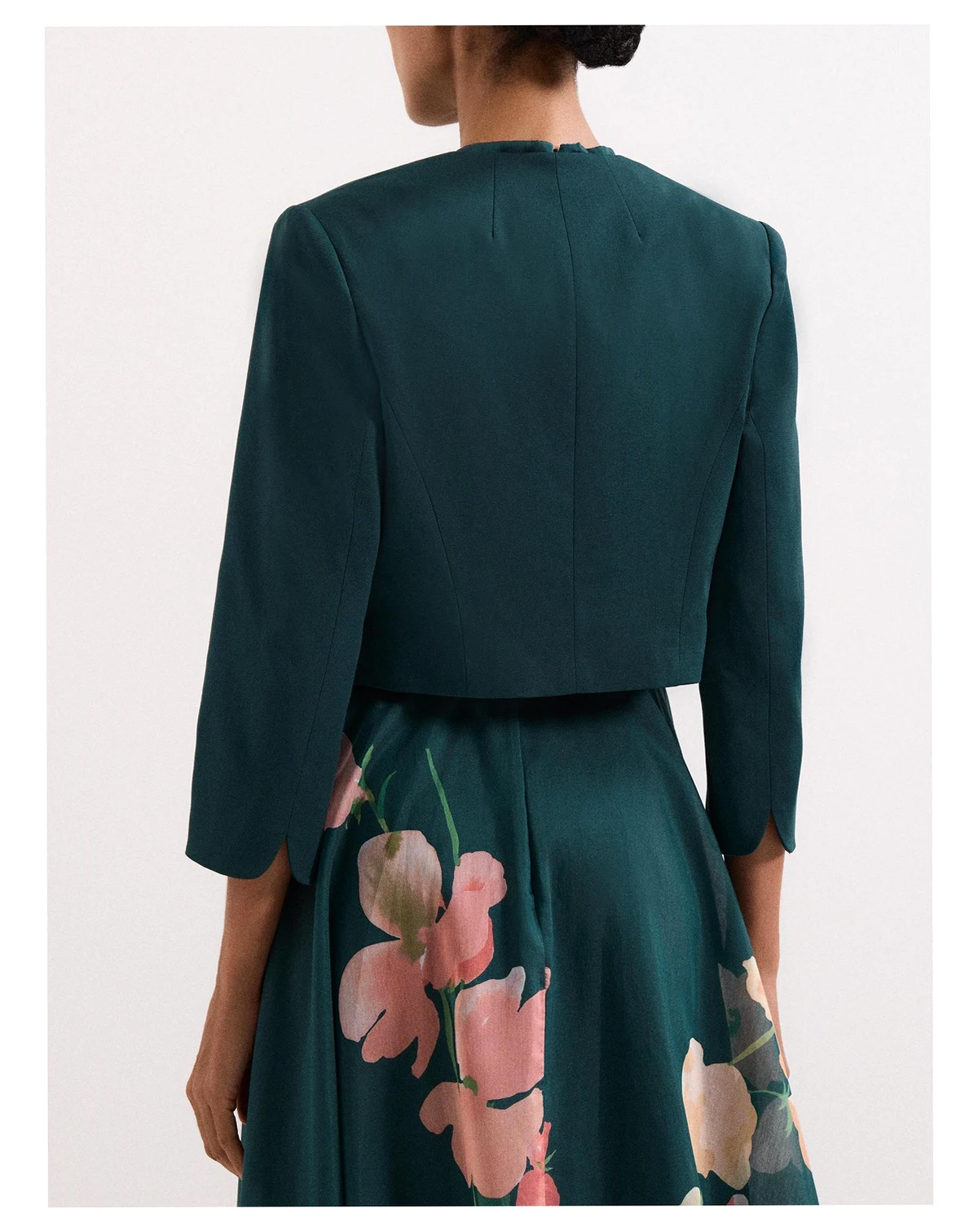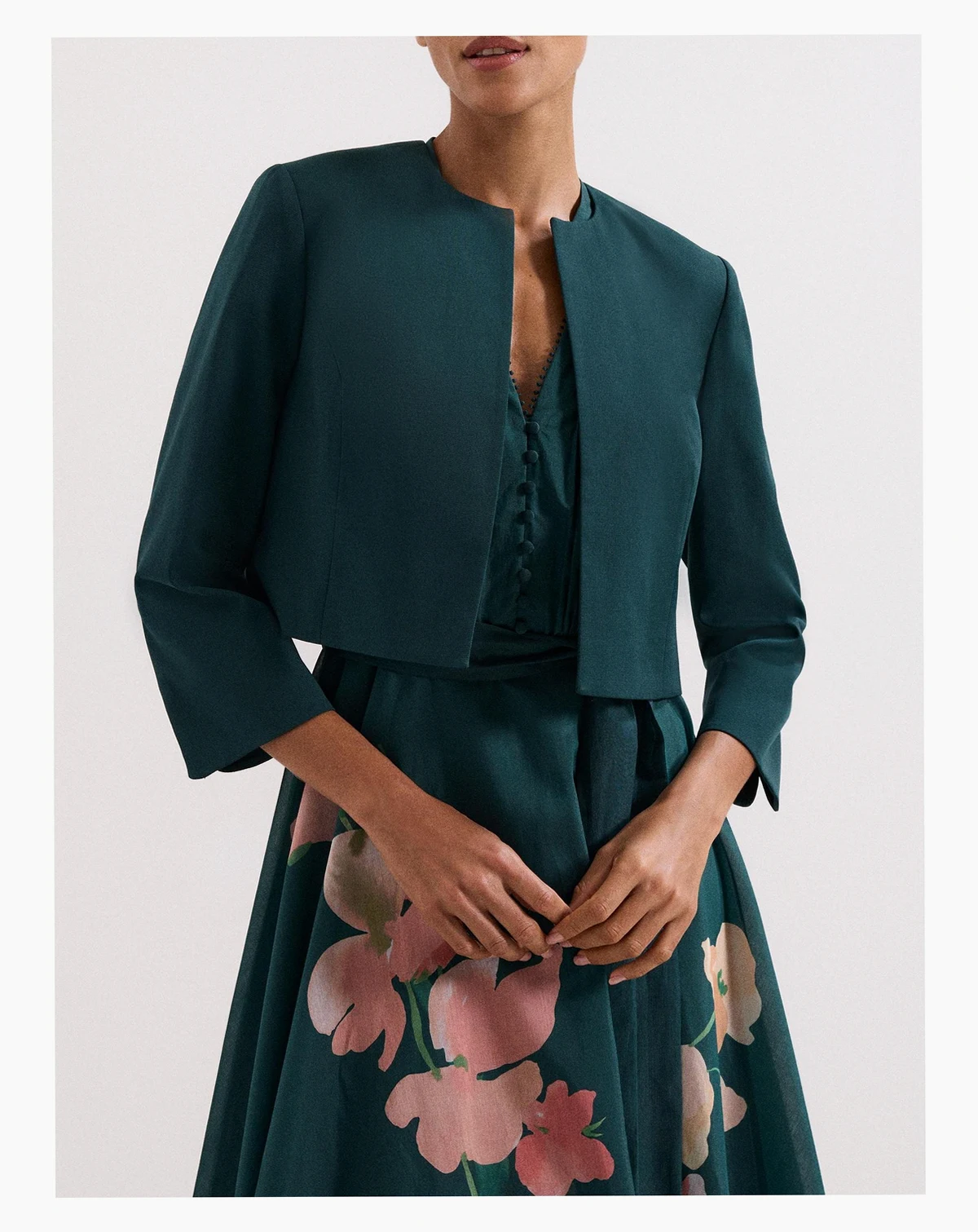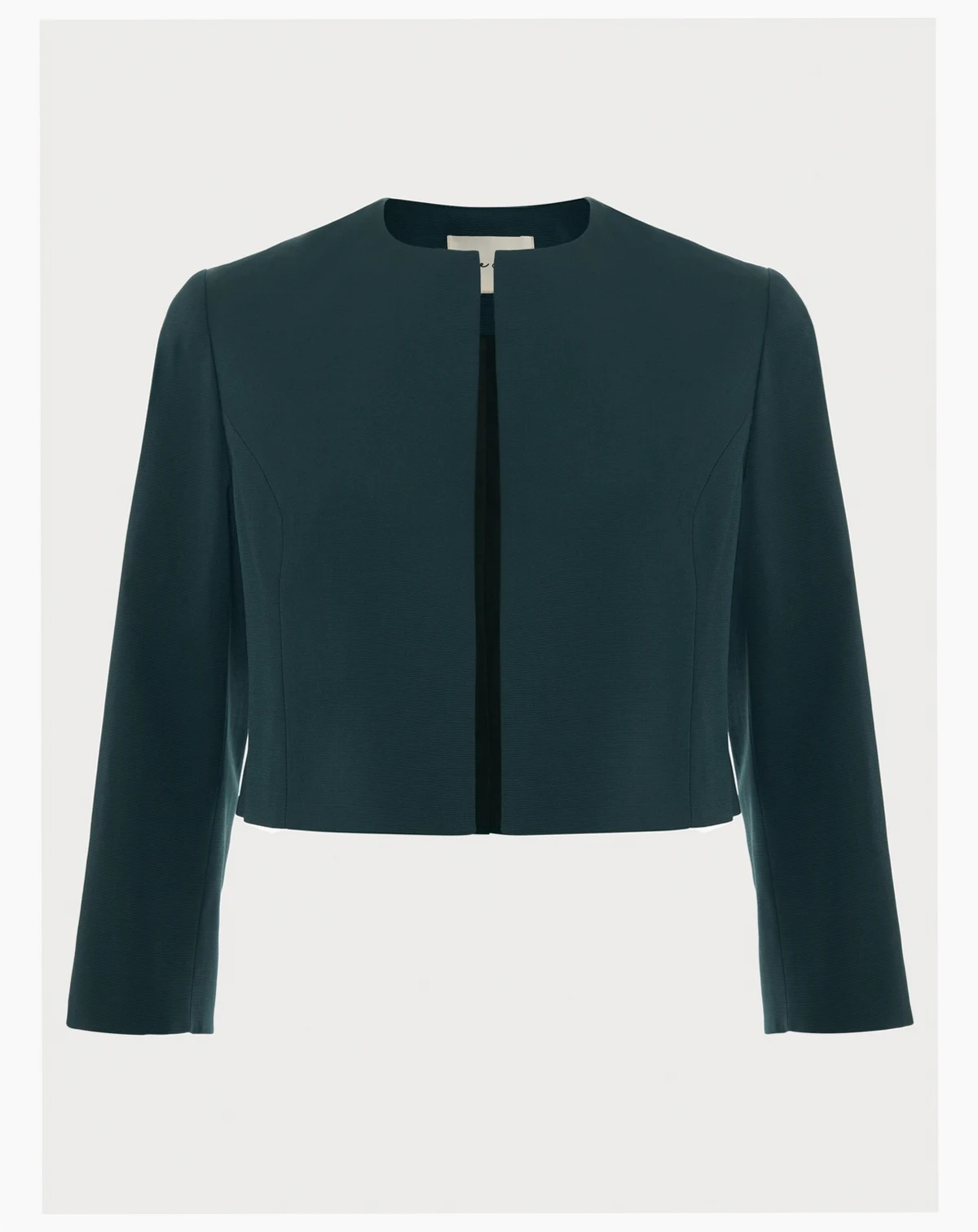 A cropped collarless jacket from Phase Eight. Its regular fit and three quarter sleeves offer comfort and ease, while the round neck keeps your look sharp. Perfect over your favourite dress for any special event.