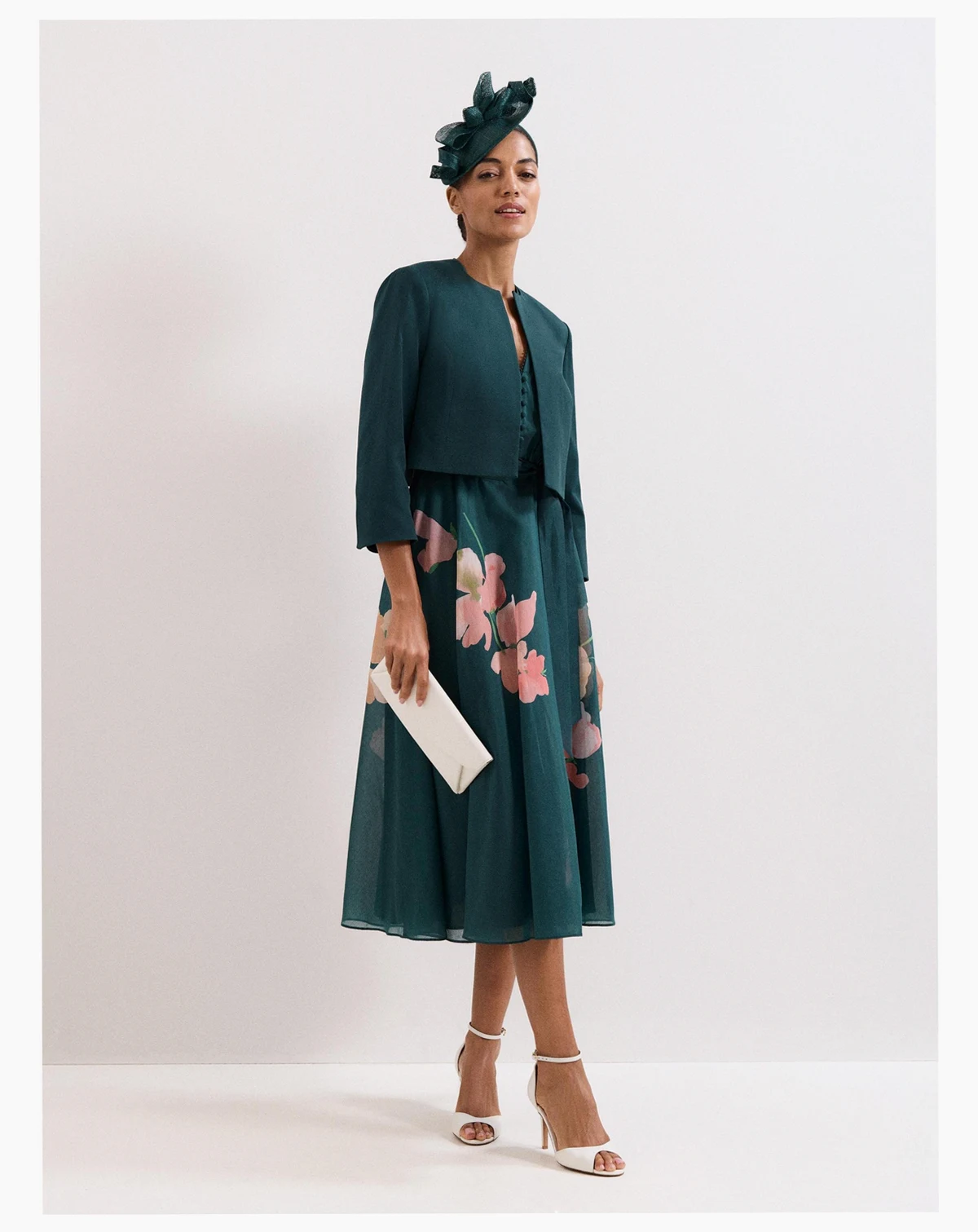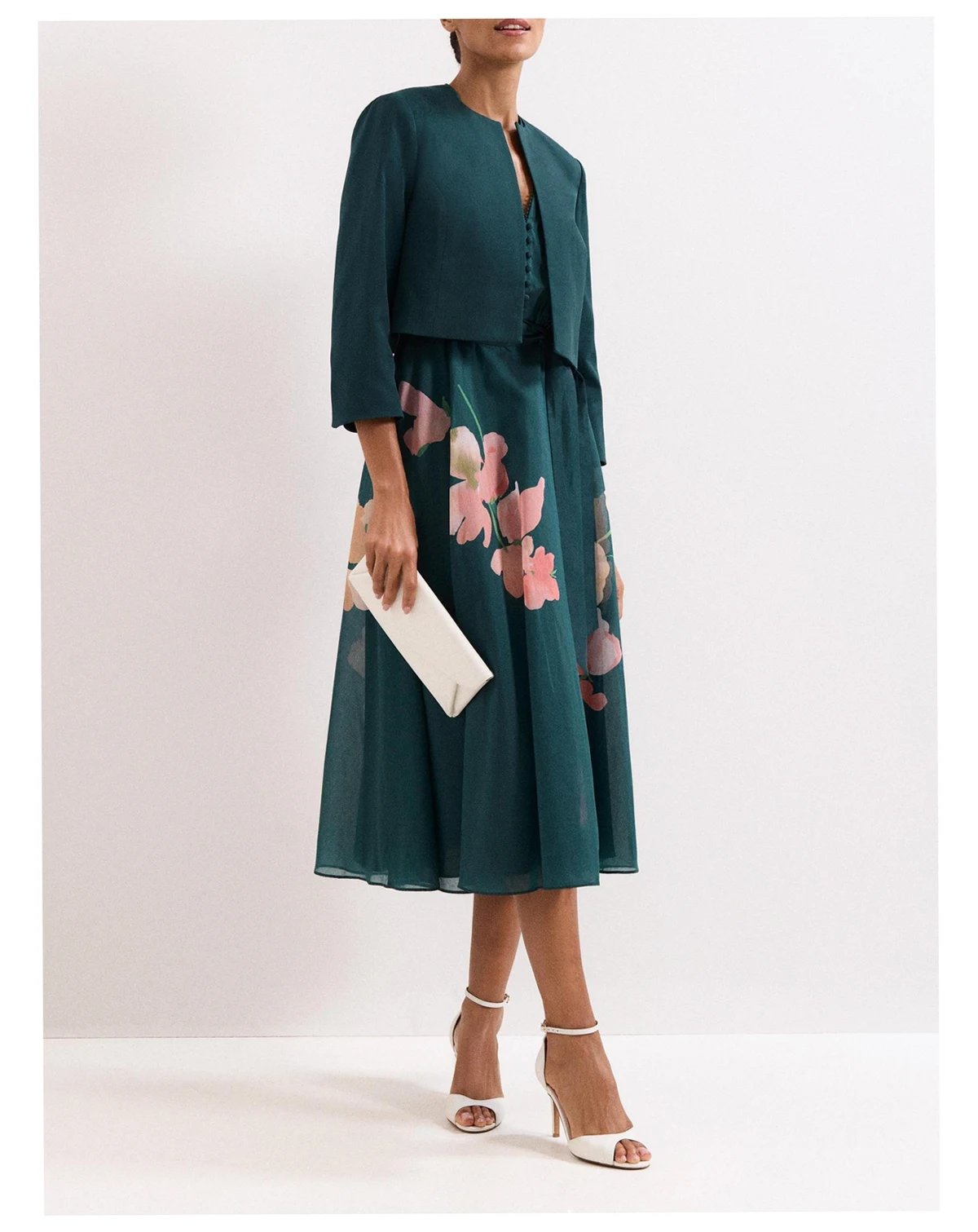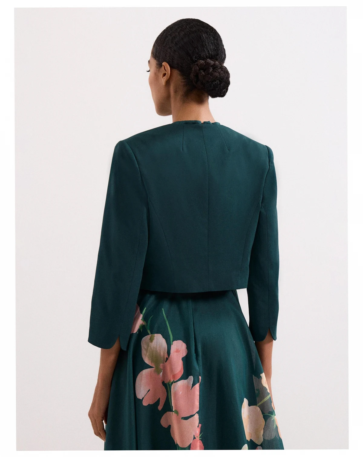 A cropped collarless jacket from Phase Eight. Its regular fit and three quarter sleeves offer comfort and ease, while the round neck keeps your look sharp. Perfect over your favourite dress for any special event.