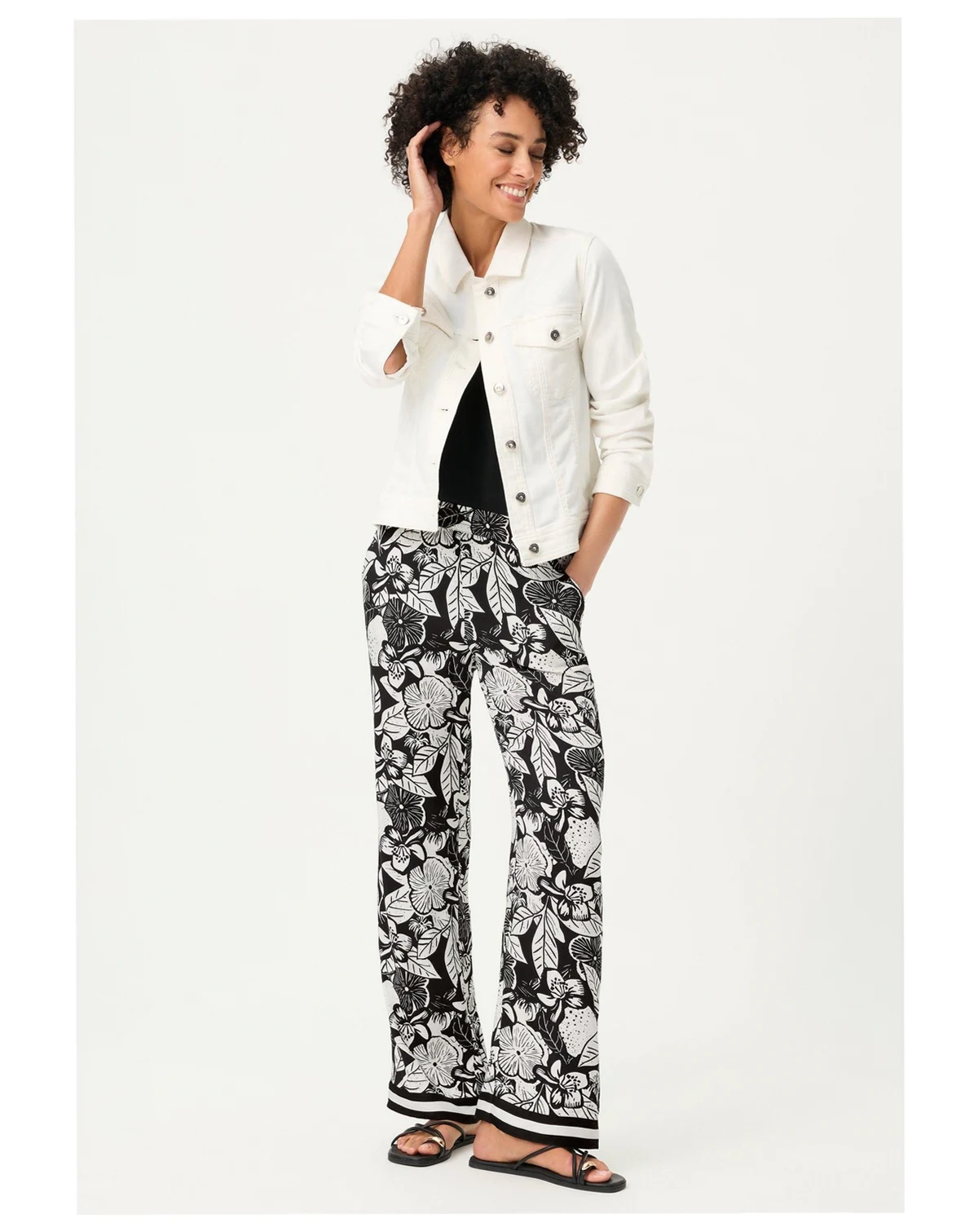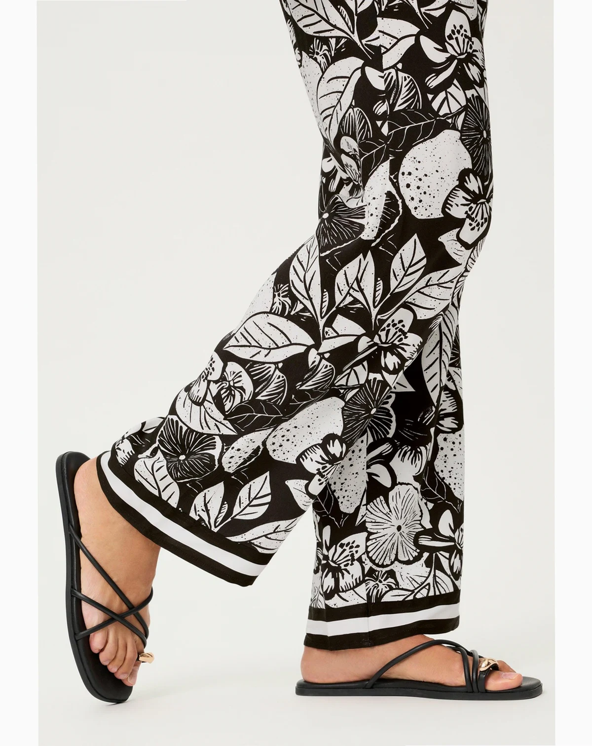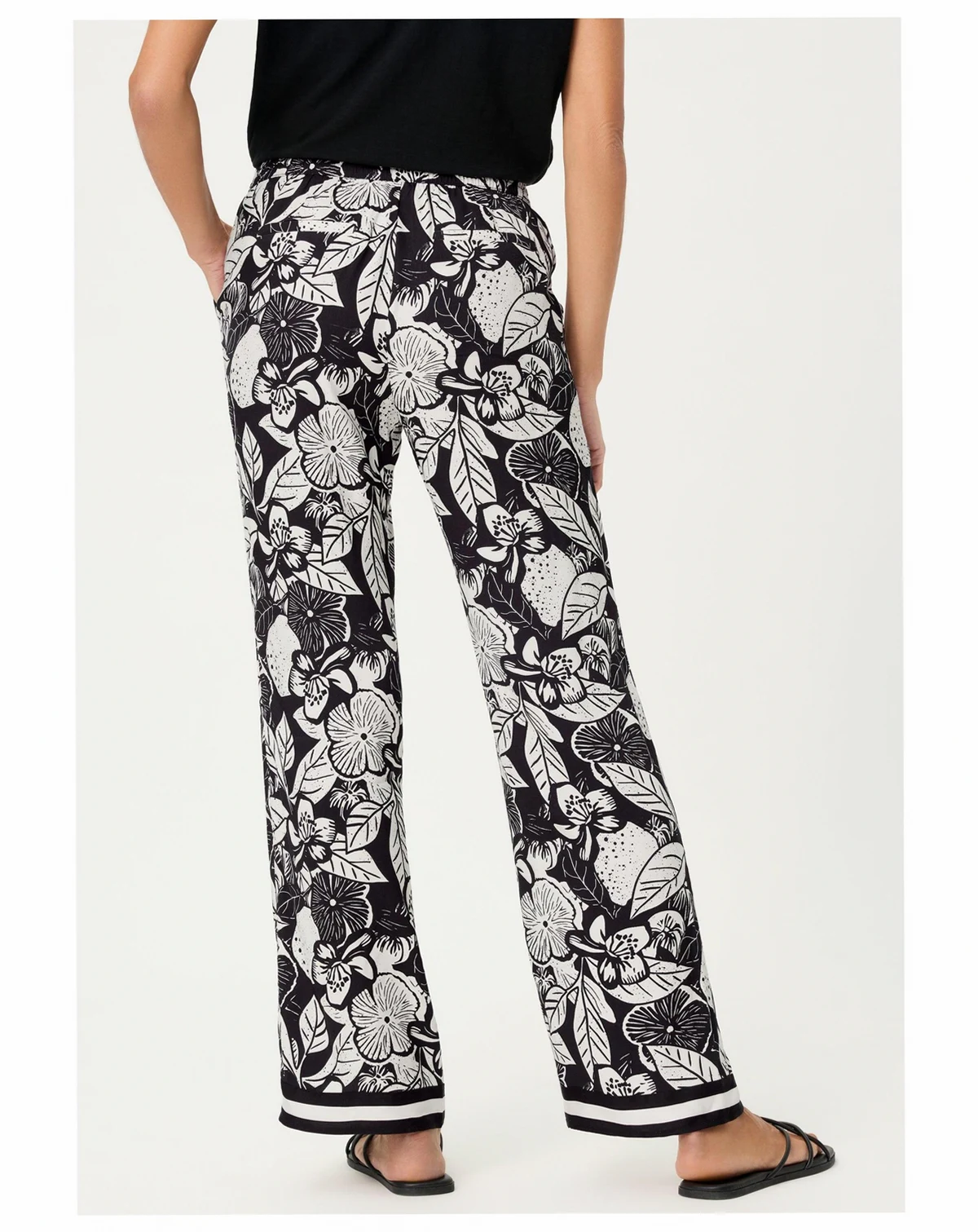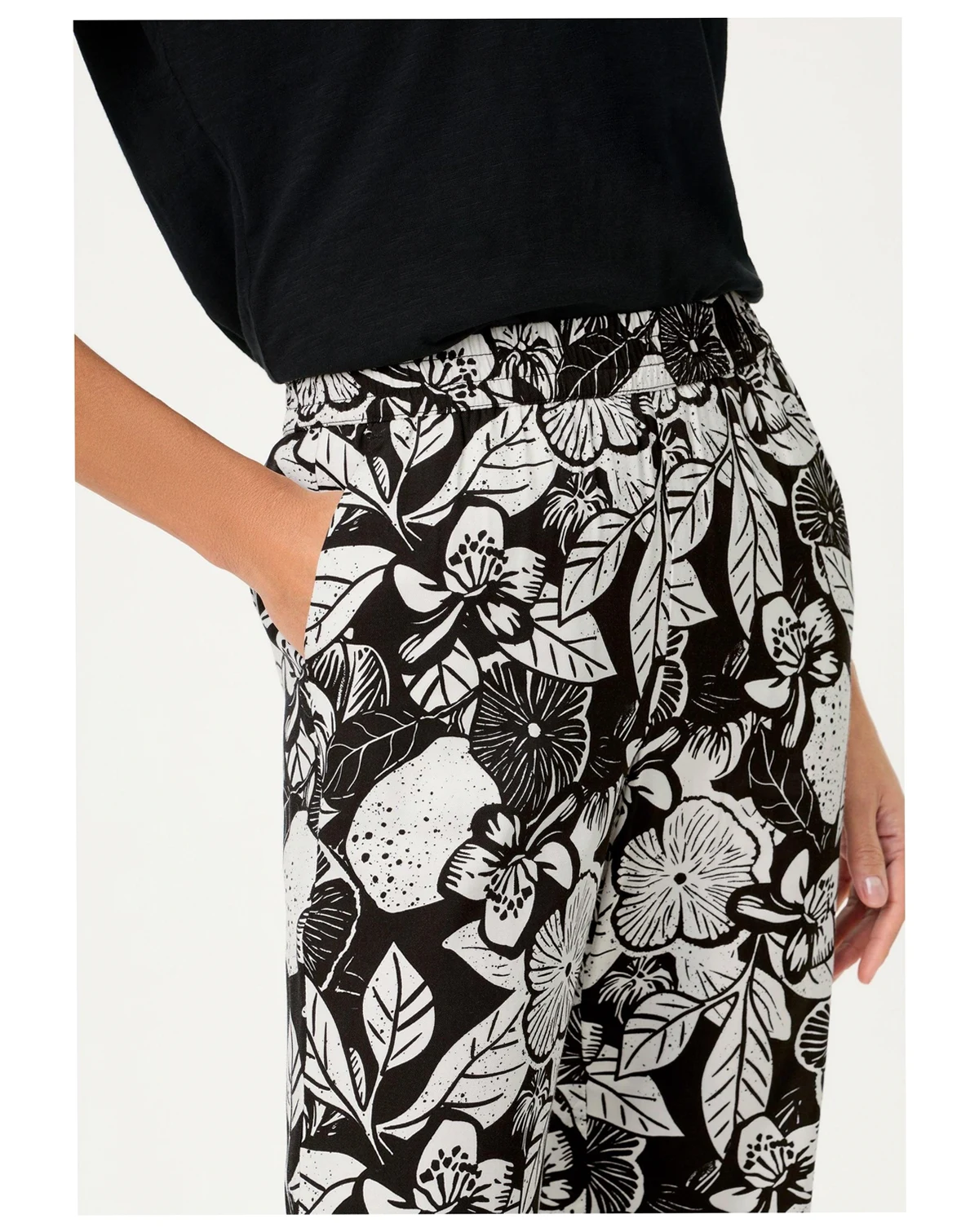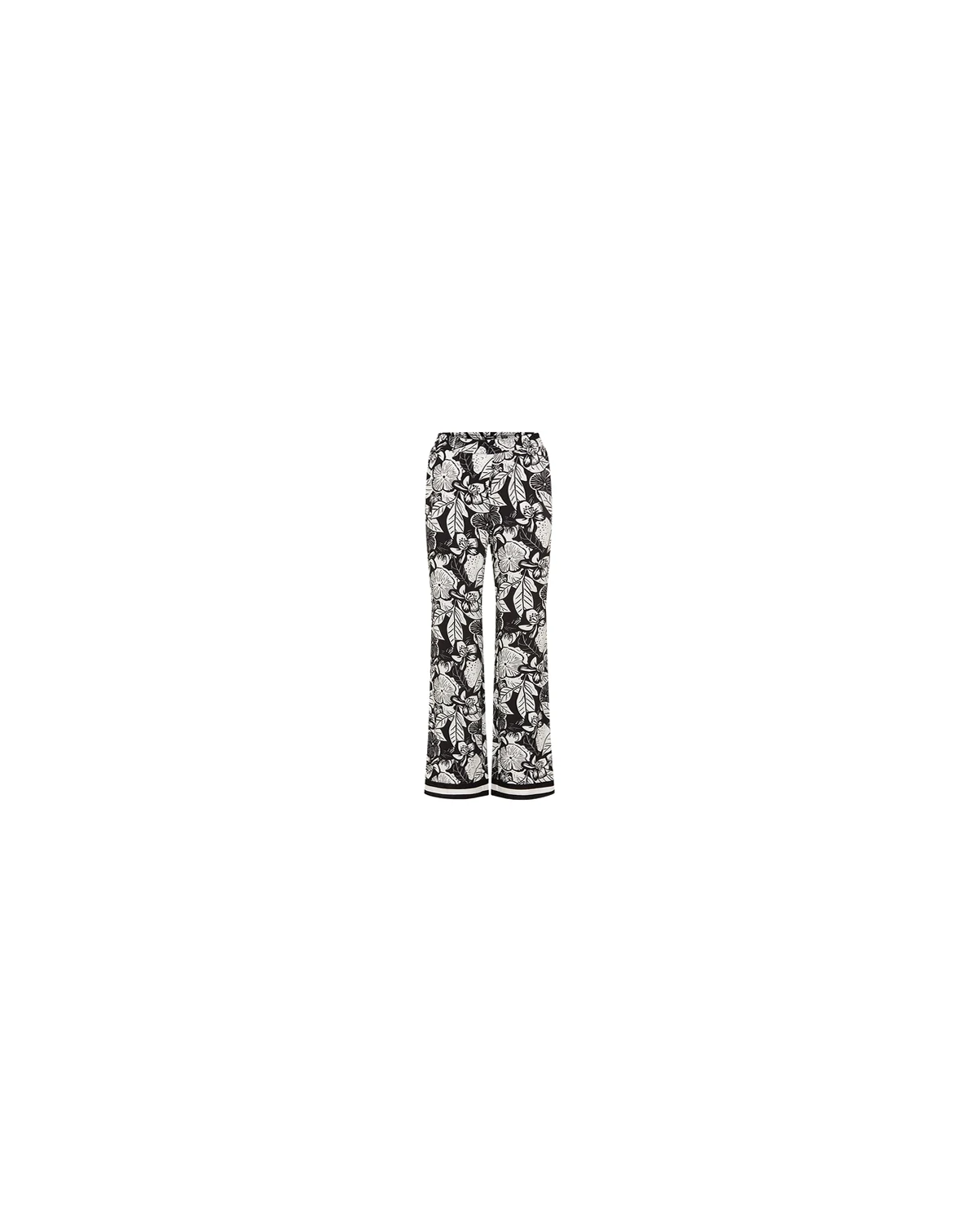 A statement wide-leg trouser designed to turn heads, featuring a bold black-and-off-white floral print with an airy, elegant drape.