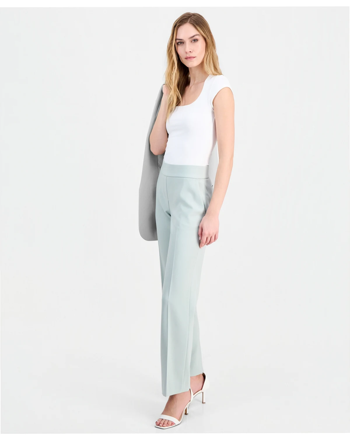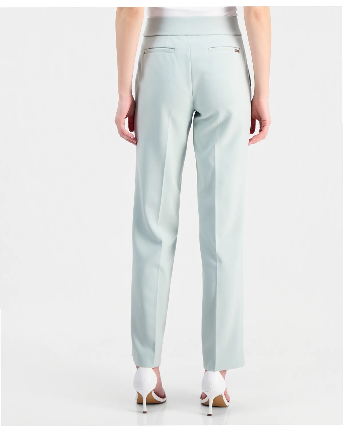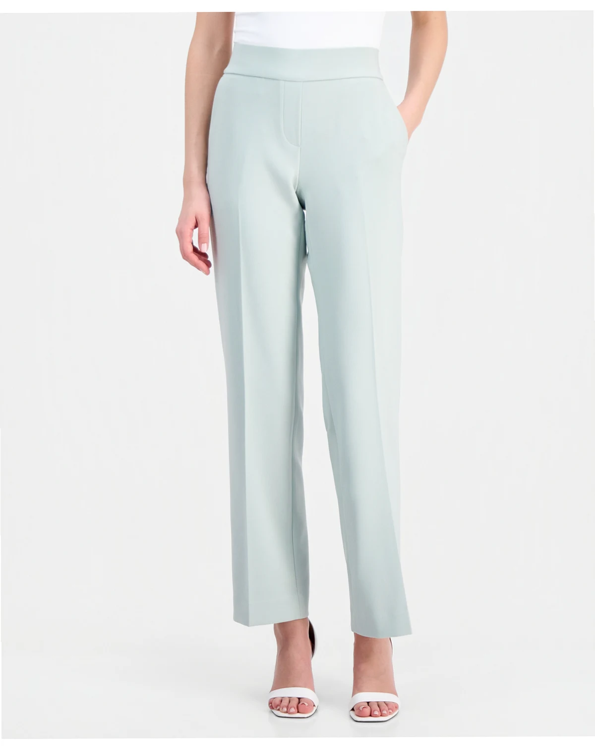 Modern structure meets everyday ease in these Anne Klein pants, featuring a mid-rise waist and leg-openings for balanced proportions. The pull-on styling, without belt loops, creates a sleek finish, while the two front slanted pockets and the back welt pocket provide practical storage with a tailored appeal.