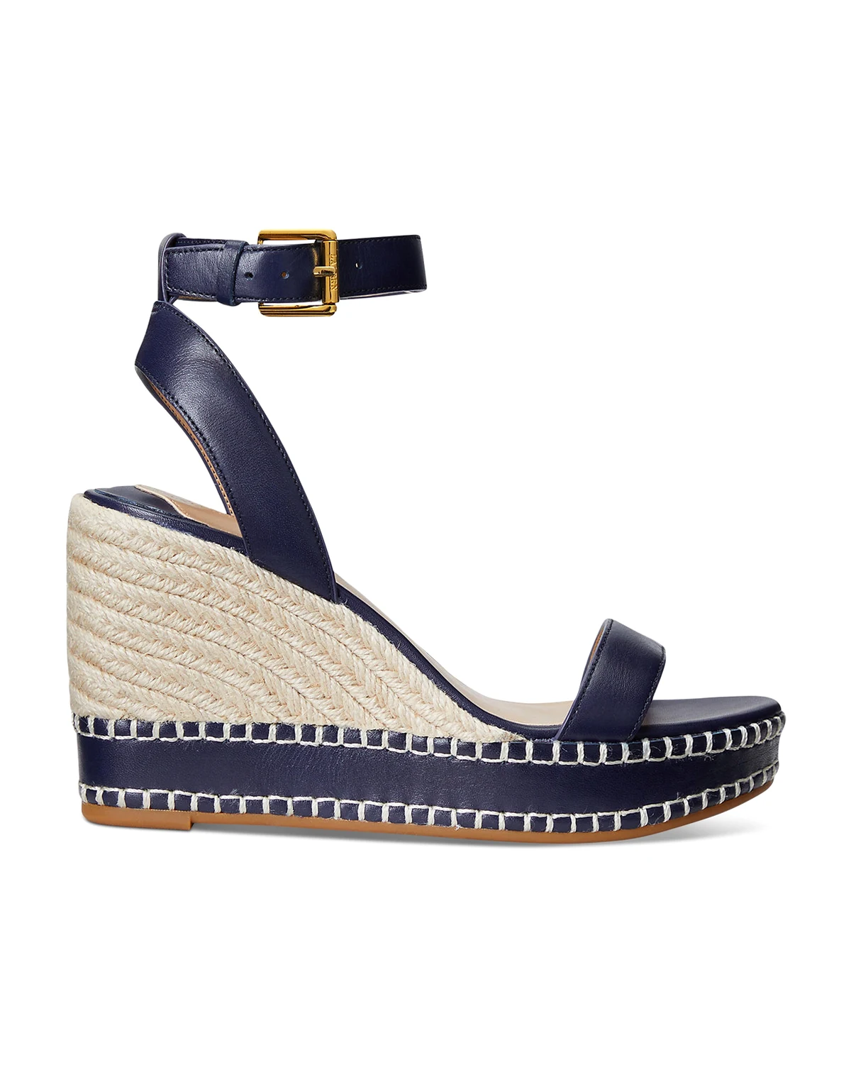 A luxuriously smooth leather or sumptious nappa leather construction offers a refined take on the warm-weather espadrille, which is designed with a signature buckled closure and a jute-wrapped wedge.