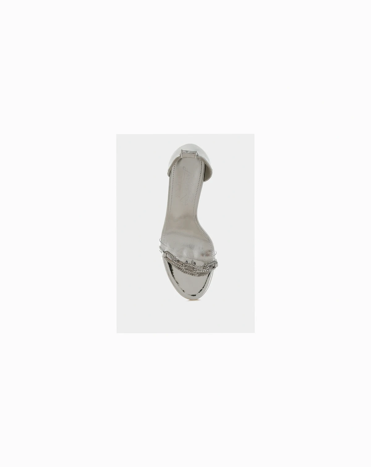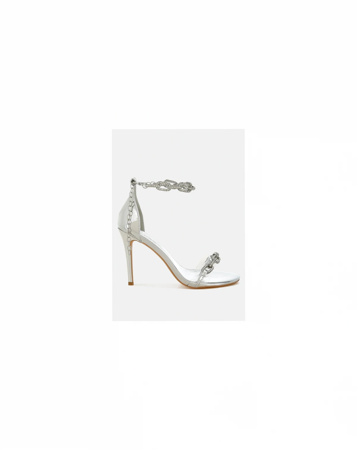 The gorgeous metallic sandals are sure to drop some jaws with their glamorous dazzle. The rhinestones embellished chain detail looks opulent while the stiletto heel adds to the allure. The comfortable cushion insoles cut strain and offer a relaxed fit. Type: Heels Upper Material: Mirrored Faux Leather Outer Sole: TP Rubber Open Round Toe High Stiletto Heel Rhinestones Embellished Chain Anklet Detail Rhinestone Embellished Chain Detail Vamp Plush Cushion Insole Heel Height: 4 inches SH5330