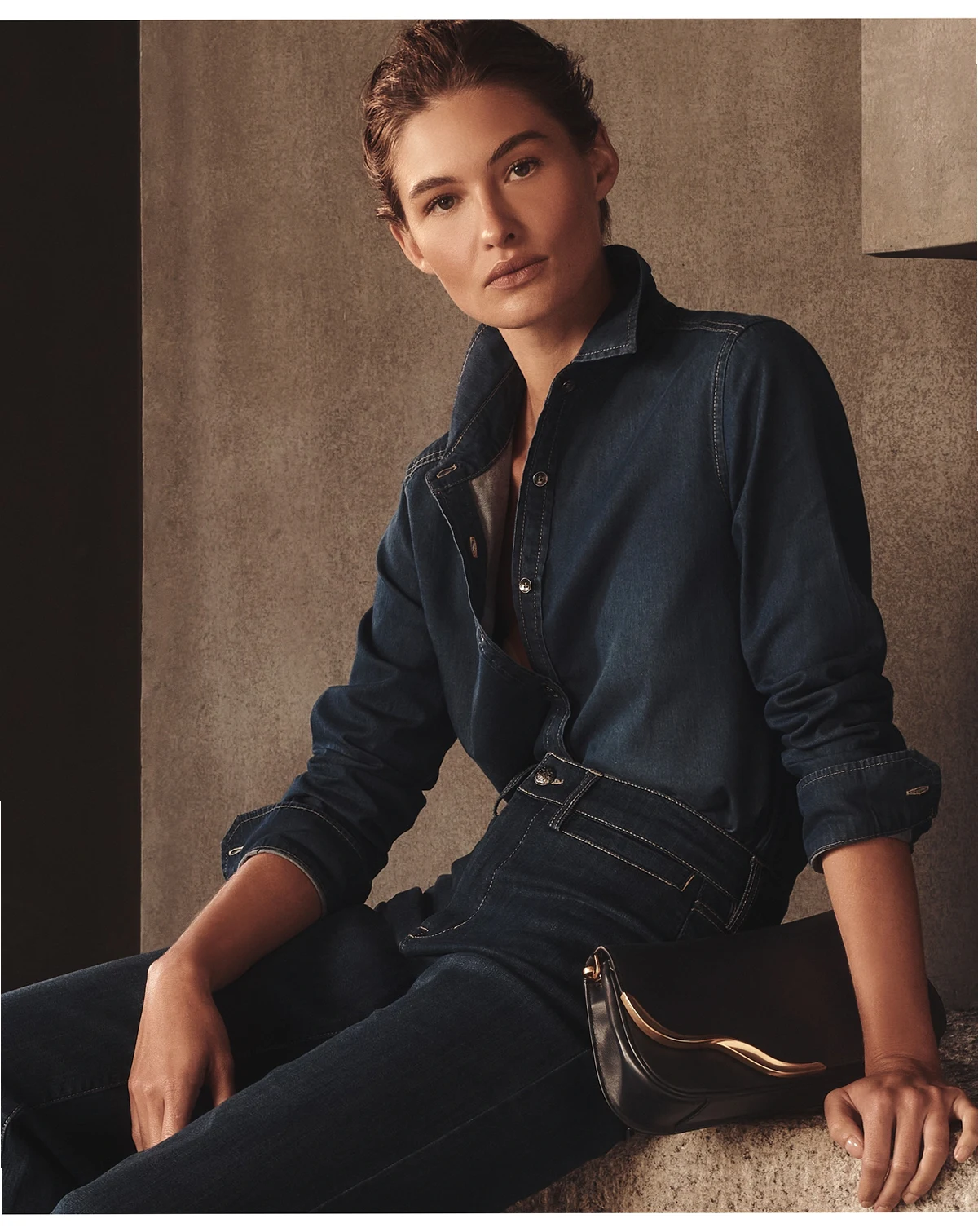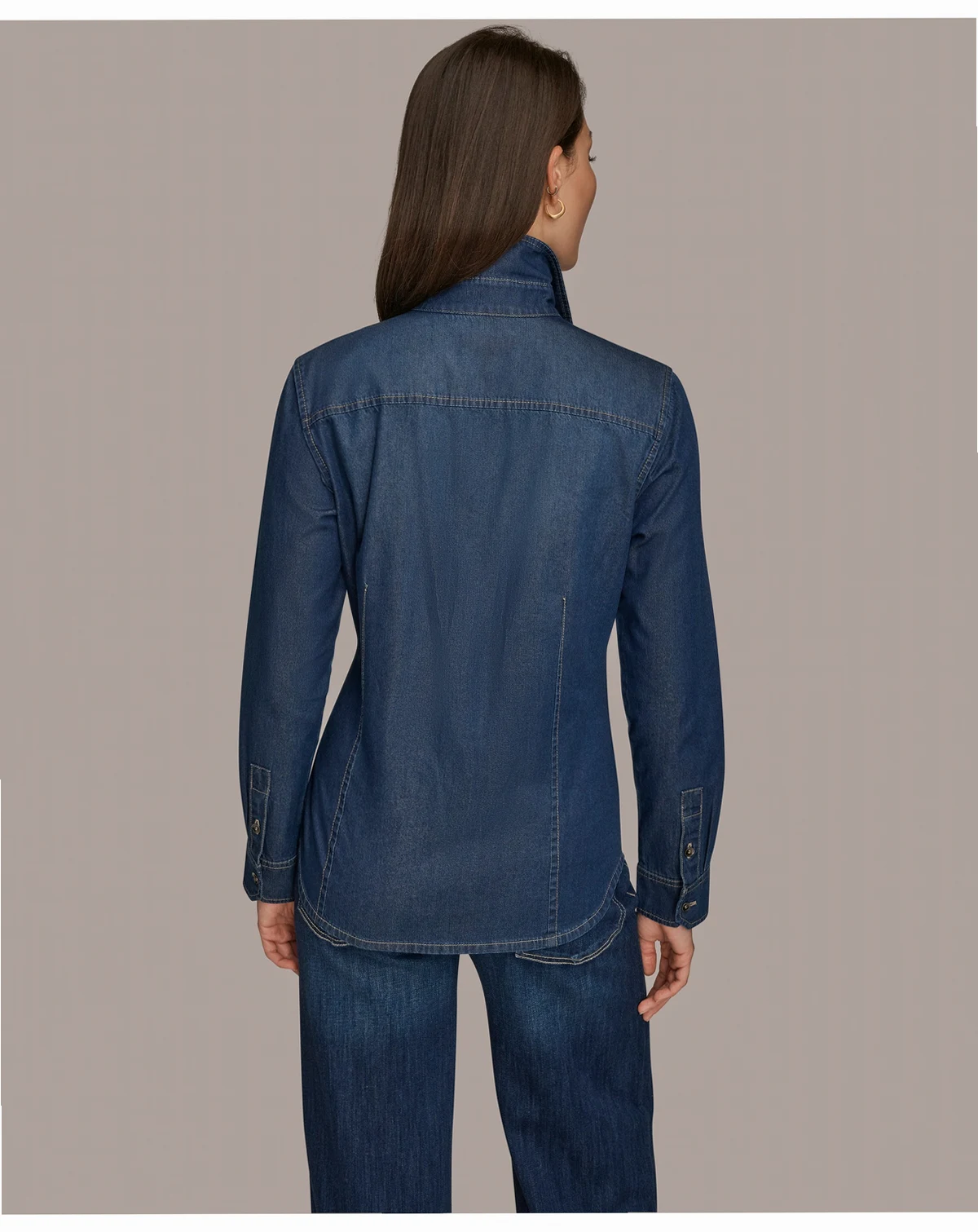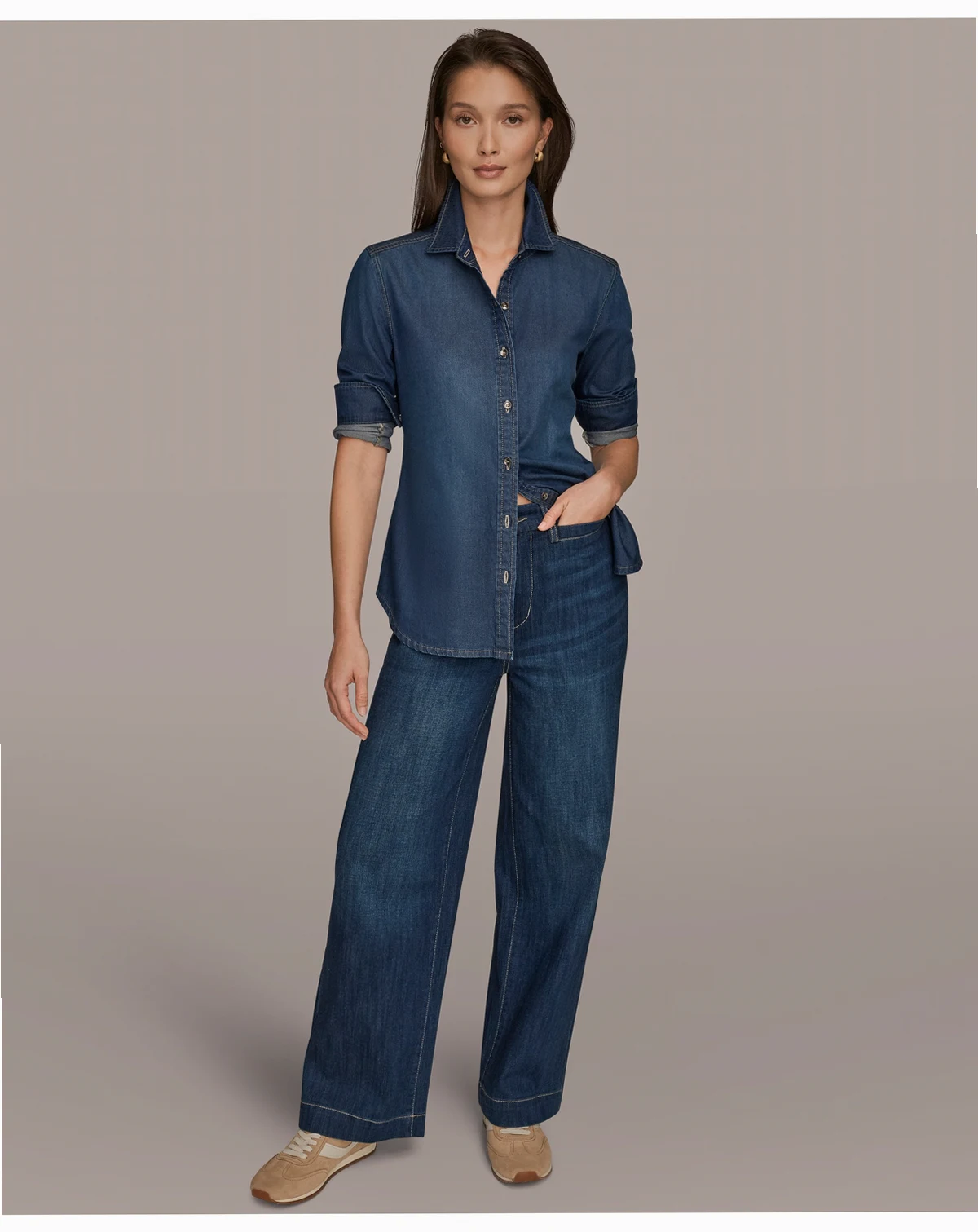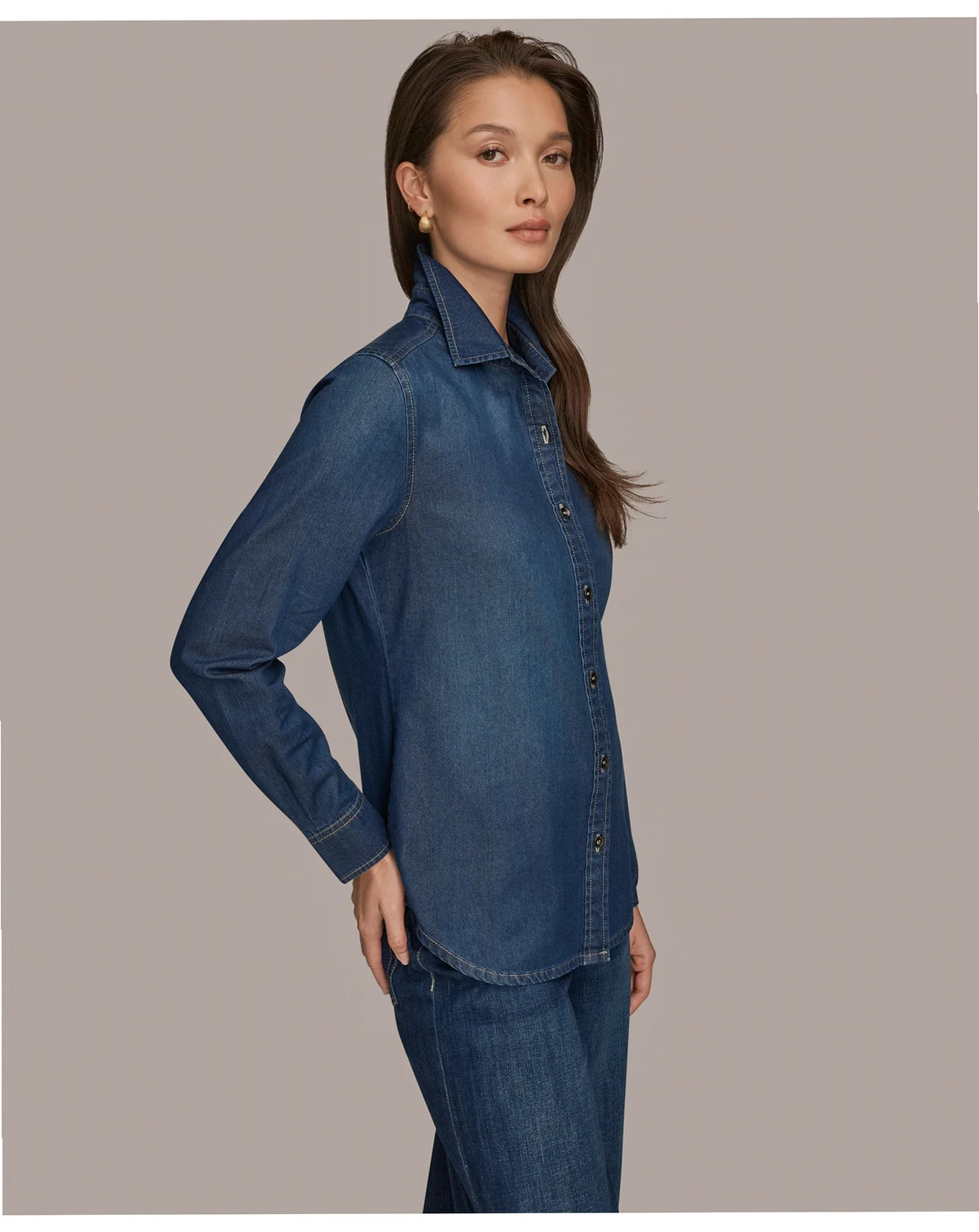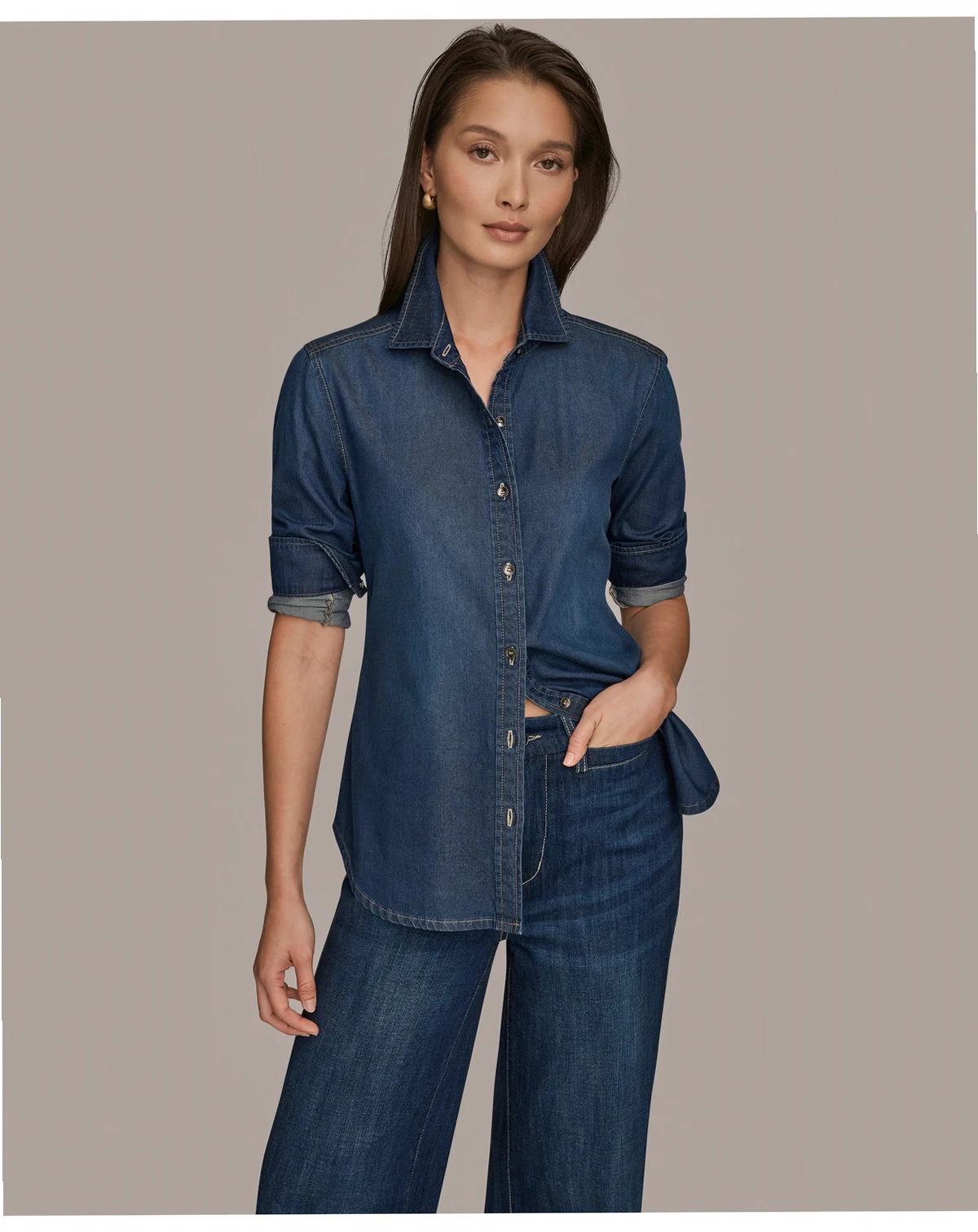 Classic elegance defines the Donna Karan New York Women's Luxe Denim Button Down Denim Shirt, featuring button-front closure, collared neck, and polished denim fabric. Perfect for casual city outings, weekend errands, or holiday layering.