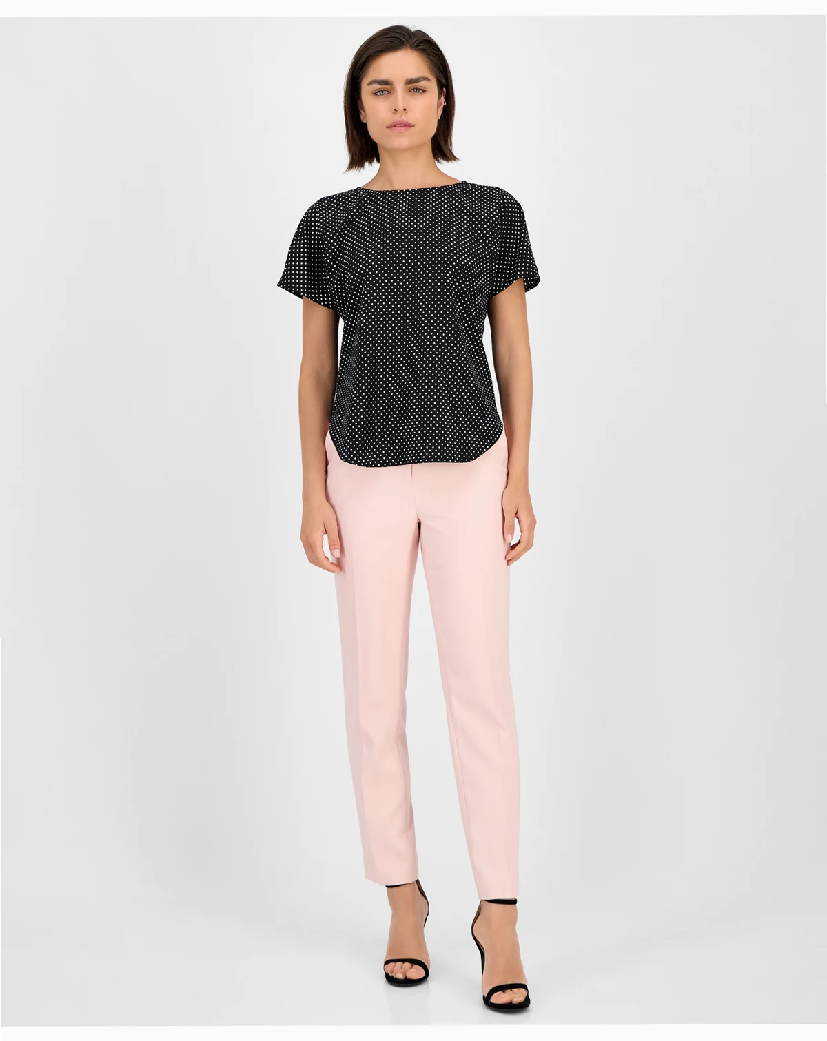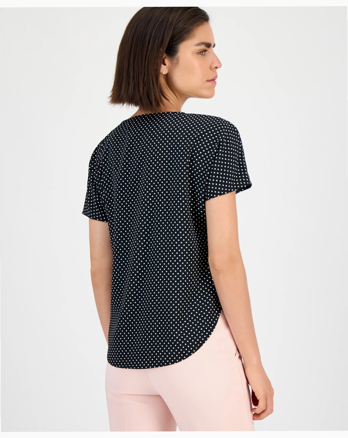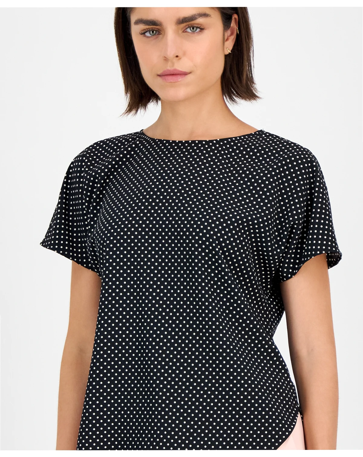 Frame outfits with understated sophistication using this Anne Klein blouse, defined by a sleek bateau neckline and printed crepe fabrication. Short sleeves and a pull-on design create polished ease for day or evening.