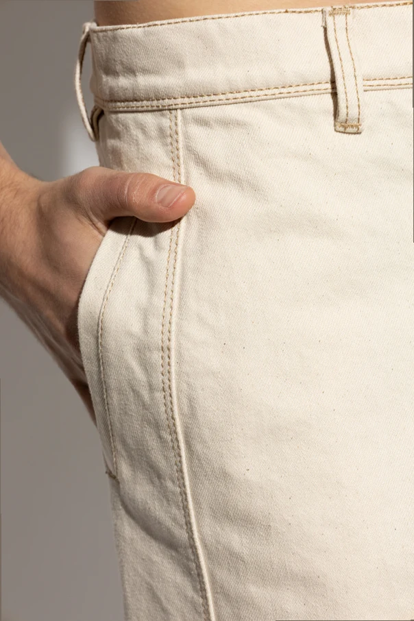 Meticulously finished in a creamy, monochromatic hue, these jeans exude quiet versatility. Signature construction elements include five classic pockets, accentuated by subtle, tonally matched topstitching that gracefully highlights the clean lines and contours. Standard-width belt loops and expertly tailored seams enhance their utilitarian charm while remaining resolutely refined.