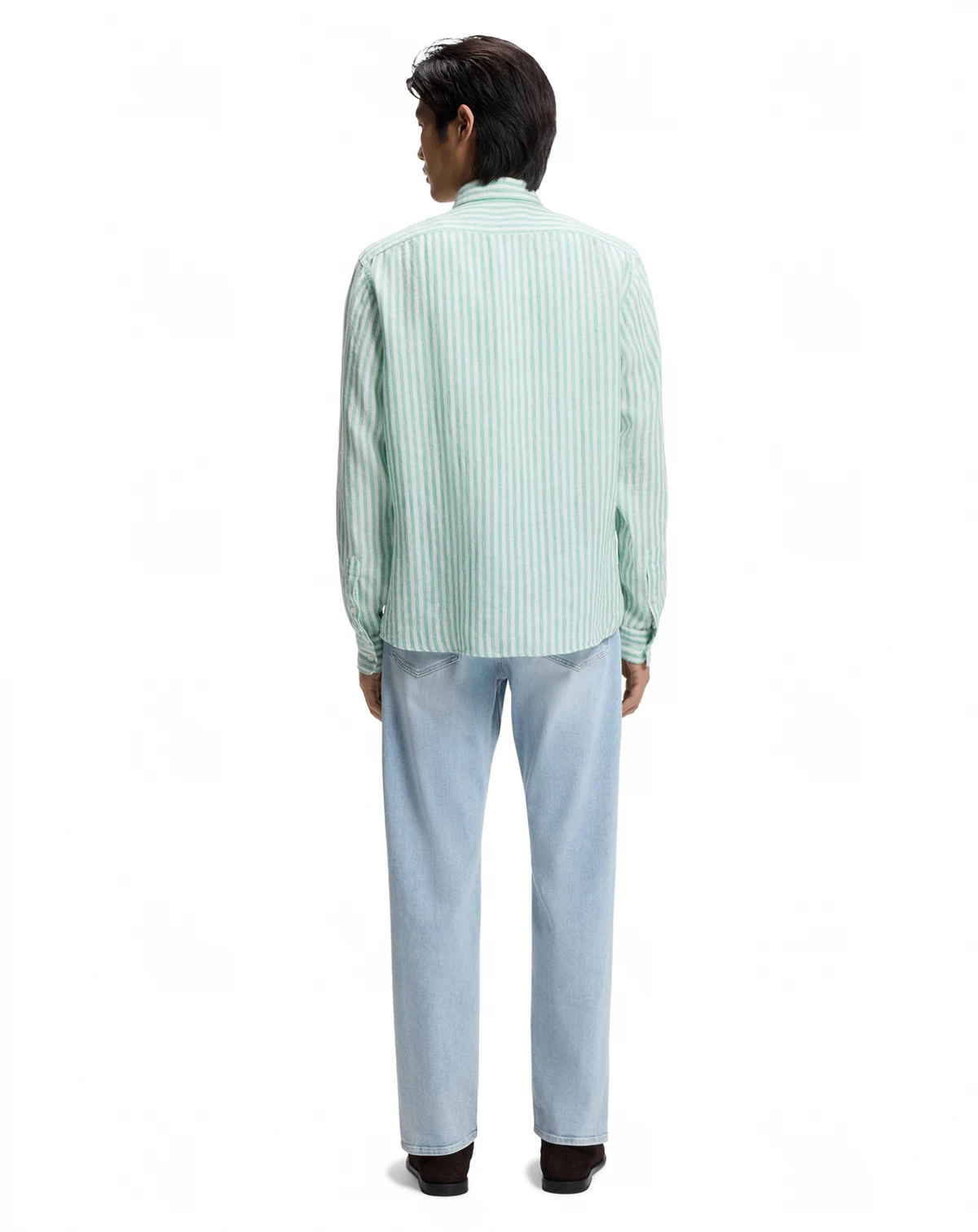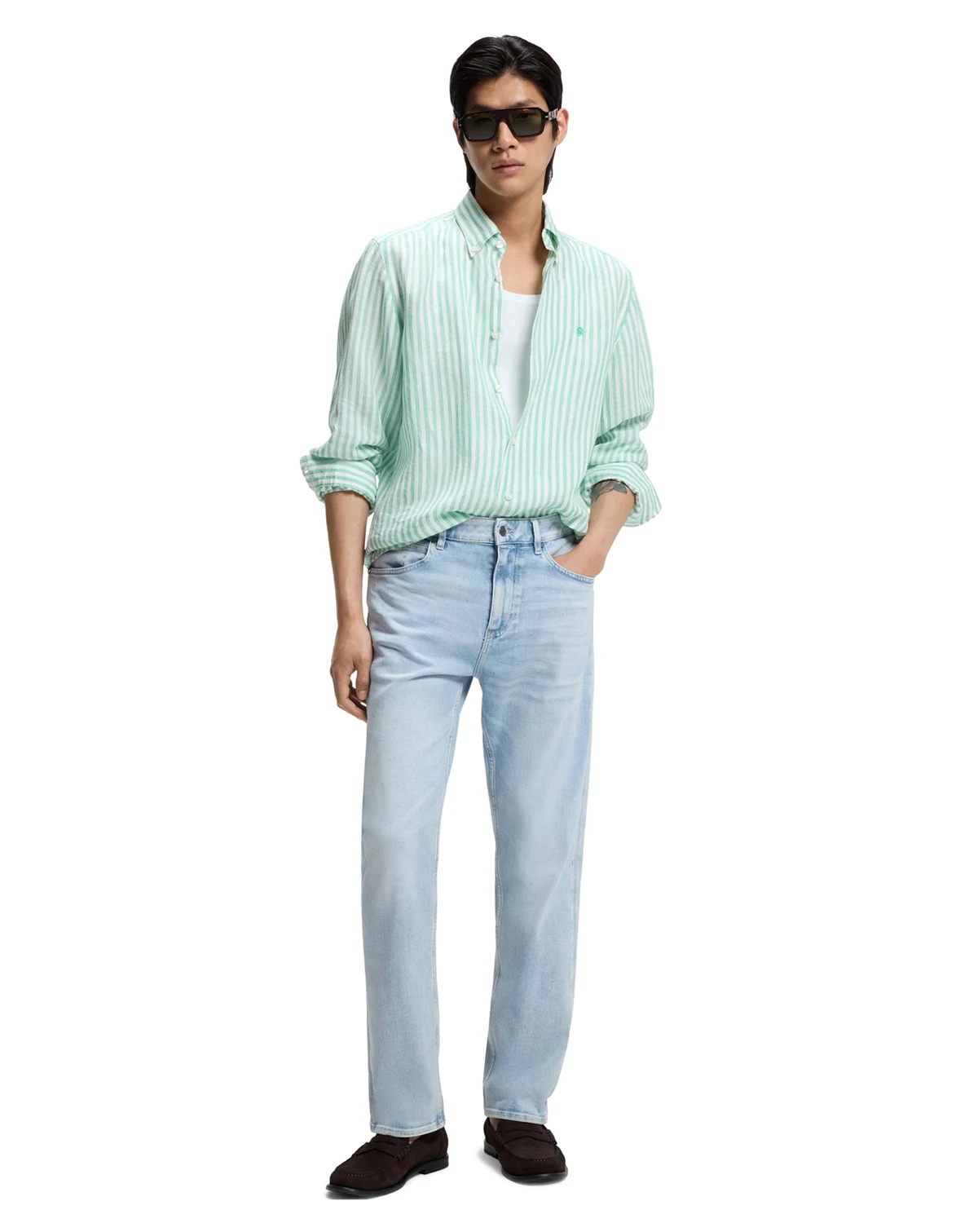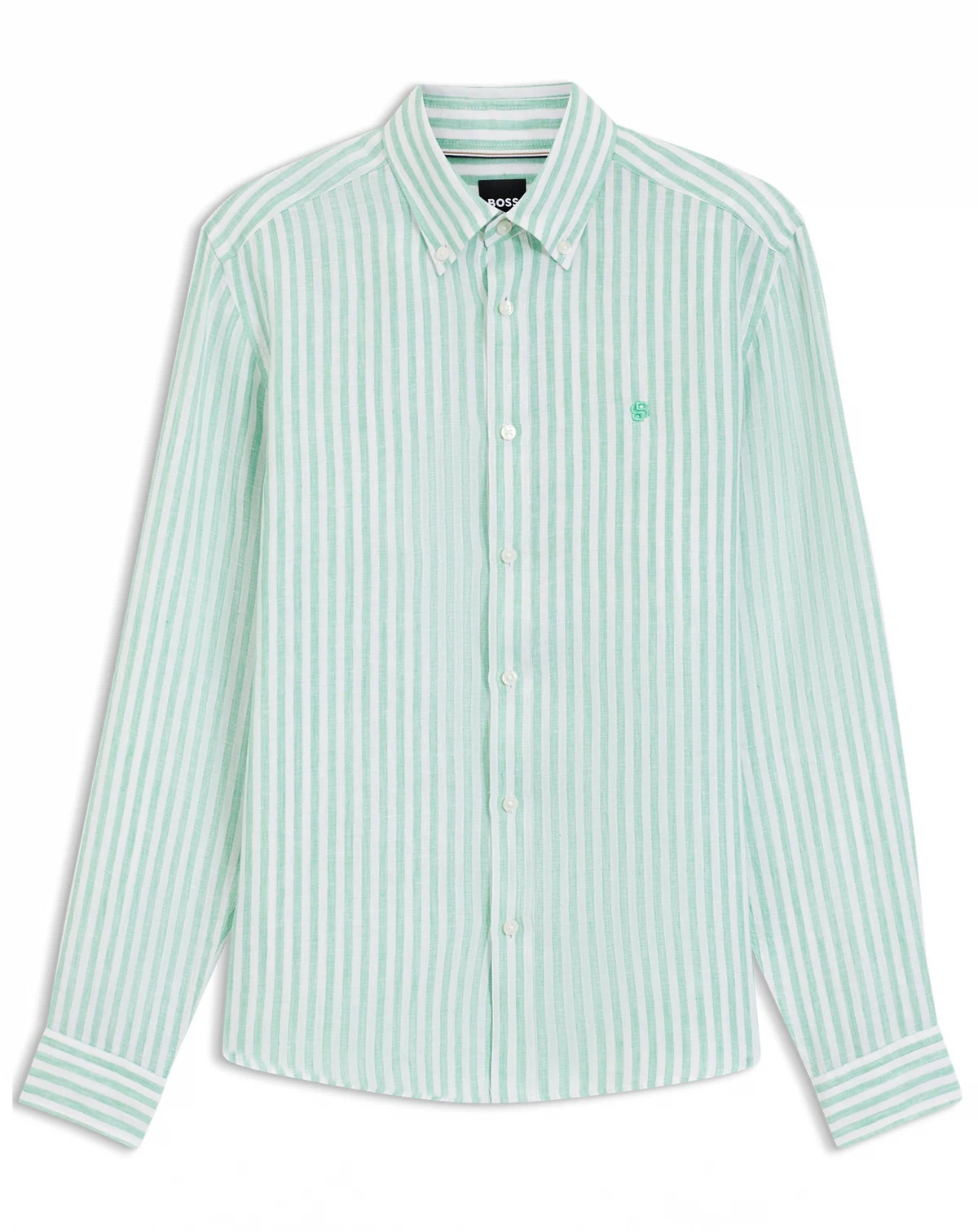 In linen with a bold stripe, this button-down BOSS menswear shirt has a casual regular fit. Embroidered logo at the chest.